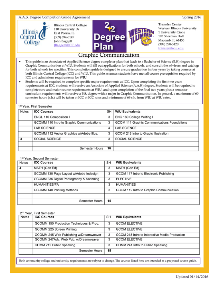 A.A.S. Degree Completion Guide Agreement Spring 2016 Transfer Center Western Illinois University 1 University Circle 103 Sherman Hall Macomb, IL 61455 (309) 298-3120 transfer@wiu.edu Illinois Central College 110 University Dr East Peoria, IL (309) 694-5147 John Baggett JBaggett@ICC.edu Graphic Communication • • This guide is an Associate of Applied Science degree completer plan that leads to a Bachelor of Science (B.S.) degree in Graphic Communication at WIU. Students will fill out applications for both schools, and consult the advisors and catalogs for both schools for specifics. This completion guide is designed to ensure graduation in four years by taking courses at both Illinois Central College (ICC) and WIU. This guide assumes students have met all course prerequisites required by ICC and admissions requirements for WIU. Students will be required to complete specific major requirements at ICC. Upon completing the first two years requirements at ICC, students will receive an Associate of Applied Science (A.A.S.) degree. Students will be required to complete core and major course requirements at WIU, and upon completion of the final two years plus a semester curriculum requirements will receive a B.S. degree with a major in Graphic Communication. In general, a maximum of 60 semester hours (s.h.) will be taken at ICC at ICC rates and minimum of 69 s.h. from WIU at WIU rates. 1st Year, First Semester Notes 3 ICC Courses SH ENGL 110 Composition I 3 ENG 180 College Writing I GCOMM 110 Intro to Graphic Communications 3 GCOM 111 Graphic Communications Foundations LAB SCIENCE 4 LAB SCIENCE GCOMM 112 Vector Graphics w/Adobe Illus. 3 GCOM 213 Intro to Grapic Illustration SOCIAL SCIENCE 3 SOCIAL SCIENCE Semester Hours 1st Year, Second Semester ICC Courses Notes 4 WIU Equivalents 16 SH WIU Equivalents MATH (Gen Ed) 3 MATH (Gen Ed) GCOMM 130 Page Layout w/Adobe Indesign 3 GCOM 117 Intro to Electronic Publishing GCOMM 235 Digital Photography & Scanning 3 ELECTIVE HUMANITIES/FA 3 HUMANITIES GCOMM 140 Printing Methods 3 GCOM 112 Intro to Graphic Communication Semester Hours 2nd Year, First Semester ICC Courses Notes 15 SH WIU Equivalents GCOMM 150 Production Techniques & Proc. 3 GCOM ELECTIVE GCOMM 225 Screen Printing 3 GCOM ELECTIVE GCOMM 245 Web Publishing w/Dreamweaver GCOMM 247Adv. Web Pub. w/Dreamweaver 3 3 GCOM 218 Intro to Interactive Media Production GCOM ELECTIVE COMM 212 Public Speaking 3 COMM 241 Intro to Public Speaking Semester Hours 15 Both community college and university requirements are subject to change. The courses listed here are intended as a projected course guide. Updated 01/14/2016 ; 2nd Year, Second Semester ICC Courses Notes GCOMM 248 Modeling & Animation with Maya 3 WIU Equivalents ELECTIVE 3 GCOM 212 Into to Digital Image Manipulation SH GCOMM 250 Beginning Photoshop Techniques GCOMM 230 Adv. Page Layout & Cross Media 3 Social Science elective 3 GCOMM 251 Advanced Photoshop Techniques 3 GCOM 417 (granted as lower division credit) Advanced Electronic Publishing SOCIAL SCIENCE GCOM 412 (granted as lower division credit) Advanced Digital Image Manipulation 15 Semester Hours Notes for ICC: 1. A cumulative grade point average (GPA) of 2.0 on a 4.0 scale is required; 2. A “C” grade or higher is required in order for transfer students to receive general education credit for a writing course; 3. Class fulfills History and International Awareness requirements; 4. Additional math prerequisites may be required based on student’s Math/Algebra placement scores. Students would be required to complete these pre-requisite classes with a grade of C or higher. Courses below college level will not apply toward graduation; 5. To fulfill this degree, students should consult a faculty advisor from their area of interest for suggestions regarding course selection from their specific Area of Concentration (a minimum of 12 hours in Area of Concentration is required). • A working knowledge and understanding of computer literacy is required. See your advisor for requirements. WIU Suggested Course Sequence 3rd Year, Second Semester 3rd Year, First Semester Notes WIU Courses Notes SH GCOM 316 Production Printing 3 GCOM 318 Intermediate Interactive Media Production ENG 280 College Writing II 3 CS 114 Intro to Computer Science ACCT 200 or 201 Intro to Acct or Princ of Accounting Semester Hours 3 3 6 15 WIU Courses 3 Hum/FA Elective 3 MC/FLGI GCOM 413 Packaging & Display Technologies GCOM 414Advance Image Trasnfer and Printing Proc. ECON 231 or 232 (Soc. Sci.) 3 Select from Other Human Well Being Semester Hours 3 2 14 3 3 3 3 3 Semester Hours 15 WIU Courses GCOM 415 Printing Production Management GCOM 419 Advanced Interactive Media Production GCOM 423 Advanced Graphic Illustration Hum/FA Elective Select from Other Human Well Being Semester Hours SH 3 4th Year, Second Semester Notes SH SH GCOM 314 3D Print & Web Technologies GCOM 320 Professional Preparation in Graphic Communication ENG 381 Technical Comm 3 4th Year, First Semester Notes WIU Courses 3 3 3 3 1 16 3rd or 4th Year, Summer Term Notes WIU Courses GCOM 493 Internship Semester Hours SH 9 9 TOTAL B.S. DEGREE HOURS AT WIU/ICC WIU/ICC- 69/60 – (129) Notes for WIU: 6. Consult with your WIU academic advisor concerning options pertaining to the WIU Foreign Language/Global Issues requirement; 7. Students must complete 60 hours from a four (4) year institution; 8. Students must have a 2.0 cumulative and major GPA to meet minimum graduation requirements. *This guide is not intended to be a contract with WIU. The information on this guide is subject to change; courses are not guaranteed. Students are advised to contact WIU to keep informed of changes. Updated 01/14/2016
