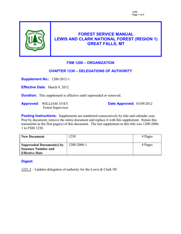 1230 Page 1 of 4 FOREST SERVICE MANUAL LEWIS AND CLARK NATIONAL FOREST (REGION 1) GREAT FALLS, MT FSM 1200 – ORGANIZATION CHAPTER 1230 – DELEGATIONS OF AUTHORITY Supplement No.: 1200-2012-1 Effective Date: March 9, 2012 Duration: This supplement is effective until superseded or removed. Approved: WILLIAM AVEY Forest Supervisor Date Approved: 03/09/2012 Posting Instructions: Supplements are numbered consecutively by title and calendar year. Post by document; remove the entire document and replace it with this supplement. Retain this transmittal as the first page(s) of this document. The last supplement to this title was 1200-20061 to FSM 1230. New Document 1230 4 Pages Superseded Document(s) by Issuance Number and Effective Date 1200-2006-1 4 Pages Digest: 1231.3 – Updates delegation of authority for the Lewis & Clark NF. LEWIS AND CLARK NF SUPPLEMENT 1200-2012-1 EFFECTIVE DATE: xx/xx/xxx DURATION: This supplement is effective until superseded or removed. 1230 Page 2 of 4 FSM 1200 - ORGANIZATION CHAPTER 30 – DELEGATIONS OF AUTHORITY 1231.3 – ACTING AUTHORITY 1. Acting Forest Supervisor In the absence of the Forest Supervisor, the following Staff Officers will serve as Acting for the month specified. The acting delegation assumes all signing authority as outlined in FSM 1236.43 L&CNF Supplement. Shared Forest Operations Staff Officer Forest Public Affairs Officers Shared Forest Planning/Budget Staff Officer Shared Forest Fire Management Staff Officer Shared Forest Resource Staff Officer Jan.(L&C)/Apr.(HNF)/ Jul.(HNF)/Sep.(L&C) Feb./May/Aug./Nov.(each for their respective forest) Mar.(L&C)/Jun.(HNF)/Oct.(HNF)/Dec.(L&C) Mar.(HNF)/Jun.(L&C)/Oct.(L&C)Dec.(HNF) Jan.(HNF)/Apr.(L&C)/Jul.(L&C)/Sep.(HNF) Should the Acting be absent during the designated month, the staff officer or Public Affairs Officer for the next month will be Acting. Should that person be absent, the next person serves. 2. Acting Staff Officer It is the responsibility of each Staff Officer to designate, in writing, an Acting for their functional area of responsibility during their absence. This designation must indicate whether any or all of their signing authority as outlined in FSM 1236.43 L&CNF Supplement in included. Periods of time for acting assignments are at the discretion of the individual Staff Officer. 3. District Rangers/Center Director District Rangers and Center Director shall establish similar acting procedures to provide for continuity of authority in their absence to be effected, as necessary, by memorandum. LEWIS AND CLARK NF SUPPLEMENT 1200-2012-1 EFFECTIVE DATE: xx/xx/xxx DURATION: This supplement is effective until superseded or removed. 1230 Page 3 of 4 FSM 1200 - ORGANIZATION CHAPTER 30 – DELEGATIONS OF AUTHORITY 1236 – DELEGATIONS OF AUTHORITY TO FIELD POSITIONS 1236.4 – National Forests 1236.41 – Forest Supervisors 1236.43 – National Forest Signing Authorities Correspondence will be signed by the Forest Supervisor, Deputy Forest Supervisor or Acting Forest Supervisor. 1. Forest Supervisor a. Documents involving new Forest policy or program direction, line decisions, requests requiring action and major changes in established policy. b. Transmittal letters for management reviews. c. Letters of acknowledgement or replies to members of Congress. d. Letters to associations or organizations when personal attention will best serve the public needs. e. Grazing permits and special use permits as delegated by the Regional Forester. f. Decisions on appeals under Title 36 CFR 251 and correspondence to the Appeals Deciding Officer. g. Agreements and Memorandums of Understanding with state agencies, association or individuals. h. Directives material including Forest Supplements. i. All correspondence or material crossing lines of authority. j. Correspondence to other Federal agencies, Indian tribal governments, state and local governments and other Forest Service Regions. LEWIS AND CLARK NF SUPPLEMENT 1200-2012-1 EFFECTIVE DATE: xx/xx/xxx DURATION: This supplement is effective until superseded or removed. 1230 Page 4 of 4 FSM 1200 - ORGANIZATION CHAPTER 30 – DELEGATIONS OF AUTHORITY 2. Deputy Forest Supervisor A Deputy Forest Supervisor performs all duties and exercises all functions vested in the Forest Supervisor, subject to any reservations of authority by the Forest Supervisor. During the absence of the Forest Supervisor or Deputy Forest Supervisor, the designated Acting Forest Supervisor will sign all of the above correspondence (ref 1231.3, L&CNF Supplement). 3. Acting Forest Supervisor The Acting Forest Supervisor should not exercise the signing authority lightly. The Acting is also responsible for ensuring that the material is accurate and properly prepared. If there is any question, the author of the correspondence should be consulted. 4. Staff Officer Staff Officers are responsible for carrying out the functions as assigned and for signing correspondence needed to discharge this obligation. The Staff Officer should exercise judgment in recognizing borderline correspondence which should go to the Forest Supervisor or Deputy for action (see item i under Forest Supervisor). Each Staff Officer will exercise signing authority for all routine functional correspondence to the Regional Office, other forests, districts and individuals. Routine correspondence is defined as that which deals with clarification of procedures, providing technical information or routine administration of the resource or function for which the Staff Officer is responsible. 5. Specialists Specialists have no signing authority except as stated in FSM 1231.3 L&CNF Supplement.