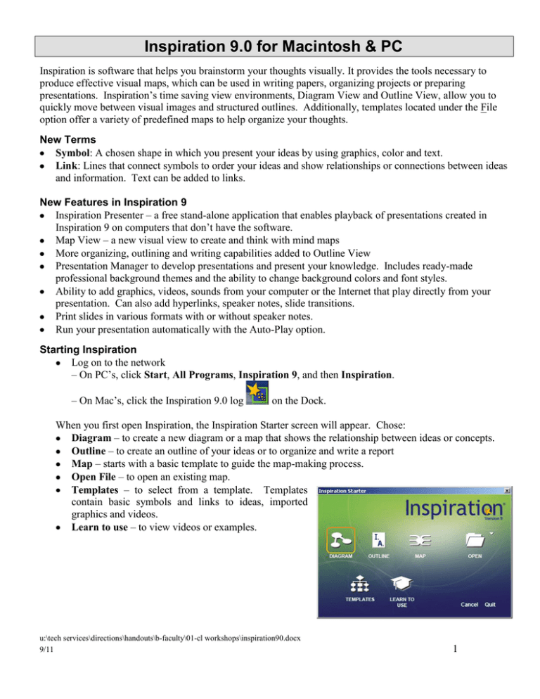 Inspiration 9.0 for Macintosh & PC Inspiration is software that helps you brainstorm your thoughts visually. It provides the tools necessary to produce effective visual maps, which can be used in writing papers, organizing projects or preparing presentations. Inspiration’s time saving view environments, Diagram View and Outline View, allow you to quickly move between visual images and structured outlines. Additionally, templates located under the File option offer a variety of predefined maps to help organize your thoughts. New Terms Symbol: A chosen shape in which you present your ideas by using graphics, color and text. Link: Lines that connect symbols to order your ideas and show relationships or connections between ideas and information. Text can be added to links. New Features in Inspiration 9 Inspiration Presenter – a free stand-alone application that enables playback of presentations created in Inspiration 9 on computers that don’t have the software. Map View – a new visual view to create and think with mind maps More organizing, outlining and writing capabilities added to Outline View Presentation Manager to develop presentations and present your knowledge. Includes ready-made professional background themes and the ability to change background colors and font styles. Ability to add graphics, videos, sounds from your computer or the Internet that play directly from your presentation. Can also add hyperlinks, speaker notes, slide transitions. Print slides in various formats with or without speaker notes. Run your presentation automatically with the Auto-Play option. Starting Inspiration Log on to the network – On PC’s, click Start, All Programs, Inspiration 9, and then Inspiration. – On Mac’s, click the Inspiration 9.0 log on the Dock. When you first open Inspiration, the Inspiration Starter screen will appear. Chose: Diagram – to create a new diagram or a map that shows the relationship between ideas or concepts. Outline – to create an outline of your ideas or to organize and write a report Map – starts with a basic template to guide the map-making process. Open File – to open an existing map. Templates – to select from a template. Templates contain basic symbols and links to ideas, imported graphics and videos. Learn to use – to view videos or examples. u:\tech services\directions\handouts\b-faculty\01-cl workshops\inspiration90.docx 9/11 1 Inspiration at a Glance Link: Used to link two symbols Word Guide Look up definitions, synonyms, antonyms & learn how to pronounce words. Create: Used to create new linked symbol in horizontal, vertical or diagonal directions Rapid Fire: Used to enter ideas quickly Outline View: Displays main ideas & supporting topics of map Transfer: Transfer your map to a word processor Hyperlink: Create a link to a web page or another document Presentation: Gives you access to presentation settings. Note: Opens notes text windows for selected symbol Arrange: Used to arrange symbols in different patterns Symbol Palette: Used to customize symbols on diagrams Creating an Idea Map 1. After launching Inspiration in Diagram view, a new untitled document opens with the Main Idea symbol in the middle of the screen. 2. Type a topic or main idea. 3. Click on Rapid-Fire button on the Diagram toolbar. The RapidFire icon appears in the symbol to show you the tool is turned on. 4. Start typing your ideas. 5. Press Enter (Return) after each idea. 6. The ideas are displayed around the main symbol in a clockwise direction. Modifying an Idea Map To change the shape of a symbol 1. Highlight the symbol to change 2. Go to the Symbol Palette 3. Select new desired symbol Note: You can view or change the palette images by clicking the down arrow and selecting another library. Or click in the box that contains “enter search words” and type the name of a symbol. Hit enter or the Find symbol. u:\tech services\directions\handouts\b-faculty\01-cl workshops\inspiration90.docx 9/11 2 To change the size of a symbol 1. Highlight the symbol to change Note: An outline with handles will appear around the symbol 2. Click and drag on the square handle in the lower right hand corner to resize the symbol To move a symbol 1. Highlight the symbol to change Note: To select multiple symbols, hold down the Shift key and click on another symbol 2. Drag the symbol to a new location in your document window. Note: The original arrows will follow the image Adding or Deleting Symbols & Links To add a symbol 1. Select the symbol you wish from the Symbol Palette. 2. The symbol will appear wherever the + appears on your document window. 3. Type your idea in the new symbol. 4. To add a link to the new symbol, select the Main Idea symbol, click the Link button on the Diagram toolbar. Click the new symbol. To delete a symbol 1. Select the symbol 2. Press the Delete key To delete/add the arrows linking symbols 1. To delete a link, simply click on the arrow and press the Delete key 2. To add a new link click on the Link button on the Diagram toolbar 3. Click on the primary idea symbol (originating link) 4. Click on the secondary idea symbol (one to link to) Note: The link will appear and the arrowhead will point to the secondary symbol. Links are automatically created when you use rapid-fire and the create tools. Additional Features To rearrange symbols 1. Click the Arrange button on the Diagram toolbar (an arrange dialog box will appear) 2. Select the type of diagram you want 3. Click OK 4. To move any symbol just click and drag to a new position To outline your ideas 1. Click on the Outline button on the Diagram toolbar Note: Your diagram now appears as an outline. The idea symbols you added in Diagram view appear as topics and subtopics. Printing an idea map 1. Click on File, Print Preview 2. If the map does not fit on one page a) Click Page Setup. b) On the “Layout” tab, select 1 Page, c) Select “Normal” or “Fit to 1 Page,” 3. Click OK u:\tech services\directions\hand