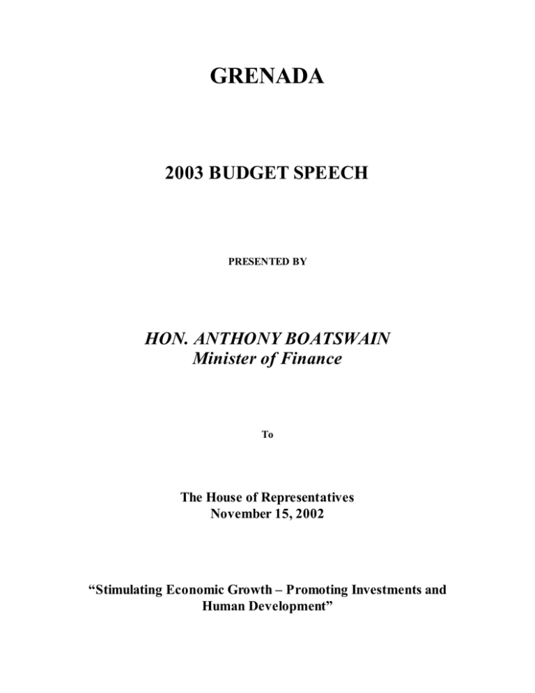 GRENADA 2003 BUDGET SPEECH PRESENTED BY HON. ANTHONY BOATSWAIN Minister of Finance To The House of Representatives November 15, 2002 “Stimulating Economic Growth – Promoting Investments and Human Development” 1 1.0 INTRODUCTION Mr. Speaker, I beg to move the following Motion standing in my name: “Whereas it is necessary to provide for the State of Grenada for the year 2003 by means of an Appropriation Act; Be it resolved that the Estimates of Expenditure for the year 2003 be approved.” Mr. Speaker, this is a Money Motion and I am pleased to inform this honourable House that I have the consent of the Governor General to introduce this motion. Mr. Speaker, I wish to remind you, the Minutes of the Meeting of the Standing Committee on Finance that was held on 18th October 2002, which considered and approved the Estimates of Expenditure for fiscal 2003, have been laid on the Table earlier in these proceedings. Mr. Speaker, permit me to commence the 2003 Budget Presentation by offering high praises to the Almighty God for His guidance and strength during what has been a challenging fiscal year. We also thank God that there was no loss of life in our Country during the passage of tropical storm Lili in September and the tropical wave in October. The damages to infrastructure and the agricultural sector are now estimated at EC$22 million. This is an unfortunate development, for we must now undertake unplanned expenditures not for capital accumulation but for capital replacement. These events again underscore our vulnerability as a small state. In light of these developments, flexibility is required. Government must adjust its plans and divert resources from some important projects to the areas now in dire need. Mr. Speaker, I wish to place on record our Government’s gratitude to the many Grenadians who came out to assist with the clean up operations. Your acts of service were a wonderful demonstration of patriotism, for which we are eternally grateful. Our people are resourceful and resilient. I cannot help but repeat the maxim: “We do it best, when adversity puts us to the test”. We are encouraged by the level of understanding of the current global and domestic economic situation, demonstrated by the vast majority of Grenadians. Our people recognise that tough times call for some sacrifices as we prepare for an even brighter tomorrow. We have no doubt that our Country will overcome the current challenges. The New National Party’s Administration under the visionary and courageous leadership of our Prime Minister, Dr. the Hon. Keith Mitchell, has laid a solid foundation for continued economic and social progress. 2 Today’s Budget Presentation is an important contribution towards the realisation of our Government’s vision of a Healthy, Educated, Productive and Prosperous Nation. I now turn my attention to the external economic environment. 2.0 THE EXTERNAL ECONOMIC ENVIRONMENT Against a backdrop of huge losses in the stock markets caused by corporate accounting scandals; lower traveller confidence consequent upon the events of September 11, 2001; and anxieties about war in the Middle East, the recovery of the global economy has been sluggish. The projection for global economic growth in 2002 has been again revised downward to 2.5 percent. The US economy, the world largest economy, has not recovered as quickly nor as strongly as had been anticipated. It is, therefore, projected that the US economy will only grow by 2.0% in 2002, reflecting lower consumer and investor confidence. For Europe, the forecast is for growth of 0.9 percent. The main factor is weak consumer demand particularly in Germany, Europe’s largest economy. The oil market is subject to increasing volatility arising from concerns about a possible war in Iraq. The price of crude oil, which was US$20.40 per barrel at the beginning of the year, rose to US$28.87 per barrel at the end of September. The weak growth performance in the global economy over the past two years has been most noticeable in the tourism industry, the main engine of growth and earner of foreign exchange in the Eastern Caribbean. Against this background, economic activity in the currency union is projected to contract marginally by 0.1 percent in 2002. Notwithstanding the current economic situation, the EC dollar remains strong. At the end of September 2002, the foreign exchange backing of the Eastern Caribbean currency was 96.8 percent. This means that for every EC dollar in circulation, there was 96.8 cents in foreign exchange reserves. 3.0 PERFORMANCE OF THE DOMESTIC ECONOMY The Grenadian economy showed signs of recovery in 2002 following the economic contraction experienced in 2001. The partial recovery in 2002 is attributed to higher levels of activity in the agriculture, communications and banking and insurance sectors, as well as Government services. 3 As a result, the economy is projected to grow by 0.6 per cent in 2002, a turnaround from the negative 3.4 per cent growth registered last year. Central Government fiscal operations are projected to result in a current account surplus of $10.7 million (1.0 per cent of GDP). This outturn is largely explained by lower than anticipated revenue collections and a higher level of current expenditure. National Debt Management Prudent management of the National Debt constitutes an important element of our Government’s economic management strategy. In recognition of this, the worldrenowned Institutional Investor magazine has rated Grenada No.1 in the world for improved creditworthiness for the period March 2002 to September 2002. As a result of the relatively good credit rating Grenada received from the international credit rating agency, Standard and Poor’s, Government was successful in raising US$96.2 million (after deduction for fees and expenses) on the U.S. capital market, through a bond issue. As of November 1, 2002, Government had disbursed approximately US$48.9 million of these proceeds 