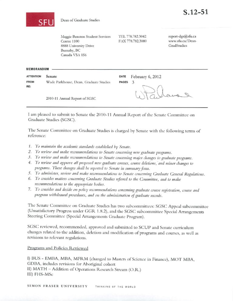 S.12-51 SFU Dean of Graduate Studies Maggie Benston Student Services TEL 778.782.3042 report-dgs@sfu.ca Centre 1100 FAX 778.782.3080 www.sfu.ca/Dean- 8888 University Drive Burnaby, BC GradStudies Canada V5A 1S6 MEMORANDUM attention Senate date from Wade Parkhouse, Dean, Graduate Studies PAGES February 6, 2012 3 RE: 2010-11 Annual Report of SGSC I am pleased to submit to Senate the 2010-11 Annual Report of the Senate Committee on Graduate Studies (SGSC). The Senate Committee on Graduate Studies is charged by Senate with the following terms of reference: 7. To maintain the academic standards established by Senate. 2. lo review and make recommendations to Senate concerning new graduate programs. 3. 'lo review and make recommendations to Senate concerning major changes to graduate programs. 4. To review and approve all proposed new graduate courses, course deletions, and minor changes to programs. These changes shall be reported to Senate ;'/; sunnnary form. 5. lo administer, review and make recommendations to Senate concerning Graduate General Regulations. 6. To consider matters concerning Graduate Studies referred to the Committee, and to make recommendations to the appropriate bodies. 7. 1o consider and decide on policy recommendations concerning graduate course registration, course and program withdrawal procedures, and on the administration ofgraduate records. The Senate Committee on Graduate Studies has two subcommittees: SGSC' Appeal subcommittee (Unsatisfactory Progress under GGR 1.8.2), and the SGSC subcommittee Special Arrangements Steering Committee (Special Arrangements Graduate Program). SGSC reviewed, recommended, approved and submitted to SCUP and Senate curriculum changes related to the addition, deletion and modification of programs and courses, as well as revisions to relevant regulations. Programs and Policies Reviewed I) BUS - EMBA, MBA, MFRM (changed to Masters of Science in Finance), MOT MBA, GDBA, includes revisions for Aboriginal cohort II) MATH - Addition of Operations Research Stream (O.R.) III) FHS-MSc SIMON FUASEH UNIVERSITY THINKING OF THE WORLD IV) GGR 1.3.2 Admission to a graduate diploma program V) GGR 1.3.2.a Addition of admission to a graduate certificate program VI) GGR 1.3.3 Criteria for admission to a master's program VII) GGR 1.3.4 Criteria for admission to a doctoral program VII) GGR 1.3.8.a Addition of criteria for admission to a concurrent bachelor's-master's program VIII) GGR 1.3.11.a Addition of application to complete a non-joint concurrent graduate degree IX) GGR 1.7.6 Revised regulation New programs approved and recommended BUS- EMBA-addition of elective stream: Management in the Americas HSCI PhD Curriculum Changes Approved Program Changes New Courses 36 34 Courses deleted Courses Changed 43 Note: numbers are approximate Graduate admissions, enrolments and credentials awarded While graduate applications increased by 1%; offers decreased by 15% and new enrolments decreased by 12.6% in 2010-11 compared to the previous year 2009-10 (applications 5508; offers 2129; new enrolments 1626). Graduate enrolments decreased by 1% to 4610 students from 2010 with 3807 students in degree programs. Credentials awarded included 915 master's degrees and 126 PhD/EdD, an increase of 6.4% in master's and doctorate degrees awarded from last year. Graduate 04/05 08/09 Applications 3961 4701 5360 5508 Offers 1901 2268 2516 2129 Accepted offers 1512 1891 2037 1827 New Enrolments 1449 1744 1862 1626 09/10 10/11 Admissions Note: data prior to 04/05 is not reliable Enrolments 2000 2005 2010 2011 Total* 2560 3666 4656 4610 43% 82% 80% 2889 3808 3807 23% 62% 62% % Change Degree** % Change 2345 *Total headcount of all graduate students (degree, diploma, exchange and qualifying) ** Total headcount of masters and doctoral students % Change relative to 2000 Credentials 99/00 04/05 09/10 10/11 528 651- 842 915 108 85 136 126 736 978 1041 16% 54% 64% Awarded Masters (M) Doctoral (D) Total (M&D) % Change 636 - % Change from 00/01 in total masters and doctoral credentials Note: data is calculated on a FY basis Tri-council Scholarship Support The Vanier Scholarship program only came into effect in 2009 and we currently have 10 Vanier Scholarship students. In 2011, 234 students were receiving tri-council funding as opposed to 269 students in 2010. SSHRC awardees totaled 122 as opposed to 139 in 2010. CHIR awardees totaled 16 as opposed to 23 in 2010. NSERC awardees totaled 86 as opposed to 100 in 2010. A greater number of students received the higher value CGS-D across all three agencies. SFU had 3 Trudeau Scholarship award winners enrolled in 2011. Note: graduate studentfunding data is contained in the annual reportfrom SPCSAB SGSC Appeals Subcommittee In 2011, the subcommittee considered five appeals of unsatisfactory performance where the student was required to withdraw. Two appeals were upheld. SGSC Special Arrangements Steering Committee In 2011, five students were admitted to the program and two graduated. At the end of 2011, 18 students remained registered in this program, (note: this data excludes students admitted under Special Arrangements in Health Science) SGSC members during 2011 were: W. Parkhouse, Chair (Dean of Graduate Studies) Christi Garneau-Scott, Ali Assaei, Kamran Reayat, Darius Burbidge and David Pereira, (Graduate Student at Large) R. Cameron, Chair FGSC, Faculty of Applied Sciences P. Budra, Chair FGSC, Arts and Social Sciences C. Collins, Chair FGSC, Business R. Wakkary, M. Hatala, Chair FGSC, Communication, Art and Technology J. Nesbit, Chair FGSC, Education W. Haider, D. Knowler, Chair FGSC, Environment C.Janes, M. Moore, Chair FGSC, Health Sciences D. Bingham, P. Ruben, Chair FGSC, Science G. Agnes, M-E Kelm, P. Liljedahl, Associate Dean(s) Graduate Studies (ex officio) M. Pope, Director Graduate Records (ex officio) G. Bird, T. Mundle, University Librarian (ex officio)