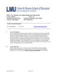 EDUC 573: Methods of Teaching Mathematics-Spring 2016 Course Section: Section K-1 Meeting Time and Place: Tuesdays, 4:00-6:40, Cedar Bluff Course Credit Hours: 3.0 Credit Hours Faculty Contact Information: Dr. Ashley Stanley I. 423-276-6631 ashley.stanley@lmunet.edu Course Description: This course introduces techniques, methods, materials, and evaluation of elementary and middle school mathematics programs. Candidates will have a basic understanding of the mathematical standards, including the National Council for Teachers of Mathematics standards and best practices for grades K-6 and their relationship to a quality math program and will demonstrate their understanding by using them appropriately in planning, teaching, reviewing, assessing, and modeling lesson plans with appropriate manipulatives at various grade levels for various reasons including exceptionalities. In the broadest sense, this course is designed to provide candidates with the ability to analyze situations in relationship to real life, and the use of technology as a tool to aid in the application/process of mathematical skills. II. Course Objectives: Students’ goals and outcomes for education courses should reflect the Teacher Education Program goals and performance expectations that are in the Teacher Education Handbook. Students in this course should stress diversity, research, and evaluation in all assignments. Revised 5/29/2015 Page 1 of 0 a. Relationship of this Course to Content Area Knowledge and Skills TN Standards: 1:1; 2:1, 2; 3:1,2,3; 4:1,2,3,4,5; 5:1,2,3,4; 7:1,2,3 TN Teacher Licensure Standards: 1:A,B; 2:A,B; 3:A,B; 4:A,B; 5:A,B; 6:A,B NCTM Standards: 2,3,4,5,6 b. Specific Course Objectives At the conclusion of the course, the students will be able to: 1. identify and apply problem-solving strategies and related manipulatives to real-life experiences (TNLS 1B, 4, 5A, 5B); 2. acquire knowledge of and ability to explain (as appropriate to grade levels) an overview of concepts of whole numbers, fractions, decimals, integers, measurements, ratio, technology, estimation, algebra, graphs, probability, statistics, geometry, and problem solving (TNLS 1B, 2A, 2B, 3A, 3B, 4A, 4B, 5A, 5B, 6A, 6B); 3. acquire knowledge of and the ability to explain the gather of, depicting of, and predicting data (TNLS 6B); 4. identify and remediate student error patterns in mathematics (TNLS 6B); 5. design and implement lessons using a variety of teaching strategies, including manipulatives, for mathematical concepts and operations and allowing for exceptionalities; identify and develop materials for introducing mathematical concepts using best practices (TNLS B1, B5) 6. integrate mathematical concepts across the curriculum (TNLS B1, B4) 7. acquire knowledge and use of standards in planning, developing, and evaluating mathematical programs (TNLS B) 8. demonstrate an understanding of effective instructional strategies that integrate mathematics content and processes (TNLS 1A); 9. use appropriate and accurate vocabulary and symbols of mathematics to express and justify mathematical concepts and strategies (TNLS B1, B3); 10. use a variety of manipulatives and other models to represent mathematical concepts, operations, and relations (TNLS B1, B5) 11. demonstrate both conceptual understanding of number operation sense and ability to apply those concepts and procedures in problem-solving situations (TNLS 2B); 12. analyze, represent, and describe change in a variety of contexts and problems using graphs, tables, and equations (TNLS B3, B4); 13. apply transformations and use symmetry to analyze mathematical situations (TNLS B3, B4); 14. demonstrate the ability to select and use symmetry to analyze mathematical situations (TNLS B3, B4); 15. select and use appropriate statistical methods to analyze data (TNLS B2, B6); and 16. understand the importance of the use of manipulatives in teaching mathematics (TNLS B1, B5). c. Summary List of Professional Dispositions 1. Attendance and Punctuality 2. Initiative 3. Work Habits 4. Oral Communication 5. Written Communication Skills 6. Collegiality Revised 5/29/2015 Page 2 of 0 7. Respect (in action and speech) 8. Commitment to Profession 9. Professionalism in Clinical & Field Placement (Ethics, Professional Growth, & Confidentiality) d. Unit Proficiencies (incorporated with the Unit’s Institutional Standards) Candidates at the initial and advanced programs throughout and upon completion of their plan of study will be able to: 1. articulate and demonstrate an understanding of the Dispositions of the Profession. 2. express the values of Active Engagement in Education and its value for improving the quality of life. 3. discuss and demonstrate the value of Social Skills. 4. demonstrate and apply the Content Knowledge, Skills, and Best Practices of the profession. 5. understand, articulate, and apply Pedagogical Skills. 6. demonstrate the ability to make informed decisions for improved practice through Reflection. 7. demonstrate growth and improvement in personal Social Intelligence. 8. demonstrate Analytical Skills. 9. demonstrate the ability to Synthesize Information to make informed decisions, from assessment data. 10. demonstrate the ability to Create a Positive Learning Environment. 11. understand, read, and conduct Qualitative and / or Qualitative Research. 12. demonstrate and implement Effective Communication Skills, both written and oral. 13. demonstrate Informational and Technology Literacy. 14. understand and implement Assessment and Evaluation. 15. articulate, implement, and demonstrate an Appreciation for Diversity, understand a Global Perspective and demonstrate an understanding that all students can learn. 16. understand and apply Legal Issues for Fairness and Social Justice. 17. appreciate the value for Lifelong Learning. III. Texts/Materials for the Course: All students are required to purchase the College Live Text computer program. There will be specified assignments required for submiss