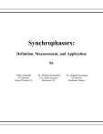 Synchrophasors: Definition, Measurement, and Application by Mark Adamiak GE Multilin King of Prussia, PA Dr. William Premerlani GE Global Research Niskayuna, NY Dr. Bogdan Kasztenny GE Multilin Markham, Ontario Synchrophasors: Definition, Measurement, and Application Mark Adamiak GE Multilin King of Prussia, PA William Premerlani GE Global Research Niskayuna, NY Dr. Bogdan Kasztenny GE Multilin Markham, Ontario Abstract The concept of using phasors to describe power system operating quantities dates back to 1893 and Charles Proteus Steinmetz’s paper on mathematical techniques for analyzing AC networks1. More recently, Steinmetz’s technique of phasor calculation has evolved into the calculation of real time phasor measurements that are synchronized to an absolute time reference. Although phasors have been clearly understood for over 100 years, the detailed definition of a time synchronized phasor has only recently been codified in the IEEE 1344 and the soon to be voted IEEE C37.118 Synchrophasor for Power Systems standards. This paper will review the concept of a phasor and examine the proposed IEEE standard as to “how” a synchronized phasor is to be defined, time stamped, and communicated. The paper will then examine the issues of implementing such measurements in the face of off-nominal frequency components, timing errors, sensor errors, and system harmonics. Simulations of various system transients and their phasor response will be presented. Finally, this paper will review the application of synchrophasors to observe power system dynamic phenomenon and how they will be used in the real-time control of the power system. Examples of system disturbances will be presented. Introduction As the electric power grid continues to expand and as transmission lines are pushed to their operating limits, the dynamic operation of the power system has become more of a concern and has become more difficult to accurately model. In addition, the ability to effect real-time system control is developing into a need in order to prevent wide scale cascading outages. For decades, control centers have estimated the “state” of the power system (the positive sequence voltage and angle at each network node) from measurements of the power flows through the power grid. It is very desirable to be able to “measure” the system state directly and/or augment existing estimators with additional information. Alternating Current (AC) quantities have been analyzed for over 100 years using a construct developed by Charles Proteus Steinmetz in 1893 know as a phasor. On the power system, phasors were used for analyzing AC quantities assuming a constant frequency. A relatively new variant of this technique that synchronizes the calculation of a phasor to absolute time has been developed2, which is known as synchronized phasor measurement or synchrophasors. In order to uniformly create and disseminate these synchronized measurements, several aspects of phasor creation had to be codified3. The following text spells out the definitions and requirements that have been established for the creation of synchronized phasor measurements. Synchrophasor Definition An AC waveform can be mathematically represented by the equation: 1 t ⎛ ⎞ x(t ) = X m ⋅ cos⎜⎜ φ + ∫ ω (τ ) ⋅ dτ ⎟⎟ −∞ ⎝ ⎠ Eqn. 1 where: Xm = magnitude of the sinusoidal waveform ω = 2 * π * f where f is the instantaneous frequency φ = angular starting point for the waveform Note that the synchrophasor is referenced to the cosine function. In a phasor notation, this waveform is typically represented as: X = Xm φ Since in the synchrophasor definition, correlation with the equivalent RMS quantity is desired, a scale factor of 1/√2 must be applied to the magnitude which results in the phasor representation as: X= Xm φ √2 Adding in the absolute time mark, a synchrophasor is defined as the magnitude and angle of a cosine signal as referenced to an absolute point in time as shown in figure 1. X1 X2 Xn ±θ P =√2 +θ* - θ* *Corrected for any filter delay Cosine Reference Cosine Reference UTC Time Reference 2 UTC Time Reference 1 Figure 1 Synchrophasor Definition 2 In figure 1, time strobes are shown as UTC Time Reference 1 and UTC Time Reference 2. At the instant that UTC Time Reference 1 occurs, there is an angle that is shown as “+θ” and, assuming a steady-state sinusoid (i.e. – constant frequency), there is a magnitude of the waveform of X1. Similarly, at UTC Time Reference 2, an angle, with respect to the cosine wave, of “-θ” is measured along with a magnitude or X2. The range of the measured angle is required to be reported in the range of ± π. It should be emphasized that the synchrophasor standard focuses on steady-state signals, that is, a signal where the frequency of the waveform is constant over the period of measurement. In the real world, the power system seldom operates at exactly the nominal frequency. As such, the calculation of the phase angle, θ, needs to take into account the frequency of the system at the time of measurement. For example, if the nominal frequency of operating at 59.5Hz on a 60Hz system, the period of the waveform is 16.694ms instead of 16.666ms – a difference of 0.167%. The captured phasors are to be time tagged based on the time of the UTC Time Reference. The Time Stamp is an 8-byte message consisting a 4 byte “Second Of Century – SOC”, a 3-byte Fraction of Second and a 1-byte Time Quality indicator. The SOC time tag counts the number of seconds that have occurred since January 1, 1970 as an unsigned 32-bit Integer. With 32 bits, the SOC counter is good for 136 years or until the year 2106. With 3-bytes for the Fraction Of Second, one second can be broken down into 16, 777,216 counts or about 59.6 nsec/count. If such resolution is not desired, the proposed standard (C37.118) allows for a user-definable base over which the count will wrap (e.g. – a base of 1,000,000 w