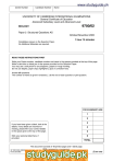 Centre Number Candidate Number www.studyguide.pk Name UNIVERSITY OF CAMBRIDGE INTERNATIONAL EXAMINATIONS General Certificate of Education Advanced Subsidiary Level and Advanced Level 9700/02 BIOLOGY Paper 2 Structured Questions AS October/November 2005 1 hour 15 minutes Candidates answer on the Question Paper. No Additional Materials are required. READ THESE INSTRUCTIONS FIRST Write your Centre number, candidate number and name in the spaces provided at the top of this page. Write in dark blue or black pen in the spaces provided on the Question Paper. You may use a soft pencil for any diagrams, graphs or rough working. Do not use staples, paper clips, highlighters, glue or correction fluid. Answer all questions. The number of marks is given in brackets [ ] at the end of each question or part question. FOR EXAMINER’S USE 1 2 If you have been given a label, look at the details. If any details are incorrect or missing, please fill in your correct details in the space given at the top of this page. Stick your personal label here, if provided. 3 4 5 6 TOTAL This document consists of 15 printed pages and 1 blank page. SP (NF/CGW) S86392/2 © UCLES 2005 [Turn over www.xtremepapers.net www.studyguide.pk For Examiner’s Use 2 Answer all the questions. 1 Fig. 1.1 is a drawing made from an electron micrograph of a goblet cell from the epithelium of the gas exchange system. mucus 'plug' vesicle containing mucus A B C Fig. 1.1 (a) Name A to C. A ....................................................................................................................................... B ....................................................................................................................................... C ...................................................................................................................................[3] (b) State two places in the gas exchange system where goblet cells are found. 1. ...................................................................................................................................... 2. ..................................................................................................................................[1] © UCLES 2005 9700/02/O/N/05 www.xtremepapers.net www.studyguide.pk 3 Mucus contains a number of different glycoproteins, called mucins. These have a protein ‘core’ that is formed by repeated sequences of amino acids, some of which have carbohydrates attached to their side chains (R groups). A part of one of these repeated units is shown diagrammatically in Fig. 1.2. For Examiner’s Use carbohydrate chains protein 'core' Fig. 1.2 (c) Use label lines and the letters P and G to indicate on Fig. 1.2 the positions of: P – a peptide bond; G – a glycosidic bond. [2] (d) Describe the role of mucus in the gas exchange system. .......................................................................................................................................... .......................................................................................................................................... .......................................................................................................................................... .......................................................................................................................................... .......................................................................................................................................... ......................................................................................................................................[3] (e) Glycoproteins are found in cell surface membranes. State one function of these glycoproteins. .......................................................................................................................................... ......................................................................................................................................[1] [Total: 10] © UCLES 2005 9700/02/O/N/05 www.xtremepapers.net [Turn over www.studyguide.pk For Examiner’s Use 4 2 Phospholipids are components of cell surface membranes. (a) Describe how phospholipid molecules are arranged in a cell surface membrane. You may use the space below for a simple annotated diagram if you wish. .......................................................................................................................................... .......................................................................................................................................... .......................................................................................................................................... .......................................................................................................................................... [2] Fig. 2.1 shows the structure of the lipids: • tristearin, which is a triglyceride; • phosphatidylcholine, which is a phospholipid. H CH3 H C N+ H C H O O= P H H H H C C C O O O H H C=O C=O C=O H H O C C C O O H C=O C=O tristearin phosphatidylcholine Fig. 2.1 © UCLES 2005 9700/02/O/N/05 www.xtremepapers.net O– H CH3 CH3 www.studyguide.pk 5 (b) State two ways, visible in Fig. 2.1, in which phosphatidylcholine differs from tristearin. For Examiner’s Use 1. ...................................................................................................................................... .......................................................................................................................................... 2. ...................................................................................................................................... ......................................................................................................................................[2] (c) Explain how the structure o