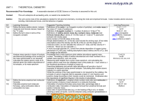 www.studyguide.pk UNIT 1: THEORETICAL CHEMISTRY Recommended Prior Knowledge: A reasonable standard at IGCSE Science or Chemistry is assumed for this unit. Context: This unit underpins all succeeding units, so needs to be studied first. Outline: The unit covers most of the calculations needed for AS (and A2) chemistry, involving the mole and empirical formulae. It also includes atomic structure, bonding, intermolecular forces, and the behaviour of gases. AO 1(a) 1(b) 1(c) 1(d) 1(e) 1(f) Learning Outcomes Define the terms relative atomic, isotopic, molecular and formula masses, based on the 12C scale Define the term mole in terms of the Avogadro constant Analyse mass spectra in terms of isotopic abundances [knowledge of the working of the mass spectrometer is not required]. Calculate the relative atomic mass of an element given the relative abundances of its isotopes, or its mass spectrum Define the terms empirical and molecular formulae. Calculate empirical and molecular formulae, using combustion data or composition by mass Suggested Teaching Activities Definitions of the mole (= an Avogadro number of particles), and molar mass (= the mass of 1 mole of substance). Definition of Avogadro number (L = number of atoms in 12.0g of 12C) Definitions of relative atomic mass (Ar), isotopic mass, molecular and formula masses (Mr) in terms of 1/12 the mass of 1 mole of 12C atoms.[for isotopes see section 2(e)] Some revision of IGCSE ideas of the mole. Simple determinations of L in the lab could include the oil-drop expt. (If we make assumptions about the density and the Mr of the oil, and the shape of its molecule (cubic), we can calculate the volume of 1 mole, and the volume of 1 molecule. Hence we can calculate L.) A more accurate estimate of L comes from electro-deposition of copper during electrolysis of CuSO4(aq), making assumptions about valency and Mr of Cu, and the charge on the electron. Knowledge that a mass spectrum plots relative abundance against mass number. Translating a table of relative abundances and mass numbers into a plotted mass spectrum, and vice versa. Measuring peak heights from a given mass spectrum, and calculating the relative atomic mass from the weighted mean of the peaks [Ar = Σaimi where ai = the fractional abundance of isotope of mass mi] Searching databases and periodic table tabulations will provide a host of examples of elements having several isotopes. Calculating their relative atomic masses is a useful exercise. Whilst the working of the mass spectrometer is not required by the syllabus, the principle of using a magnetic field to separate a beam of ions having a unit positive charge according to their masses could be mentioned. Emphasise also the importance of significant figures in the results of calculations. Definitions of empirical (= simplest whole number mole ratio) and molecular (= actual number of atoms of each element in a molecule) formulae. Calculation of empirical formulae using mass data, percentage data or combustion data. Calculation of molecular formula from empirical formula and relative molecular mass. Class sets of experimental data (e.g. on the heating of Mg in air), or sheets showing a series of results, could be analysed using computer spreadsheets or by a graphical method. www.xtremepapers.net Learning Resources C+H 1.1-1.7 M 37 R+N 2.1, 2.6 site 3 (Avogadro) site 6 (atomic, molecular mass) site 7 (what is a mole?) C+H 2.5 M 29 R+N 2.2, 2.3, 2.4, 2.5 C+H 1.8 M 37 R+N 2.7, 2.8 P(AS) 4 www.studyguide.pk 1(g) Write and/or construct balanced equations 1(h) Perform calculations, including use of the mole concept, involving: (i) reacting masses (from formulae and equations) (ii) volumes of gases (e.g. in the burning of hydrocarbons) (iii) volumes and concentrations of solutions Deduce stoichiometric relationships from calculations such as those in (h) 1(i) 2(a) Identify and describe protons, neutrons and electrons in terms of their relative charges and relative masses 2(b) Deduce the behaviour of beams of protons, neutrons and electrons in electric fields Describe the distribution of mass and charges within an atom 2(c) 2(d) Deduce the numbers of protons, neutrons and electrons present in both atoms and ions given proton and nucleon numbers (and charge) 2(e) Describe the contribution of protons and neutrons to atomic nuclei in terms of proton number and nucleon number Distinguish between isotopes on the basis of different numbers of neutrons present Describe the number and relative energies of the s, p and d orbitals for the 2(f) Various worksheets containing suitable data for simple compounds such as Fe2O3 and other oxides, CaCO3 and other salts, C2H6 and other hydrocarbons (mass, % and combustion data), CH3CO2H etc Experimental work could include the combustion of Mg in a weighed crucible; passing H2(g) or CH4(g) over heated CuO; heating BaCl2.nH2O crystals to find n. Revise the valencies of ions from IGCSE. Revise the four state symbols. Provide a sheet of essential formulae to learn (e.g. simple covalent compounds, common salts, acids and alkalis). Students should practice both balancing equations where the formulae are given, and also constructing balanced chemical equation, given the word equation. Use of the equations moles = mass/Mr or =mass/Ar moles = gas vol (cm3)/24000 moles = vol of soln x concentration These equations are used across the syllabus, but initial experiments and/or calculations could include the following: Acid-base and redox titrations etc. e.g. • calculate n in Na2CO3.nH2O; • [CH3CO2H] in vinegar; • %CaCO3 in limestone (back titration with HCl & NaOH); • %Fe2+ in iron pills (& investigation of Fe2+/MnO4- ratio) Revise IGCSE ideas of the atom. The relative charges (+1, -1, 0) and masses (1, 1/1860, 1) of the proton, the electron and the neutron. The relationship between proton number, neutron number, atomic number and mass number. The representation of at. no. and mass no. e.g. 146C. The key points are that 