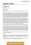 www.studyguide.pk GENERAL PAPER Paper 8004/01 Paper 1 General comments Responses varied widely in the quality of presentation, in the fluency of the English and in the range of content. More able candidates discussed topics in a logical and systematic fashion. They supported their main points with relevant examples from appropriate local, national and international sources and occasionally included apt quotations for further illustration. Such essays were often perceptive and reflective and demonstrated not only a wide range of general but also, on occasion, specialist knowledge. They were skilled at adapting their knowledge to the specific demands of the question and consequently adhered faithfully to the question with no or only minor digression. They were interesting and engaging to read and offered insights into their own cultural experiences which often widened the scope of the debate. They examined the question from both sides to arrive at a balanced view and then expressed their personal opinion with some conviction. Many other candidates were able to express themselves reasonably clearly, but were sometimes careless with spelling and were prone to avoidable grammar mistakes. A few candidates were admirably ambitious in their vocabulary and range of expression. However, they sometimes overreached themselves which resulted in wordiness and inappropriate choice of lexis which led to varying degrees of clumsiness and awkwardness in expression. Quotations were often relevant but not always accurate and there was, at times, some doubt as to the authenticity of attributed sources. Some candidates often drew up fairly elaborate plans to shape their essays but did not always follow these plans so that essays tended to ramble and lose focus. Some candidates did not use sufficient exemplification and illustration to support significant points. A considerable number of essays were rather too generalised and lacked balance. A few contained factually inaccurate information or exaggerated statements, for example, that ‘millions were killed in Indonesia in the recent tsunami’ or that ‘new inventions are being made every second of every day’. Poorer essays were vague and digressive which often resulted in a lack of real and relevant substance. Candidates paid scant attention to keywords in the questions and tended to write down everything they knew about the topic without tailoring it to the actual question. This resulted in many responses in this category being only marginally relevant or, in some cases, totally irrelevant. Frequently, very little or no illustration was offered as evidence to underline important points. Numerous candidates addressed the question they wanted to answer rather than the precise question, which had been set. Some responses had been obviously prepared but many candidates were unable to adapt their material sufficiently to answer the actual question on the paper. A few candidates handicapped themselves unnecessarily by not reading the instructions on the question paper properly and infringing the rubric. Use of time Many candidates do not make best use of their time. They write overlong preambles instead of setting the scene by means of a clear and concise introduction. Similarly, candidates present conclusions consisting often of simple repetition of points already made with inadequate reference to key points and their own personal views. Some candidates seem to think that writing at length is a prerequisite for a good mark and often do not concentrate sufficiently on the quality of their content material and of their English. www.xtremepapers.net www.studyguide.pk A minority of candidates mismanage their time and have to rush Essay 2. This has unfortunate negative effects on the quality and the content and accuracy of the English. It is glaringly obvious that not enough time is spent on the checking of the English. Virtually all candidates, even the very able, make avoidable errors which would be picked up by a focused mechanical check. This does not mean a quick re-read but rather a systematic scrutiny of such elements as spelling, correct tense usage and grammatical agreements. The following examples, which illustrate the need for this process, are all taken from essays written by able candidates who have a good range of vocabulary and expression but are prone to carelessness. ● Females have been praised for their good work and still is. ● They take their phones to School and use it in lessons. ● It encourage employees to work effectively, efficient and creatively. ● One improves their own learning by reading. All candidates should leave some 15 minutes to undertake this mechanical checking. If carried out with due care and attention, it would improve marks substantially. Use of English The standard of English ranged from excellent fluency to a serious lack of command of the language. The academic tone of some essays was sometimes spoilt by jarring and inappropriate colloquial expression such as “Hey guys, does it matter?” This does not mean that colloquial expression is always inadmissible, but it does need to be appropriate to the particular context. Unfortunately, reasonable content was sometimes hampered by an inadequate grasp of English. Many less successful candidates suffered considerable language difficulties. Their essays contained a plethora of basic errors of all kinds in spelling, grammar and expression. Where the content was better than the English, the impact of the relevant material was often undermined by the inadequate performance in language which made the discussion difficult to follow. In extreme cases, the very low marks scored for English made overall success on this paper virtually impossible to achieve. It was disappointing to find more than a few candidates misspelling words which actually were printed on the question paper. Common errors frequently found in essays this year included: ● incorrect use of apostrophes and