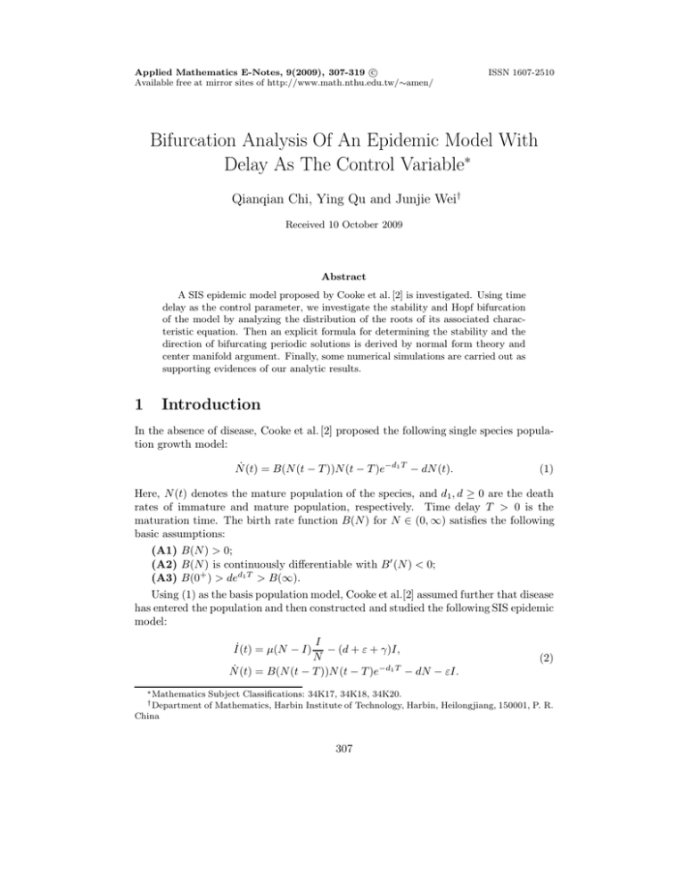 [12] J. J. Wei and X. F. Zou, Bifurcation analysis of a population model and the resulting SIS epidemic model with delay, J. Computational and Applied Mathematics,