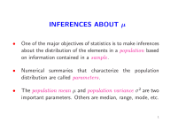 INFERENCES ABOUT µ • One of the major objectives of statistics is to make inferences about the distribution of the elements in a population based on information contained in a sample. • Numerical summaries that characterize the population distribution are called parameters. • The population mean µ and population variance σ 2 are two important parameters. Others are median, range, mode, etc. 1 • Methods for making inferences are basically designed to answer one of two types of questions: (a) Approximately what is the value of the parameter? or (b) Is the value of the parameter less than (say) 6? • Statisticians answer the first question by estimating the parameter using the sample. • The second case might require a test of a hypothesis. 2 Point and Interval Estimation of µ when σ is known and n is large • Point estimation of µ does not require that σ be known or a large n • The point estimate of µ is the sample mean ȳ • Point estimates by themselves do not tell how much ȳ might differ from µ, that is, the accuracy or precision of the estimate • A measure of accuracy is the difference between sample mean ȳ and population mean µ is called sampling error 3 A Confidence Interval for µ • An interval estimate, called a confidence interval , incorporates information about the amount of sampling error in ȳ • A confidence interval for µ takes the form (ȳ − E, ȳ + E), for a number E • An associated number called the confidence coefficient helps assess how likely it is for µ to be in the interval. 4 • To derive the specific form of the confidence interval for µ, for the case when σ is known and n is large, the CLT result must be used. • By the CLT, Z = (Ȳ − µ)/σȳ is approximately ∼ N (0, 1). • Let Z have a N (0, 1) distribution (exactly). • Let zα/2 denote the 1 − α/2 quantile of the standard normal distribution, for a given number α, 0 < α < 1. • Then the following probability statement is true: P −zα/2 (Ȳ − µ) ≤ ≤ zα/2 σȳ =1−α 5 • Manipulating the inequalities, without changing values, we have P (σȳ zα/2 ≥ µ − Ȳ ≥ −σȳ zα/2) = 1 − α • P (Ȳ − σȳ zα/2 ≤ µ ≤ Ȳ + σȳ zα/2) = 1 − α If, for example, α = 0.05 then P (Ȳ − √σn z.025 ≤ µ ≤ Ȳ + √σn z.025) = 0.95 and, since z0.025 = 1.96, σ σ P (Ȳ − 1.96 √ ≤ µ ≤ Ȳ + 1.96 √ ) = 0.95 n n 6 • Using this statement, a (1-α)100% confidence interval for µ, with confidence coefficient 1 − α can be calculated using a random sample of data y1, y2, . . . , yn • It is usually written in the form • σ σ ȳ − √ zα/2, ȳ + √ zα/2 n n . Example: Suppose n = 36, σ = 12, ȳ = 24.8 And for α = 0.05, zα/2 ≡ z0.025 = 1.96 7 • Thus a 95% C.I. for µ is 12 24.8 − √ × 1.96, 36 12 24.8 + √ × 1.96 36 • The interval for µ is: coefficient 0.95. (20.88, 28.72) with confidence • We might say that we are 95% confident that the population mean µ is between 20.88 and 28.72. • But what do we actually mean when we say that we are 95% confident? 8 Interpretation of a Confidence Interval • • • Before the sample is drawn, the probability is (1 − α) that the random interval (Ȳ − √σn zα/2, Ȳ + √σn zα/2) will contain µ (because Ȳ is a random variable). However, once the sample is drawn, and ȳ is calculated, the interval ceases to be random. It is a numerical interval (ȳ − √σn zα/2, ȳ + √σn zα/2), calculated specifically for the drawn sample; thus we cannot associate a probability with it. We may say that the process which led us to this interval will, on the average, produce an interval containing µ, 100(1 − α)% of the time. 9 • • • It is not correct to say that the interval (ȳ − √σn zα/2, ȳ + √σ zα/2) contains µ with a specified probability . n If the process of sampling is repeated many times and 100(1α)% confidence intervals calculated for each sample, then we are confident that 100(1-α)% of those intervals will contain µ. This idea is illustrated in the picture below: 10 Notes: • In the textbook Example 5.1 uses s, the sample standard deviation, in place of σ. Of course, s is a point estimate of σ. Thus it contains sampling error. However, when n is large, σ is sometimes approximated by s because σ is not known. • As the confidence coefficient increases the confidence interval becomes wider. A wider interval estimates µ less precisely. Thus a 99% confidence interval is less accurate than a 95% confidence interval but one has more confidence that µ is in the first interval. • Also note that increasing the sample size n results in a narrower interval (more accurate estimate) for the same confidence coefficient. 11 Exercise 5.8: The caffeine content (in mg) was examined for a random sample of 50 cups of black coffee dispensed by a new machine. The mean and standard deviation were 110 mg and 7.1 mg, respectively. Use these data to construct a 98% confidence interval for µ, the mean caffeine content for cups dispensed by the machine. As the sample size is large we can use the CLT and also approximate σ, the sample standard deviation of the population by s = 7.1 n = 50 ȳ = 110, σ = 7.1, α = .02, z0.01 = 2.33 12 h i ȳ − z0.01 √σn , ȳ + z0.01 √σn i h 7.1 √ , 110 + (2.33) 110 − (2.33) √7.1 50 50 (107.66, 112.34) We are 98% confident that the mean caffeine content for cups dispensed by the machine is between 107.66 and 112.34 mg. 13 Choosing the Sample Size • • • • • √ The width of a confidence interval is (2 × σ × zα/2)/ n. It can be made smaller by changing to a larger α or increasing sample size n. Let us consider selection of n to achieve a desired width 2 · E for a fixed α/ √ We want E to at least equal to σ × zα/2/ n Thus we need to select a sample so that (zα/2)2σ 2 n≥ E2 14 • This will result in an interval no wider than (ȳ − E, ȳ + E). Example: Given σ = 12, α = 0.05, 