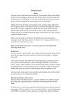 Breast Cancer Ren Ke In recently years, breast cancer has become the first dangerous disease which threats women’s life. Recording by American Cancer Society, there are 40,460 people died for breast cancer in 2000. What is worse, the risk of getting breast cancer increases because of the contaminated environment and incorrect eating habit. Though survive rate for breast cancer patients is not very high, people still need to have a right idea about it. This project may give some basic knowledge about breast cancer. Also it will give suggestions to people who have breast cancer, and help healthy people to decrease the risk to get breast cancer. After reading the project readers may not scary when they heard the name of this disease. Also, they may have a positive attitude to face it. In the rest of the project, I will discuss the elements that cause breast cancer, treatments, and its side effects. Also, I will discuss how to manage fear and how to reduce the risk of getting breast cancer. Before we talk about breast cancer, it is necessary for us to know fundamental knowledge about cancer. Background Cancer is caused by gene mutation. This mutation is likely to produce groups of cells, which do not respond to normal controls on cell division. Typically, we call them cancer cell. Cancer cells divide fast and continuously. At the beginning, the growing of cancer cells, which is called begin tumors, may not endanger our health. As it develops, tumors, which is called malignant, will be formed around normal cells and eventually invade healthy cells. As the time pass by, tumors can travel to other part of body to produce new tumor cell, which is called metastasis and may endanger our life. Like any cancer, breast cancer is also caused by gene mutation, but does that mean it is a disease that can be inherited from parents? Elements that induces breast cancer Someone believes that breast cancer is caused by inherited. They ask that if people have a high risk to get breast cancer, when there is breast cancer history in their family. For some cases, it is true. Some geneticists show that most breast cancer is caused by the mutation of BRCA1 and BRCA2 genes. In a family, if there is a one has the mutation of both BRCA1 and BRCA2 genes, then there is a high chance that their offspring will get the same disease. However, it is not common that the two mutations happen at the same time. Thus, for most cases, the answer is not. Breast cancer organization states that breast cancer has only 5%~10% chances to be inherited. In some family, if there is one or two female members have breast cancer, other female members can still be healthy. Also, if breast cancer has a high risk to be inherited, all of the body cells may receive the cancer-causing genes, thus every body cell should become cancerous. However, breast cancer only appears in breast tissue and people may get the disease only when they reach an advanced age, so what is the major element that causes breast cancer? Actually, the exact causes of breast cancer are unknown, but scientists have found out some factors, such as age, unhealthy eating habit and hormones, that may increase the risk to get this disease. Ehealth (2004, p.3) States that the risk of getting breast cancer increase with age. This is because loss of heterozygosity (LOH for short, means loose of the normal function on one allele of gene) is easily to happen when people reach a relatively old age (45~60 years old). LOH may induce gene mutation in body cells. Thus increase the risk of breast cancer. Hormone is also a factor that may increase breast cancer risk. The longer that body cell exposure to sex hormone the higher the risk to get breast cancer. Estrogen (female hormone) plays a role of receptor on cell. It sends signals to breast cancer to let them grow. Besides the two factors, unhealthy eating habit is another factor. Acidic food and fat food (red meat, cheese and milk) may increase the risk as well. This is because these foods may contain hormones, growth factor and even pesticide, which have high probability of causing gene mutation. At early stage, breast cancer does not have obvious symptoms. However, if women find there is color changed on breast skin, they should go to hospital and take some further tests. The test can help to find out the characteristic of breast cancer, thus decide which treatment the patients should take. Treatment—Surgery As the development of medical technology, many efficient treatments are available for breast cancer patients, such as hormonal therapy and target therapy. However, there are still some people believe that surgery is the best way to treat breast cancer. Is this thought right? Actually, this idea is not completely right because all surgeries may have potential risks. My grandma is a doctor. In her hospital, 60% of breast cancer patients die after surgery because of recurrent. By contrast, some patients who do not do the surgery eventually recover under a long time of chemical and radiation therapy. However, from some point of views, surgery is a good choose as a treatment. There are two kinds of surgery: mastectomy and lumpectomy. In this section, I will focus on advantages and disadvantages of these surgeries. Compared to other treatments, surgery is the quickest way to eliminate tumor cell. Now, let us have a close look at each type of surgeries. Mastectomy means removing the entire breast, and advantage of this surgery is that patients can avoid taking the radiation treatment. As we know, when radiation kills the cancer cells, it will also cause a big damage to normal cells. That is why cancer patients feel tired and sick after radiation therapy. If patients can avoid radiation therapy, it means they can leave a healthy body to fight against cancer. Another surgery, Lumpectomy, which means remove the part of tumor tissues in breast, also have advantages. Firstly, this surgery allows the patients to keep parts of their breast. Al