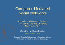 Computer-Mediated Social Networks Networks and Complex Systems Talk Series, Indiana University November 2004 Caroline Haythornthwaite haythorn@uiuc.edu Graduate School of Library and Information Science University of Illinois at Urbana-Champaign Computer-Mediated Social Networks ► Networks created, maintained, and dissolved by communication via computer-mediated communication Email, listservs, webboards, online chat, instant messaging, text messaging, MUD & MOOs, the Internet, etc. ► Communication Who uses computer-mediated communication (CMC), for what, why, and with whom? What media are used to communicate what kinds of information? And to whom? ► Life online Are online ties as “real” as offline ones? How do we work together, learn, create new knowledge at a distance and via CMC, with people we rarely or never meet face-to-face? How do we design systems or recommend practices to support work, learning, and community online, and at a distance? ► Social and technical impacts How does being online change how we work and learn together? How will wide-spread online communication change how we interact, and with whom we create and maintain relationships? What happens if media are removed and/or access denied? Recognizing complexities ► Multiple simultaneous influences Context, social construction, norms, practices, distributed practices Theoretical perspectives: ► social ► New construction, structuration, and adaptive structuration; socio-technical systems perspective; information ecology; social worlds; social and organizational informatics; social networks forms of organizing made possible by the development of CMC and ICT technologies ► Far reaching impact of “the Internet” the connectedness created by the juxtaposition of technical infrastructures and social uses What happens as a result of laying media and Internet connections? Traditional Approaches ► Media and the people we communicate with are primarily dealt with as singular Examining use of Email OR listservs OR chat; work-only groups, or play-only groups Face-to-face is still treated as the ideal standard ► Media declared as better or worse by the number of cues the transmit rather than how they are used Message-medium fit ► Lean messages should be sent via lean media Little recognition of context and variation in use across contexts ► But, we … Use multiple means of communication to effect relationships Prefer rich media for all communications Use media differently from our preferences Communicate with people in many walks of life, in many roles, in many different relationships with us Complexity of CMC ► Media Multiple media available for communication and maintenance of relations ► People Pairs of actors in relationships differing by type (friendship; work), strength, duration, etc. Multiple relations tieing actors, with the set of relations varying by relationship ► Contexts Distribution, across time, space, knowledge base, facility with technology, interests, backgrounds, etc. External constraints on schedules, tasks to be completed, media available and/or mandated for use Multiple calls on time and attention My research ► Adds media into the network equation & networks into the media equation How can we support work, learning, knowledge, and community formation at a distance, via the Internet and through computer-mediated conversations? ► Who talks to whom, about what, and via which media? What kinds of relations make up work and learning ties? How are these supported via all available means of communication? What patterns of connectivity emerge among group members because of what they talk about and what media they use? ► Connectivity effects What do these patterns of connectivity reveal about the group and/or about its media use? What happens as a result of laying media and Internet connections? ► Social and technological interactions How do communication media structure the way we interact with others? Studies of who talks to whom, about what, and via which media ? ►Cerise Co-located, academic researchers ►LEEP Distributed, distance learners ► Interdisciplinary teams Distributed collaborative research teams (in progress) Cerise: Co-located, academic researchers ► Media Unscheduled hallway meetings, scheduled classes and research meetings, email (home and office), phone, fax, videoconferencing system under development ► Relationships Formal or informal working relations, acquaintance to close friend ► Questionnaire 25 respondents (of 35 member group) answered 24 questions about a variety of work and social interactions with 10-20 others (data for a total of 378 pairs) Six dimensions of work and social interaction: ► Receiving work (engaged in by 57% of pairs) Giving work (57%), Collaborative Writing (32%) Computer Programming (56%), Sociability (86%) Major Emotional Support (7% of pairs) Example of question format TYPE OF INTERACTION Group Members: 1 2 3 ... 20 How often have you received instructions (i.e., exact directions on what work to do) from this person? in unscheduled face-to-face meetings in scheduled face-to-face meetings by telephone by fax by electronic mail by videoconferencing How often: D for daily W for Weekly M for Monthly Y for Yearly 0 for never For in between amounts use e.g., 2D for twice a day, 6Y for six times a year LEEP: Distributed, distance learners ► Media Internet Relay Chat (IRC) for classes, ‘live’ office hours, subgroup discussions, and whispering; Real-Audio for instructor delivery of lectures; Webboards for classes and the program; Email, Phone, Face-to-face once a semester ► Questionnaire 4 classes of 14-23 (2 classes studied over time) 4 questions: Collaboration on Class Work, Exchanging Information or Advice about Class Work, Socializing, Exchanging Emotional Support ► Interviews Students from across the program Exploring characteristics of online community, learning to be part of an online program and community, s