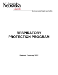 Environmental Health and Safety RESPIRATORY PROTECTION PROGRAM Revised February 2012 TABLE OF CONTENTS 1 INTRODUCTION ...................................................................................................... 1 1.1 1.2 1.3 1.4 2 Regulatory Authority ......................................................................................... 1 Application ........................................................................................................ 1 Glossary ........................................................................................................... 1 Overview .......................................................................................................... 2 PROGRAM ELEMENTS ........................................................................................... 2 2.1 2.2 2.3 2.4 2.5 2.6 2.7 Notification to EHS of Operations that may Require RPE ................................ 2 Assessment of the Hazards of a Job or Task by EHS ...................................... 3 Selection of Respiratory Protection Equipment ................................................ 3 Medical Evaluation ........................................................................................... 3 Fit-testing of Respirators (Tight-fitting Respirators) .......................................... 4 Training ............................................................................................................ 5 Use of Respirators............................................................................................ 6 2.7.1 General Considerations for Routine Use of All Respirators ................... 6 2.7.2 Specific Considerations For Use Of Supplied Air Respirators ............... 7 2.7.3 Respiratory Protection Equipment For Emergency Use, Firefighting, and/or IDLH Atmospheres ..................................................................... 7 2.7.4 Interim Respirator Use ........................................................................... 7 2.7.5 Voluntary Use of Respirators ................................................................. 7 2.8 Maintenance and Storage of Respiratory Protection Equipment ...................... 8 2.8.1 Respirator Inspections ........................................................................... 8 2.8.2 Cartridge Change Schedule (Air Purifying Respirators) ......................... 8 2.8.3 Repair .................................................................................................... 9 2.8.4 Cleaning................................................................................................. 9 2.8.5 Storage .................................................................................................. 9 2.9 Recordkeeping ................................................................................................. 9 2.10 Program Evaluations ...................................................................................... 10 3 RESPONSIBILITIES ............................................................................................... 10 3.1 3.2 3.3 3.4 3.5 Department Heads/Chairs .............................................................................. 10 Supervisors .................................................................................................... 10 Employees ..................................................................................................... 11 Environmental Health and Safety (EHS) ........................................................ 11 Medical Professional ...................................................................................... 12 APPENDIX A GLOSSARY OF TERMS........................................................................ 13 APPENDIX B TYPES OF RESPIRATORY PROTECTIVE EQUIPMENT ..................... 16 i RESPIRATORY PROTECTION (Created 12/01; Revised 5/05, 2/08, 4/08, 3/11) ADDITIONAL MATERIALS FORMS Respiratory Protective Equipment Hazard Assessment Respirator Training and Fit Test Record Medical Evaluation Questionnaire Medical Surveillance Assessment EHS SAFE OPERATING PROCEDURES Respiratory Protection – Program Summary Use and Maintenance of Filtering Facepiece Respirators Use and Maintenance of Air Purifying Half Mask Respirators Use and Maintenance of Air Purifying Full-Face Mask Respirators Use and Maintenance of PAPR (Powered Air Purifying Respirators) Use and Maintenance of Supplied Air Respirators (Air-Line) Voluntary Use of Respiratory Protection Equipment UNL Environmental Health and Safety 3630 East Campus Loop Lincoln, Nebraska 68583-0824 (402) 472-4925 (402) 472-9650 (fax) ehs@unl.edu http://ehs.unl.edu/ ii RESPIRATORY PROTECTION (Created 12/01; Revised 5/05, 2/08, 4/08, 3/11) 1 Introduction In the course of their employment at the University of Nebraska-Lincoln (UNL), some employees may be required to use respiratory protection equipment (RPE) to reduce exposure to airborne hazards that may cause occupational injuries or illnesses. These airborne hazards may occur in the form of a gas, vapor, fume, smoke, fog, dust, mist, bio-aerosols, lack of sufficient oxygen in the space, or extreme temperatures. Control of exposures to respiratory hazards must be accomplished, as far as reasonably achievable, by accepted engineering controls. Engineering controls may include isolation, confinement, local or general ventilation, and/or substitution of less hazardous materials. Respiratory protection may be used to protect employees from respiratory hazards only when engineering controls are not feasible, while they are being implemented or evaluated, or when needed as a supplement to engineering controls. This written program establishes the procedures for use of RPE at UNL to protect employee health and safety and to comply with regulatory requirements. 1.1 Regulatory Authority The development and implementation of the UNL Respiratory Protection Program is in accordance with the regulations of the State of 