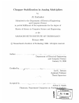 Chopper Stabilization in Analog Multipliers by All Hadiashar Submitted to the Department of Electrical Engineering and Computer Science in partial fulfillment of the requirements for the degree of Master of Science in Computer Science and Engineering at the MASSACHUSETTS INSTITUTE OF TECHNOLOGY February 2006 @ Massachusetts Institute of Technology 2006. All rights reserved. A uth or ........ Certified by..... ....... ,. ... ....................... Department of Electrical Engineering and Computer Science January 31, 2006 ................. ...... Joel L. Dawson Assistant Professor Thesis Supervisor Accepted by .. . . . . . . .... .. .. . . .. . . Arthur C. Smith Chairman, Department Committee on Gradu ents MASSACHUSETS INSTITUTE OFTECHNOLOGY JUL 10 2006 LIBRARIES Chopper Stabilization in Analog Multipliers by Ali Hadiashar Submitted to the Department of Electrical Engineering and Computer Science on January 31, 2006, in partial fulfillment of the requirements for the degree of Master of Science in Computer Science and Engineering Abstract The multiplier is a fundamental analog building block. Analog multipliers are used in many systems such as filters, neural networks, automatic gain control circuits, and phase alignment systems. As with any circuit, analog multipliers are plagued by DC offsets. When considering techniques for removing this offset, the question of continuous regulation versus calibration arises. We can easily implement a calibration method, however, how often one must calibrate becomes an issue. Additionally, calibration typically forces the multiplier to suspend normal operation while the offsets are being measured. In this thesis, a technique for continuously regulating offset in multipliers is studied in isolation. Chopper stabilization, a technique long used in DC amplifiers, is applied to analog multipliers to achieve the lowest offset reported. Thesis Supervisor: Joel L. Dawson Title: Assistant Professor 3 4 Acknowledgments During my time at MIT, I have encountered many people that have helped and supported me in the journey to completing this research and thesis and I am delighted to be able to thank them here. I would like to deeply thank my advisor, Professor Joel L. Dawson, for taking a chance on taking me in as his first graduate student. It has been a tremendous privilege and blessing to work with him. His technological knowledge and constant encouragement has allowed me to complete my research successfully. MIT is a great resource for experience and knowledge in any technical field. I thank my fellow lab mates, as well as members of the Perrott, Sodini, Lee, and Sarpeshkar group's for allowing me to use their knowledge and resources, time and time again. I would like to National Semiconductor Corporation for allowing me to use their 0.18pm process free of charge and for their design and fabrication support. I have been lucky to have developed some close friendships that have the added benefit of directly aiding me in my research here. I thank Ji-Jon Sit for his constant advice and prayers from when I started at MIT, regarding course work and finding an advisor. I also thank Colin Weltin-Wu, whose passion for analog circuits has allowed me to have a deeper appreciation for circuit design. Being in Boston and at MIT, I have made many friendships outside of my field that have greatly enriched my time and experience. I thank the members of GCF and Mosaic and my roommates for their help, advice, prayers, and impact that they made in my life. I would like to thank my parents for always loving and supporting me, even when I decide to move 3000 miles away. Lastly, I thank God for his constant faithfulness. "Not to us, 0 LORD, not to us, but to your name be the glory, because of your love and faithfulness." -Ps 115:1 5 6 Contents 1 2 13 Introduction 1.1 Motivation. 1.2 Organization . . . . . . . . . . . . . . . . . . . . . . . . . . . . . . . . 13 . . . . . . . . . . . . . . . . . . . . . . . . . . . . . . . 13 15 Multiplier Core 2.1 Multiplication in Analog Circuits . . . . . . . . . . . . . . . . . . . . 15 2.2 Generalized Offset Model . . . . . . . . . . . . . . . . . . . . . . . . . 18 2.3 Isolating Offset . . . . . . . . . . . . . . . . . . . . . . . . . . . . . . 19 21 3 Current Approaches 3.1 3.2 Overview of Current Techniques . . . . . . . . . . 21 3.1.1 Nonlinear Feedback . . . . . . . . . . . . . 21 3.1.2 Floating-Gate Charge Injection . . . . . . 22 3.1.3 Digital Integrator in Feedback . . . . . . . 22 . . . . 23 Calibration vs. Continuous Regulation 25 4 Theory of Chopper Stabilization 5 4.1 Application to DC Amplifiers . . . . . . . . . . . 25 4.2 Application to Analog Multipliers . . . . . . . . . 26 4.2.1 Effects of Pseudorandom Chopping . . . . 28 4.2.2 Quadrature Chopping . . . . 28 . . . . . . . 29 Limits on performance 5.1 Residual Offset Model . . . . . . . . . . . . . . . . . . . . . . . . . . 7 29 5.2 6 31 5.2.1 Clock Nonidealities . . . . . . . . . . . . . . . . . . . . . . . . 31 5.2.2 Chopper Nonidealities . . . . . . . . . . . . . . . . . . . . . . 32 5.2.3 Effects of DC content in Chopping Waveforms . . . . . . . . . 32 5.2.4 Nonlinearities in Multipliers . . . . 33 Prototype of Chopper Stabilization with Analog Multipliers 35 35 6.1 System Overview . . . . . . . . . . . . . 6.2 Objectives . . . . . . . . . . . . . . . . . . . . . . . 35 6.3 Circuit Details . . . . . . . . . . . . . . . . . . . . . 36 6.3.1 Gilbert Cell . . . . . . . . . . . . . . . . . . 36 6.3.2 Choppers . . . . . . . . . . . . . . . . . . . 40 6.3.3 Quadrature Clock Generators . . . . . . . . 40 6.3.4 Select Circuitry . . . . . . . . . . . . . . . . 41 Testing . . . . . . . . . . . . . . . . . . . . . . . . . 41 6.4 7 . . . . . . . . . . . . . . . . . . . . . . . . . Nonidealities in Circuits 47 Conclusion 7.1 Future Work . . . . . . . . . . . . . . . . . . . . . . . . . . . . . . . . 47 49 A Experimental Setup . . . . . . . . . . . . . . . . . . . . . . . . . . . . . . .