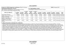 UNCLASSIFIED Exhibit R-2, RDT&E Budget Item Justification: PB 2011 Air Force APPROPRIATION/BUDGET ACTIVITY 3600: Research, Development, Test & Evaluation, Air Force BA 3: Advanced Technology Development (ATD) COST ($ in Millions) FY 2009 Actual DATE: February 2010 R-1 ITEM NOMENCLATURE PE 0603203F: Advanced Aerospace Sensors FY 2010 Estimate FY 2011 Base Estimate FY 2011 OCO Estimate FY 2011 Total Estimate FY 2012 Estimate FY 2013 Estimate FY 2014 Estimate FY 2015 Estimate Cost To Complete Total Cost Total Program Element 69.902 52.786 44.677 0.000 44.677 50.650 48.614 50.969 53.337 Continuing Continuing 63665A: Advanced Aerospace Sensors Technology 19.832 27.175 22.996 0.000 22.996 24.446 22.571 23.656 24.755 Continuing Continuing 6369DF: Target Attack and Recognition Technology 40.422 25.611 21.681 0.000 21.681 26.204 26.043 27.313 28.582 Continuing Continuing 6388SP: Advanced Space Sensors 9.648 0.000 0.000 0.000 0.000 0.000 0.000 0.000 0.000 Continuing Continuing A. Mission Description and Budget Item Justification Divided into three broad project areas, this program develops technologies to enable the continued superiority of sensors from aerospace platforms. The first project develops and demonstrates advanced technologies for electro-optical sensors, radar sensors and electronic counter-countermeasures, and components and algorithms. The second project develops and demonstrates radio frequency and electro-optical sensors for detecting, locating, and targeting airborne, fixed, and timecritical mobile ground targets obscured by natural or man-made means. The third project develops and demonstrates space sensor technologies including radiofrequency sensors; intelligence, surveillance, and reconnaissance sensors; electro-optical sensors; laser warning sensors; targeting and attack radar sensors; and electronic counter-countermeasures and communications. Together, the projects in this program develop the means to find, fix, target, track, and engage air and ground targets anytime, anywhere, and in any weather. This program is in Budget Activity 3, Advanced Technology Development, since it develops and demonstrates technologies for existing system upgrades and/or new sensor and electronic combat system developments that have military utility and address warfighter needs. UNCLASSIFIED Air Force R-1 Line Item #17 Page 1 of 30 UNCLASSIFIED Exhibit R-2, RDT&E Budget Item Justification: PB 2011 Air Force APPROPRIATION/BUDGET ACTIVITY 3600: Research, Development, Test & Evaluation, Air Force BA 3: Advanced Technology Development (ATD) B. Program Change Summary ($ in Millions) Previous President's Budget Current President's Budget Total Adjustments • Congressional General Reductions • Congressional Directed Reductions • Congressional Rescissions • Congressional Adds • Congressional Directed Transfers • Reprogrammings • SBIR/STTR Transfer • Other Adjustments DATE: February 2010 R-1 ITEM NOMENCLATURE PE 0603203F: Advanced Aerospace Sensors FY 2009 65.115 69.902 4.787 0.000 0.000 0.000 4.787 FY 2010 51.482 52.786 1.304 -0.075 0.000 -0.221 1.600 0.000 0.000 0.000 0.000 FY 2011 Base 0.000 44.677 44.677 FY 2011 OCO 0.000 0.000 0.000 FY 2011 Total 0.000 44.677 44.677 44.677 0.000 44.677 Congressional Add Details ($ in Millions, and Includes General Reductions) FY 2009 FY 2010 Project: 63665A: Advanced Aerospace Sensors Technology Congressional Add: Moving Target Strike. 1.995 0.000 Congressional Add: Precision Image Tracking and Registration. 1.596 0.000 3.591 0.000 Congressional Add: Active Unmanned Air Vehicle (UAV) Phenomenology (AUP) & ART Technology Transition. 1.995 0.000 Congressional Add: Automated Sensor-Communication Response Technology. 1.596 0.000 Congressional Add: Reconfigurable Secure Computing Technologies. 1.197 1.593 Congressional Add Subtotals for Project: 6369DF 4.788 1.593 Congressional Add Totals for all Projects 8.379 1.593 Congressional Add Subtotals for Project: 63665A Project: 6369DF: Target Attack and Recognition Technology UNCLASSIFIED Air Force R-1 Line Item #17 Page 2 of 30 UNCLASSIFIED Exhibit R-2, RDT&E Budget Item Justification: PB 2011 Air Force APPROPRIATION/BUDGET ACTIVITY 3600: Research, Development, Test & Evaluation, Air Force BA 3: Advanced Technology Development (ATD) DATE: February 2010 R-1 ITEM NOMENCLATURE PE 0603203F: Advanced Aerospace Sensors Change Summary Explanation Note: In FY 2010, Congress added $1.6 million for Reconfigurable Secure Computing Technologies. The FY 2010 President's Budget submittal did not reflect FY 2011 through FY 2015 funding. A detailed explanation of changes between the two budget positions is not provided because it cannot be made in a relevant manner. C. Performance Metrics Under Development. UNCLASSIFIED Air Force R-1 Line Item #17 Page 3 of 30 UNCLASSIFIED Exhibit R-2A, RDT&E Project Justification: PB 2011 Air Force DATE: February 2010 APPROPRIATION/BUDGET ACTIVITY 3600: Research, Development, Test & Evaluation, Air Force BA 3: Advanced Technology Development (ATD) COST ($ in Millions) 63665A: Advanced Aerospace Sensors Technology FY 2009 Actual 19.832 R-1 ITEM NOMENCLATURE PE 0603203F: Advanced Aerospace Sensors PROJECT 63665A: Advanced Aerospace Sensors Technology FY 2010 Estimate FY 2011 Base Estimate FY 2011 OCO Estimate FY 2011 Total Estimate FY 2012 Estimate FY 2013 Estimate FY 2014 Estimate 27.175 22.996 0.000 22.996 24.446 22.571 23.656 FY 2015 Estimate Cost To Complete Total Cost 24.755 Continuing Continuing A. Mission Description and Budget Item Justification This project develops and demonstrates aerospace sensor and processing technologies for intelligence, surveillance, reconnaissance, target, and attack radar applications in both manned and unmanned platforms, including electro-optical sensors and electronic counter-countermeasures for radars. It provides aerospace platforms with the capability to precisely detect, track, and target both airborne (conventional and low radar cross-section) and g