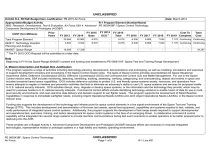 UNCLASSIFIED Date: March 2014 Exhibit R-2, RDT&E Budget Item Justification: PB 2015 Air Force Appropriation/Budget Activity R-1 Program Element (Number/Name) 3600: Research, Development, Test & Evaluation, Air Force / BA 4: Advanced PE 0603438F / Space Control Technology Component Development & Prototypes (ACD&P) COST ($ in Millions) Prior Years FY 2013 FY 2014 FY 2015 Base FY 2015 # OCO FY 2015 Total FY 2016 FY 2017 FY 2018 Cost To FY 2019 Complete Total Cost Total Program Element - 20.584 22.862 6.075 - 6.075 6.336 6.909 7.044 7.179 Continuing Continuing 642611: Technology Insertion Planning and Analysis - 3.645 5.534 6.075 - 6.075 6.336 6.909 7.044 7.179 Continuing Continuing 64A007: Space Range - 16.939 17.328 - - - - - - # - - 34.267 The FY 2015 OCO Request will be submitted at a later date. Note Beginning in FY15 the Space Range (64A007) content and funding was transferred to PE 0606116F, Space Test and Training Range Development. A. Mission Description and Budget Item Justification This program supports a range of activities including technology planning, development, demonstrations and prototyping, as well as modeling, simulations and exercises to support development of tactics and procedures in the Space Control mission area. The types of Space Control activities accomplished are Space Situational Awareness (SSA), Defensive Counterspace (DCS), Offensive Counterspace (OCS) and Command and Control (C2) and Battle Management. For use in the Space Control mission area, SSA includes monitoring, detecting, identifying, tracking, assessing, verifying, categorizing, and characterizing, objects and events in space and includes terrestrial based space capabilities. DCS includes defensive activities to protect U.S. and friendly space-systems assets, resources, and operations from enemy attempts to negate or interfere and prevention activities that limit or eliminate an adversary's ability to use U.S. space systems and services for purposes hostile to U.S. national security interests. OCS activities disrupt, deny, degrade or destroy space systems, or the information and the technology they provide, which may be used for purposes hostile to U.S. national security interests. Command & Control efforts include identifying technology solutions to enable fusion of data for use in multilevel security environments, and near-real-time data delivery and decision support to war fighter needs. This program supports the development of Rapid Reaction Capabilities in response to immediate warfighter needs, including Urgent Operational Needs (UONs) and Joint Urgent Operational Needs (JUONs), in the Space Control mission area. Funding also supports the development of the technology and infrastructure for space control elements in a live signal environment of the Space Test and Training Range (STTR). This includes development and demonstration of first-ever test assets, special test equipment, capabilities and systems required to test, validate, and verify performance of integrated space control systems. Additionally, this program supports the development of test range assets required to support developmental and operational test, exercises, training, and tactics development for space control systems in the face of an emerging threat. A collaborative command & control capability will be integrated into several range systems to provide real time communications during test event scenarios to enable operators to be better prepared prior to deploying into the AOR. These projects are in Budget Activity 4, Advanced Component Development and Prototypes (ACD&P) because efforts are necessary to evaluate integrated technologies, representative modes or prototype systems in a high fidelity and realistic operating environment. PE 0603438F: Space Control Technology Air Force UNCLASSIFIED Page 1 of 9 R-1 Line #31 UNCLASSIFIED Date: March 2014 Exhibit R-2, RDT&E Budget Item Justification: PB 2015 Air Force Appropriation/Budget Activity R-1 Program Element (Number/Name) 3600: Research, Development, Test & Evaluation, Air Force / BA 4: Advanced PE 0603438F / Space Control Technology Component Development & Prototypes (ACD&P) FY 2013 FY 2014 FY 2015 Base B. Program Change Summary ($ in Millions) Previous President's Budget Current President's Budget Total Adjustments • Congressional General Reductions • Congressional Directed Reductions • Congressional Rescissions • Congressional Adds • Congressional Directed Transfers • Reprogrammings • SBIR/STTR Transfer • Other Adjustments 25.144 20.584 -4.560 -0.030 -2.000 - - - - -0.669 -1.861 27.024 22.862 -4.162 - -4.000 - - - -0.162 - - FY 2015 OCO FY 2015 Total 25.907 6.075 -19.832 - - - 25.907 6.075 -19.832 -19.832 - -19.832 Change Summary Explanation FY 2013: -$2.0M Congressional Reduction: "Project decrease. ORS add." -$1.861M Sequester reduction FY 2014: -$4.0M Congressional Reduction: "Hold to FY 2013 level" -$.0162M FFRDC reduction FY 2015: -$19.832: Space Range content and funding transferred to PE 0606116F, Space Test and Training Range Development PE 0603438F: Space Control Technology Air Force UNCLASSIFIED Page 2 of 9 R-1 Line #31 UNCLASSIFIED Date: March 2014 Exhibit R-2A, RDT&E Project Justification: PB 2015 Air Force Appropriation/Budget Activity 3600 / 4 COST ($ in Millions) R-1 Program Element (Number/Name) PE 0603438F / Space Control Technology Prior Years FY 2013 FY 2014 FY 2015 Base FY 2015 # OCO FY 2015 Total FY 2016 Project (Number/Name) 642611 / Technology Insertion Planning and Analysis FY 2017 FY 2018 642611: Technology Insertion Planning and Analysis - 3.645 5.534 6.075 - 6.075 6.336 6.909 7.044 Quantity of RDT&E Articles - - - - - - - - - # Cost To FY 2019 Complete Total Cost 7.179 Continuing Continuing - The FY 2015 OCO Request will be submitted at a later date. A. Mission Description and Budget Item Justification This project supports a range of activities including technology planning, development, demonstrations and prototyping, and testin