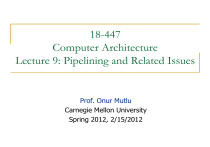 18-447 Computer Architecture Lecture 9: Pipelining and Related Issues Prof. Onur Mutlu Carnegie Mellon University Spring 2012, 2/15/2012 Reminder: Homeworks Homework 3 Due Feb 27 Out 3 questions LC-3b microcode Adding REP MOVS to LC-3b Pipelining 2 Reminder: Lab Assignments Lab Assignment 2 Due Friday, Feb 17, at the end of the lab Individual assignment No collaboration; please respect the honor code Lab Assignment 3 Already out Extra credit Early check off: 5% Fastest three designs: 5% + prizes More on this later 3 Reminder: Extra Credit for Lab Assignment 2 Complete your normal (single-cycle) implementation first, and get it checked off in lab. Then, implement the MIPS core using a microcoded approach similar to what we are discussing in class. We are not specifying any particular details of the microcode format or the microarchitecture; you should be creative. For the extra credit, the microcoded implementation should execute the same programs that your ordinary implementation does, and you should demo it by the normal lab deadline. 4 Readings for Today Pipelining P&H Chapter 4.5-4.8 Pipelined LC-3b Microarchitecture Handout Optional Hamacher et al. book, Chapter 6, “Pipelining” 5 Review: Pipelining: Basic Idea More systematically: Pipeline the execution of multiple instructions Analogy: “Assembly line processing” of instructions Idea: Divide the instruction processing cycle into distinct “stages” of processing Ensure there are enough hardware resources to process one instruction in each stage Process a different instruction in each stage Instructions consecutive in program order are processed in consecutive stages Benefit: Increases instruction processing throughput (1/CPI) Downside: Start thinking about this… 6 Example: Execution of Four Independent ADDs Multi-cycle: 4 cycles per instruction F D E W F D E W F D E W F D E W Time Pipelined: 4 cycles per 4 instructions (steady state) F D E W F D E W F D E W F D E W Time 7 Review: The Laundry Analogy Time 6 PM 7 8 9 10 11 12 1 2 AM Task order A B C D “place one dirty load of clothes in the washer” “when the washer is finished, place the wet load in the dryer” 1 6 PM 8 9 10 11 dry 12 2 AM “when the dryer is7 finished, take out the load and fold” Time “when folding is finished, ask your roommate (??) to put the clothes Task away” order A B C - steps to do a load are sequentially dependent - no dependence between different loads - different steps do not share resources D Based on original figure from [P&H CO&D, COPYRIGHT 2004 Elsevier. ALL RIGHTS RESERVED.] 8 Review: Pipelining Multiple Loads of Laundry 6 PM 7 8 9 10 11 12 1 2 AM 6 PM TimeA 7 8 9 10 11 12 1 2 AM 7 8 9 10 11 12 1 2 AM 7 8 9 10 11 12 1 2 AM Time Task order Task B order A C D B C D 6 PM Time Task order 6 PM Time A Task order B A C B D C D Based on original figure from [P&H CO&D, COPYRIGHT 2004 Elsevier. ALL RIGHTS RESERVED.] - 4 loads of laundry in parallel - no additional resources - throughput increased by 4 - latency per load is the same 9 Review: Pipelining Multiple Loads of Laundry: In Practice Time 6 PM 7 8 9 10 11 12 1 2 AM 6 PM 7 8 9 10 11 12 1 2 AM 6 PM 7 8 9 10 11 12 1 2 AM 6 PM 7 8 9 10 11 12 1 2 AM Task order A Time B Task order C A D B C D Time Task order TimeA Task B order C A D B C the slowest step decides throughput D Based on original figure from [P&H CO&D, COPYRIGHT 2004 Elsevier. ALL RIGHTS RESERVED.] 10 Pipelining Multiple Loads of Laundry: In Practice 6 PM 7 8 9 10 11 12 1 2 AM A 6 PM Time 7 8 9 10 11 12 1 2 AM 6 PM 7 8 9 10 11 12 1 2 AM Task order 6 PM Time A 7 8 9 10 11 12 1 2 AM Time Task order Task B order C A D B C D Time Task B order C A B D A B A B C D Throughput restored (2 loads per hour) using 2 dryers Based on original figure from [P&H CO&D, COPYRIGHT 2004 Elsevier. ALL RIGHTS RESERVED.] 11 An Ideal Pipeline Goal: Increase throughput with little increase in cost (hardware cost, in case of instruction processing) Repetition of identical operations Repetition of independent operations No dependencies between repeated operations Uniformly partitionable suboperations The same operation is repeated on a large number of different inputs Processing can be evenly divided into uniform-latency suboperations (that do not share resources) Good examples: automobile assembly line, doing laundry What about instruction processing pipeline? 12 Ideal Pipelining combinational logic (F,D,E,M,W) T psec T/2 ps (F,D,E) T/3 ps (F,D) BW=~(1/T) BW=~(2/T) T/2 ps (M,W) T/3 ps (E,M) T/3 ps (M,W) BW=~(3/T) 13 More Realistic Pipeline: Throughput Nonpipelined version with delay T BW = 1/(T+S) where S = latch delay T ps k-stage pipelined version BWk-stage = 1 / (T/k +S ) BWmax = 1 / (1 gate delay + S ) T/k ps T/k ps 14 More Realistic Pipeline: Cost Nonpipelined version with combinational cost G Cost = G+L where L = latch cost G gates k-stage pipelined version Costk-stage = G + Lk G/k G/k 15 Pipelining Instruction Processing 16 Remember: The Instruction Processing Cycle Fetch fetch (IF) 1. Instruction Decodedecode and 2. Instruction register operand fetch (ID/RF) Evaluate Address 3. Execute/Evaluate memory address (EX/AG) Fetch Operands 4. Memory operand fetch (MEM) Execute 5. Store/writeback result (WB) Store Result 17 Remember the Single-Cycle Uarch Instruction [25– 0] 26 Shift left 2 Jump address [31– 0] 28 PC+4 [31– 28] ALU Add result Add 4 Instruction [31– 26] Control Instruction [25– 21] PC Read address Instruction memory Instruction [15– 11] M u x M u x 1 0 Shift left 2 RegDst Jump Branch MemRead MemtoReg ALUOp MemWrite ALUSrc RegWrite PCSrc2=Br Taken Read register 1 Instruction [20– 16] Instruction [31– 0] PCSrc 1 1=Jump 0 0 M u x 1 Read data 1 Read register 2 Registers Read Write data 2 register 0 M u x 1 Write data Zero ALU ALU result Read data Address Write Data memory 1 M u x 0 bcond data Instruction [15– 0] 16 Sign extend 32 ALU control Instruction [5– 0] ALU operation T Based on original figure from [P&H CO&D, COPY