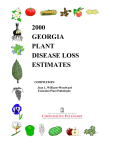 2000 Georgia Plant Disease Loss Estimates It is estimated that 2000 plant disease losses, including control costs, amounted to approximately $572.34 million. The value of the crops used in this estimate was $4.376 billion, resulting in a 13.07 percent total disease loss across all crops included in this summary. The estimated values for most crops used to compute these disease losses are summarized in: Georgia Agricultural Statistics Service, Georgia Farm Report Vol. 01, No. 4. Estimates for tobacco are based on Market News Service figures for growers net sales and do not include warehouse resales. Estimates for vegetables, strawberries, ornamentals, and turf rely on specialists knowledge of the industry and industry sources for information. THE FOLLOWING MEMBERS OF THE UNIVERSITY OF GEORGIA DEPARTMENT OF PLANT PATHOLOGY MADE DIRECT CONTRIBUTION TO THIS PUBLICATION: Paul Bertrand Tifton, GA 912-386-7495 Phil Brannen Athens, GA 706-542-2685 Tim Brenneman Tifton, GA 912-386-3371 Ed Brown Athens, GA 706-542-2685 Albert Culbreath Tifton, GA 912-386-3370 Barry Cunfer Griffin, GA 770-412-4012 Richard Davis Athens, GA 706-542-2685 Taft Eaker Athens, GA 706-542-9146 Robert Kemerait Tifton, GA 912-386-7495 David Langston Tifton, GA 912-386-7495 Dan Phillips Griffin, GA 770-412-4009 Jean Williams-Woodward Athens, GA 706-542-9146 1 2000 PLANT DISEASE CLINIC ANNUAL SUMMARY Extension Plant Pathology maintains three clinics as educational resources for county Extension agricultural faculty to use to aid their clients in diagnosing and correcting disease- and insect-related plant problems. Plant samples are submitted directly to the county Extension faculty who, at their discretion, forward samples to the appropriate clinic. Commercial turf, fruits, forage crops, greenhouse and ornamental nursery samples are sent to the Plant Disease Clinic in Athens. Diagnoses of and control recommendations for commercial samples of field crops, pecans and vegetables are handled by the Plant Disease Clinic at the Rural Development Center in Tifton, Georgia. All non-commercial plant samples are sent to the Homeowner IPM Clinic in Athens for disease and/or insect diagnoses and recommendations. Diagnoses and educational recommendations are returned to the county faculty. The clinics maintain a computerized database of samples and their diagnoses, as well as a reference library for use by Extension agents, specialists, researchers, and students. As in 1999, ornamentals (trees, herbaceous and woody ornamentals) and turf comprised most of the samples received in 2000. Total physical plant sample volume was 11.9 percent less than diagnosed in 1999 mostly due to a decrease in Homeowner samples. The reduction is most likely because of drought conditions throughout the state. The reduction may also be influenced by an increased use of the Distance Diagnostics through Digital Imaging (DDDI) program. Commercial sample number are and have been consistent over the years. CLINIC SUMMARIES: 2000 PLANT SPECIMEN DIAGNOSES Crop Commercial Samples Homeowner IPM Clinic: Disease Field Crops 244 Vegetables 399 101 500 Fruits & Nuts 73 61 134 Herbaceous Ornamentals 282 130 412 Woody Ornamentals 246 265 511 Trees 151 96 247 Turf & Forages 455 465 920 Miscellaneous 6 29 35 TOTAL 1856 1147 3003 2 Total APPLE Apples generally had low disease pressure in 2000 until late in the season. Fire blight was virtually nonexistent, with the exception of apples produced in south Georgia. The continuing drought conditions allowed for bot (white) rot cankers to increase, particularly in susceptible varieties such as Rome. This could continue to be a major problem over the next 2-3 years for non-irrigated production. Summer rots, particularly bitter rot, were of major concern as the season progressed. The appearance of a possible new, more aggressive Glomerella species was also cause for alarm; we will need to monitor for future outbreaks of this disease. Cost of control included increased pesticide usage for summer rots. Often, chemical fungicides did not adequately suppress disease. % Reduction in Crop Value Damage ($ Thousands) Cost of Control ($ Thousands) Total ($ Thousands) Fire Blight 0.1 2.6 80.0 82.6 Bitter Rot 5.0 130.3 131.0 261.3 Bot Rot 1.0 26.0 52.0 78.0 Black Rot 0.1 2.6 50.0 52.6 Alternaria Leaf Spot 0.1 2.6 --¹ 2.6 Powdery Mildew 0.1 2.6 18.0 20.6 Sooty Blotch 0.1 2.6 --¹ 2.6 Fly Speck 0.1 2.6 --¹ 2.6 Cedar Apple Rust 0.1 1.3 --¹ 1.3 Scab 0.1 1.3 1.7 3.0 Other Diseases 0.1 1.3 1.0 2.3 Total 6.8 176.0 331.0 507.0 Disease ¹ Controlled with fungicides applied for other diseases. Estimated by Phil Brannen, Extension Plant Pathologist 3 BLUEBERRY Blueberry production was up substantially in 2000, with a total production of 19,000,000 lbs. valued at $18.45 million. Mummy berry and rot diseases were observed at very low levels, largely due to dry conditions and good fungicide programs. Botrytis blight was essentially absent as no predisposing freezes occurred during bloom. In southern highbush cultivars, problems due to foliar diseases and dieback continued to increase. The southern highbush cultivars have incredible market potential, but the leaf spot disease and dieback will have to be addressed. % Reduction in Crop Value Damage ($ Thousands) Cost of Control ($ Thousands) Total ($ Thousands) Mummy Berry 1.5 283.9 500.0 783.9 Botrytis Blight 0.1 18.9 200.0 218.9 Foliar Disease 1.0 189.3 20.0 209.3 Dieback 1.0 189.3 10.0 199.3 Phytophthora Root Rot 0.5 94.6 10.0 104.6 Total 2.6 776.1 740.0 1516.1 Disease Estimate by Phil Brannen, Extension Plant Pathologist 4 BUNCH GRAPE Bunch grape production, predominantly wine grapes, has increased dramatically in the north Georgia area within the last 2-3 years. Disease pressure was low among bunch grape vineyards in 2000, with the exception of Pierce’s disease. Dry conditions resulted in very low rot pressure, and mildew pressure was also minimal. Pierce’s disease, caused by a bacterial pathogen, was o