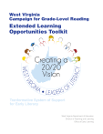 West Virginia Campaign for Grade-Level Reading IA • ERA VIR G IN LIT W EST Creating a 20/20 Vision CY Extended Learning Opportunities Toolkit LEADERS F O Tranformative System of Support for Early Literacy West Virginia Department of Education Division of Teaching and Learning Office of Early Learning West Virginia Campaign for Grade-Level Reading Extended Learning Toolkit WVBE Policy 2512: A Transformative System of Support for Early Literacy The provisions established by the refocusing of West Virginia Code §18-2E-10 have resulted in a repeal and replace of WVBE Policy 2512 (currently on public comment) to ensure county boards of education are provided a framework to support a transformative system of support for early literacy. This policy includes key national and other researched-based components of a comprehensive system to support early literacy development. The framework is inclusive of the components evidenced below: West Virginia’s Campaign for Grade Level Reading: A Transformative System of Support for Early Literacy Measurement and Support of Children’s Trajectory for 3rd Grade Literacy Proficiency A Systemic, Comprehensive Approach WV Early Learning Reporting System • Data reporting based on the formative assessment process • Family communication resources • Outcome resources for data-driven decision making • Comprehensive P-3 data profile • 3rd grade achievement gap data analysis High-quality, Standards-based instruction and learning • Personalized learning • Standards-focused instruction • Relationship between learning and teaching Emphasizing high-quality school readiness efforts Promoting early childhood school attendance Providing supports to eliminate summer learning loss Increasing family engagement Ensuring high-quality instruction and learning The infrastructure to develop and implement a state wide campaign to close the reading achievement gap is found in WVBE Policy 2512: • WVBE Policy 2512: Tranformative System of Support for Early Literacy • WV Leaders of Literacy: Campaign for Grade Level Reading 1 West Virginia Campaign for Grade-Level Reading Extended Learning Toolkit A Comprehensive Approach to Reading Success by the End of the Third Grade School Readiness Too many children from low-income families begin school already far behind. The research shows that these children are less likely to be read or spoken to regularly or to have access to books, literacy-rich environments, high-quality early care, and pre-k programs. As a consequence, these children may hear as many as 30 million fewer words than their middle-income peers before reaching kindergarten. Research also shows that such interactions are critical for language development, an important precursor to literacy. 61 percent of low-income children have no children’s books at home. The Attendance Gap A child’s vocabulary as early as age three can predict third grade reading proficiency. Too many children from low-income families miss too many days of school. Research has found that one in 10 kindergarten and first grade students nationwide misses nearly a month of school each year in excused and unexcused absences. By fifth grade, children with chronic absences who are from low-income families achieve lower academically. One in ten kindergarten students miss nearly a month of school every year. In some districts it runs as high as one in three. Summer Learning Loss Poor children hear as many as 30 million fewer words than their more affluent peers. Kindergarteners who miss 10 percent of school days have lower academic performance when they reach first grade. Among children from low-income families, who lack the resources to make up lost time, chronic absence in kindergarten translated into lower fifth grade achievement. Too many children lose ground over the summer months. Without access to the enriching activities available to more affluent peers, research shows that children from low-income families lose as much as three months of reading comprehension skills over the summer. By the end of fifth grade, they are nearly three grade levels behind their peers. Low-income students lose an average of more than two months in reading achievement in the summer, while their middle income peers tend to make gains in reading. By the end of the fifth grade, disadvantaged children are nearly three grade equivalents behind their more affluent peers in reading. Studies show 6-week summer learning programs can produce statistically significant gains in reading performance. Family Engagement Parents are the first teachers and most important advocates for their children. Research shows that students are most successful academically and socially when their parents are involved and engaged in their learning. Encouraging family engagement can help turn around the state’s achievement problems, starting with making significant progress against the milestone of grade-level reading by the end of third grade. Healthy Readers Learning begins at birth and healthy development greatly impacts children’s ability to learn. Children who are on track in their physical, social and emotional, cognitive, and verbal development are more successful learners from their earliest years, and they are more likely to become proficient readers by the end of the third grade. State Level Outreach and Professional Development The WVDE works with child and family advocates to help assure a seamless system of care, services, and supports from birth through third grade. This includes policy and practice that promotes children’s optimal social, emotional, and cognitive development; improves professional development for the early childhood education workforce, and supports parents as their children’s first teacher and best advocate. 2 West Virginia Campaign for Grade-Level Reading Extended Learning Toolkit Overview of the Extended Learning Toolkit The purpose of this toolkit is to provide support that encourages and assi