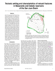 Tectonic setting and characteristics of natural fractures in Mesaverde and Dakota reservoirs of the San Juan Basin John C. Lorenz and Scott P. Cooper, Geophysical Technology Department 6116, MS 0750, Sandia National Laboratories, Albuquerque, NM 87185-5800 Abstract The Cretaceous strata that fill the San Juan Basin of northwestern New Mexico and southwestern Colorado were shortened in a generally north-south to north northeastsouth southwest direction during the Laramide orogeny. This shortening was the result of compression of the strata between southward indentation of the San Juan uplift at the north edge of the basin and northward to northeastward indentation of the Zuni uplift from the south. Right-lateral strike-slip motion was concentrated at the eastern and western margins of the basin to form the Hogback monocline and the Nacimiento uplift at the same time. Small amounts of shear may have occurred along pre-existing basement faults within the basin as well. Vertical extension fractures, striking north-south to north northeast-south southwest (parallel to the Laramide maximum horizontal compressive stress) with local variations, formed in both Mesaverde and Dakota sandstones under this system, and are found in outcrops and in the subsurface. The less-mature Mesaverde sandstones typically contain relatively long and irregular vertical extension fractures, whereas the underlying quartzitic Dakota sandstones contain more numerous, shorter, sub-parallel, closely spaced extension fractures. Conjugate shear fractures in several orientations are also present locally in Dakota strata. Introduction This paper has two objectives: 1) to provide a brief characterization of natural fractures that control the production of natural gas from sandstone reservoirs in Mesaverde and Dakota strata in the San Juan Basin, and 2) to reconstruct a plausible tectonic framework for the genesis of these fractures. The tectonic model presented here provides a basis for the extrapolation of fracture characteristics from outcrops and core to the subsurface and for the prediction of fracture characteristics in the subsurface. This paper is a shortened version of the report containing more of the supporting data (Lorenz and Cooper, 2001). Copies of the longer report can be obtained directly from the authors or are available from the U.S. Department of Commerce, National Technical Information Service, Springfield, VA, or online at www.osti.gov/bridge. Most of the published tectonic reconstructions of the San Juan Basin area focus on one or two of the structural elements that bound the basin. Those that examine February 2003, Volume 25, Number 1 FIGURE 1—Structure contour map of the inner or central section of the San Juan Basin. Contours are drawn on the top of the Upper Cretaceous Pictured Cliffs Sandstone, which overlies the Mesaverde Group. The basin is asymmetric with the northwest trending synclinal hinge near the northern edge of the basin. the entire basin (e.g., Kelley, 1957; Fassett, 1991; Laubach and Tremain, 1994) are primarily descriptive rather than attempting to interpret the kinematics of the important structures. We have re-examined the basic structural building blocks of the basin and have constructed an unconventional but plausible tectonic scenario for the postJurassic structural history of the San Juan Basin. Because the impetus behind this study was hydrocarbon reservoir characterization, our tectonic scenario was constructed to provide a framework that would explain the observed outcrop and subsurface natural fracture characteristics and that would permit a basic level of subsurface fracture prediction. Thus the paper presented below is an inversion of the normal procedure wherein fractures would be used as kinematic indicators and as firstlevel data in the reconstruction of a tectonic history. Nevertheless, fracture evidence and tectonic reconstruction are mutually supporting, and converge on the same conclusion that would have resulted from a more standard approach to the problem. NEW MEXICO GEOLOGY Location and general geology The San Juan Basin of northwestern New Mexico and southwestern Colorado is asymmetric, and has strata dipping gently to the north and northeast toward the offcenter synclinal hinge located near the Colorado–New Mexico state line (Fig. 1). Most of the hydrocarbon production from the San Juan Basin comes from an inner zone, approximately delineated by the outcrop belt of the Upper Cretaceous Pictured Cliffs Sandstone and separated from the peripheral areas by a relatively continuous hogback nearly 400 km (154 mi) long, consisting of gently dipping to near-vertical strata. As described below, however, despite the apparent continuity of this feature, this hogback does not have a common mechanical origin along its entire length. Lower Cretaceous strata crop out at the margins of the San Juan Basin and extend into the subsurface to depths as great as 2,000 m (6,562 ft), where they have been penetrated by thousands of naturalgas wells. Significant thicknesses of overburden strata were stripped from the surface of the basin in post-Cretaceous time. As much as 3 FIGURE 2—Extension and conjugate shear fractures as observed and created in laboratory compression tests (σ1—maximum principal stress; σ2 — intermediate principal stress; σ3—minimum principal stress; modified from Weijermars, 1997). 2,500 m (8,202 ft) of overburden may have been removed from northern parts of the basin (Bond, 1984). The previous deep burial and resulting high overburden stress accounts for horizontal stylolites that are locally common in Dakota sandstone cores. Fracture terminology For simplicity, breaks in rock will be described as either extension fractures or shear fractures within this paper, consistent with the terminology used within the petroleum industry. Extension fractures (also termed joints, or tensile fractures or dilation fractures or Mode I fractures: Pollard and Aydin, 