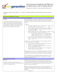 Next Generation Standards and Objectives for Mathematics in West Virginia Schools Descriptive Analysis of Second Grade Objectives Descriptive Analysis of the Objective – a narrative of what the child knows, understands and is able to do upon mastery. Operations and Algebraic Thinking Represent and Solve Problems Involving Addition and Subtraction M.2.OA.1 use addition and subtraction within 100 to solve oneand two-step word problems involving situations of adding to, taking from, putting together, taking apart and comparing, with unknowns in all positions, e.g. by using drawings and equations with a symbol for the unknown number to represent the problem. Word problems that are connected to students’ lives can be used to develop fluency with addition and subtraction. Table 1 describes the four different addition and subtraction situations and their relationship to the position of the unknown. Examples: Take From example: Terry had 63 stickers. He gave 37 to Betsy. How many stickers does Terry have now? 63 – 37 = Add To example: Bart had $37. His grandpa gave him some money for his birthday. Now he has $63. How much money did Bart’s grandpa give him? $37 + = $63 Compare example: Terry has 63 stickers. Denise has 37 stickers. How many more stickers does Terry have than Denise? 63 – 37 = o Even though the modeling of the two problems above is different, the equation, 63 - 37 = ?, can represent both situations (How many more do I need to make 63?) Take From (Start Unknown) Rob had some stickers. He gave 37 to Amber. Now he has 26 stickers. How many stickers did Rob have before? - 37 = 26 It is important to attend to the difficulty level of the problem situations in relation to the position of the unknown. Result Unknown, Total Unknown, and Both Addends Unknown problems are the least complex for students. The next level of difficulty includes Change Unknown, Addend Unknown, and Difference Unknown The most difficult are Start Unknown and versions of Bigger and Smaller Unknown (compare problems). Second graders should work on ALL problem types regardless of the level of difficulty. Mastery is expected in second grade. Students can use interactive whiteboard or document camera to demonstrate and justify their thinking. This standard focuses on developing an algebraic representation of a word problem through addition and subtraction --the intent is not to introduce traditional algorithms or rules. Add and Subtract within 20 M.2.OA.2 fluently add and subtract within 20 using mental strategies and by end of Grade 2, know from memory all sums of two one-digit numbers. This standard is strongly connected to all the standards in this domain. It focuses on students being able to fluently add and subtract numbers to 20. Adding and subtracting fluently refers to knowledge of procedures, knowledge of when and how to use them appropriately, and skill in performing them flexibly, accurately, and efficiently. Mental strategies help students make sense of number relationships as they are adding and subtracting within 20. The ability to calculate mentally with efficiency is very important for all students. Mental strategies may include the following: Counting on Making tens (9 + 7 = 10 + 6) Decomposing a number leading to a ten ( 14 – 6 = 14 – 4 – 2 = 10 – 2 = 8) Fact families (8 + 5 = 13 is the same as 13 - 8 = 5) Doubles Doubles plus one (7 + 8 = 7 + 7 + 1) However, the use of objects, diagrams, or interactive whiteboards, and various strategies will help students develop fluency. Work with Equal Groups of Objects to Gain Foundations for Multiplication M.2.OA.3 determine whether a group of objects (up to 20) has an odd or even number of members, e.g. by pairing objects or counting them by 2s and write an equation to express an even number as a sum of two equal addends. Students explore odd and even numbers in a variety of ways including the following: students may investigate if a number is odd or even by determining if the number of objects can be divided into two equal sets, arranged into pairs or counted by twos. After the above experiences, students may derive that they only need to look at the digit in the ones place to determine if a number is odd or even since any number of tens will always split into two even groups. Example: Students need opportunities writing equations representing sums of two equal addends, such as: 2 + 2 = 4, 3 + 3 = 6, 5 + 5 = 10, 6 + 6 = 12, or 8 + 8 =16. This understanding will lay the foundation for multiplication and is closely connected to 2.OA.4. M.2.OA.4 use addition to find the total number of objects arranged in rectangular arrays with up to 5 rows and up to 5 columns and write an equation to express the total as a sum of equal addends. The use of objects and/or interactive whiteboards will help students develop and demonstrate various strategies to determine even and odd numbers. Students may arrange any set of objects into a rectangular array. Objects can be cubes, buttons, counters, etc. Objects do not have to be square to make an array. Geoboards can also be used to demonstrate rectangular arrays. Students then write equations that represent the total as the sum of equal addends as shown below. 4 + 4 + 4 = 12 5 + 5 + 5 + 5 = 20 Interactive whiteboards and document cameras may be used to help students visualize and create arrays. Number and Operations in Base Ten Understand Place Value M.2.NBT.1 understand that the three digits of a three-digit number represent amounts of hundreds, tens and ones; e.g. 706 equals 7 hundreds, 0 tens and 6 ones and understand the following as special cases: a. 100 can be thought of as a bundle of ten tens – called a “hundred.” b. numbers 100, 200, 300, 400, 500, 600, 700, 800, 900 refer to one, two , three, four, five, six, seven, eight or nine hundreds (and 0 tens and 0 ones). Understanding that 10 ones make one ten and that 10 tens make one hundred is fundamental to students’ mathematical development. Students
