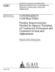 United States Government Accountability Office GAO Statement Before the Commission on Wartime Contracting in Iraq and Afghanistan For Release on Delivery Expected at 9:30 a.m. EST Monday, November 2, 2009 CONTINGENCY CONTRACTING Further Improvements Needed in Agency Tracking of Contractor Personnel and Contracts in Iraq and Afghanistan Statement of John P. Hutton, Director Acquisition and Sourcing Management GAO-10-187 Chairman Thibault, Chairman Shays, and Commissioners: Thank you for inviting me here today to discuss ongoing efforts by the Department of Defense (DOD), the Department of State (State), and the U.S. Agency for International Development (USAID) to track information on contractor personnel and contracts in Iraq and Afghanistan. Reliable, meaningful data on contractors and the services they provide are necessary to inform agency decisions on when and how to effectively use contractors, provide support services to contractors, and ensure that contractors are properly managed and overseen. The importance of such data is heightened by the unprecedented reliance on contractors in Iraq and Afghanistan and the evolving U.S. presence in the two countries. My statement focuses on (1) how information on contractor personnel and contracts can assist agencies in managing and overseeing their use of contractors and (2) the status of DOD, State, and USAID’s efforts to track statutorily-required information on contractor personnel and contracts in Iraq and Afghanistan, as well as our recent recommendations to address the shortcomings we identified in their efforts. This statement is drawn from our October 2009 report on contracting in Iraq and Afghanistan, 1 which was mandated by section 863 of the National Defense Authorization Act for Fiscal Year 2008 (NDAA for FY2008), 2 and a related April 2009 testimony. 3 Our prior work was prepared in accordance with generally accepted government auditing standards. Those standards require that we plan and perform the audits to obtain sufficient, appropriate evidence to provide a reasonable basis for our findings and conclusions based on our audit objectives. We believe that the evidence obtained provides a reasonable basis for our findings and conclusions based on our audit objectives. Background Section 861 of the NDAA for FY2008 directed the Secretary of Defense, the Secretary of State, and the USAID Administrator to sign a memorandum of 1 GAO, Contingency Contracting: DOD, State, and USAID Continue to Face Challenges in Tracking Contractor Personnel and Contracts in Iraq and Afghanistan, GAO-10-1 (Washington, D.C.: Oct. 1, 2009). 2 Pub. L. No. 110-181, § 863. 3 GAO, Contingency Contracting: DOD, State, and USAID Are Taking Actions to Track Contracts and Contractor Personnel in Iraq and Afghanistan, GAO-09-538T (Washington, D.C.: Apr. 1, 2009). Page 1 GAO-10-187 Contingency Contracting understanding (MOU) related to contracting in Iraq and Afghanistan. 4 The law specified a number of issues to be covered in the MOU, including the identification of common databases to serve as repositories of information on contract and contractor personnel. The NDAA for FY2008 required the databases to track at a minimum: • for each contract, • • • • a brief description of the contract, its total value, and whether it was awarded competitively, and for contractor personnel working under contracts in Iraq or Afghanistan, • • • total number employed, total number performing security functions, and total number who have been killed or wounded. In July 2008, DOD, State, and USAID signed an MOU in which they agreed the Synchronized Predeployment and Operational Tracker (SPOT) would be the system of record for the statutorily-required contract and contractor personnel information. The MOU specified SPOT would include information on DOD, State, and USAID contracts with more than 14 days of performance in Iraq or Afghanistan or valued at more than the simplified acquisition threshold, which the MOU stated was $100,000, as well as information on the personnel working under those contracts. While DOD is responsible for all maintenance and upgrades to the SPOT database, each agency agreed in the MOU to ensure that data elements related to contractor personnel, such as the number of personnel employed on each contract in Iraq or Afghanistan, are accurately entered into SPOT by its contractors. SPOT is designed to track contractor personnel by name and record information such as the contracts they are working under, deployment dates, and next of kin. Contract data elements, such as value and extent of competition, are to be imported into SPOT from the Federal Procurement Data System – Next Generation (FPDSNG), the federal government’s system for tracking information on contracting actions. 4 Pub. L. No. 110-181, § 861, as amended by Pub. L. No. 110-417, § 854 (2008). Page 2 GAO-10-187 Contingency Contracting Contractor and Contractor Personnel Information Can Help Agencies Address Management and Oversight Challenges The need for information on contracts and contractor personnel to inform decisions and oversee contractors is critical given DOD, State, and USAID’s extensive reliance on contractors to support and carry out their missions in Iraq and Afghanistan. We have reported extensively on the management and oversight challenges of using contractors to support contingency operations and the need for decision makers to have accurate, complete, and timely information as a starting point to address those challenges. Although much of our prior work has focused on DOD, the lessons learned can be applied to other agencies relying on contractors to help carry out their missions. The agencies’ lack of complete and accurate information on contractors supporting contingency operations may inhibit planning, increase costs, and introduce unnecessary risk, as illustrated in the following examples: • Limited visibility over contractors obscures how extensiv