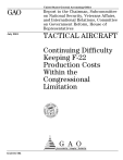 United States General Accounting Office GAO Report to the Chairman, Subcommittee on National Security, Veterans Affairs, and International Relations, Committee on Government Reform, House of Representatives July 2001 TACTICAL AIRCRAFT Continuing Difficulty Keeping F-22 Production Costs Within the Congressional Limitation GAO-01-782 Contents Letter 1 Appendix I Comments From the Department of Defense 13 Appendix II GAO Staff Acknowledgments 15 Related GAO Products 16 Tables Table 1: Comparison of Latest Air Force and Office of the Secretary F-22 Production Cost Estimates With the Congressional Cost Limitation Table 2: Comparison of Production Cost Estimates by the Air Force and the Office of the Secretary and the Impact of Cost Reduction Plans on These Estimates 7 8 Figures Figure 1: Examples of Progression of Production Cost Reduction Plans Page i 6 GAO-01-782 Tactical Aircraft United States General Accounting Office Washington, DC 20548 July 16, 2001 The Honorable Christopher Shays Chairman, Subcommittee on National Security, Veterans Affairs, and International Relations Committee on Government Reform House of Representatives Dear Mr. Chairman: The Air Force F-22 Raptor is designed to be an air superiority aircraft with an air-to-ground attack capability and is to replace F-15 fighter aircraft. Lockheed Martin Corporation and Pratt & Whitney Corporation are the contractors for the airframe and engine, respectively. Development of the aircraft, which started in 1991, is currently scheduled to be completed in September 2003, according to the Air Force. The Air Force had planned to award contracts to begin low-rate initial production in December 2000. However, award of a fully-funded contract for 10 low-rate initial production aircraft approved for fiscal year 2001 has been delayed at least until after completion of the President's review of Department of Defense (DOD) programs. The Air Force currently plans to procure 333 production aircraft through 2013. The cost of F-22 production is limited1 to $37.6 billion by the National Defense Authorization Act for Fiscal Year 19982, but the act does not specify the total number of aircraft to be procured. As requested, we updated information we provided to the Subcommittee in August 20003 on the Air Force's F-22 production program and the service's efforts to offset production cost increases through activities known as production cost reduction plans. Specifically, this report (1) identifies the amount of potential offsets attributable to production cost reduction plans by F-22 contractors, (2) compares the latest F-22 1 The cost limitation, as adjusted, is currently $37.6 billion for 333 aircraft and does not include $1.575 billion associated with six aircraft labeled Production Representative Test Vehicles that are excluded from the production cost limitation. Those aircraft are funded mostly with appropriations for Research, Development, Test and Evaluation as approved by the Congress. The production cost limitation does however, include about $200 million of costs related to those six aircraft. 2 P.L. 105-85, Nov. 18, 1997. 3 Defense Acquisitions: Recent F-22 Production Cost Estimates Exceeded Congressional Limitation (GAO/NSIAD-00-178, Aug. 15, 2000). Page 1 GAO-01-782 Tactical Aircraft production cost estimates completed by the Air Force and the Office of the Secretary of Defense with the congressional cost limitation and determines the extent to which cost reduction plans were considered in establishing these estimates, and (3) provides the status of DOD's actions to implement recommendations included in our August 2000 report concerning production cost estimates and cost reduction plans for the F-22 program. Results In Brief F-22 contractors and the Air Force have been developing cost reduction plans that are created to reduce costs by enhancing production technology, improving manufacturing techniques, and improving acquisition practices. The amount of cost reductions the contractors estimated to be achievable through production cost reduction plans has increased substantially since 1997. The contractors' estimated reductions in costs associated with these plans increased from $13.1 billion in January 1997, to $21 billion in mid-2000, to $26.5 billion in January 2001. In late 2000, both Air Force and the Office of the Secretary cost estimators projected that F-22 production costs would exceed the $37.6 billion congressional cost limitation if the Air Force were to procure 333 F-22s. Air Force cost estimators projected the likely cost at $39.6 billion4; the Office of the Secretary estimated the likely cost at $46.6 billion.5 Air Force and Office of the Secretary estimates differ mainly because their respective cost estimators made differing judgements about labor efficiency, engine costs, and the potential impacts of production cost reduction plans designed by F-22 contractors to reduce the production costs of F-22s. Cost estimators from the Air Force and Office of the Secretary both agree that many of the cost reduction plans will result in cost reductions. However, they do not agree on which of the plans are fully viable, or the amounts of cost reductions that will be generated. For example, the Office of the Secretary estimated that $1 billion less would be 4 Air Force cost estimators projected the costs for 331 aircraft at $38.5 billion. To arrive at the cost for 333 aircraft that are planned, $1.1 billion must be added for 2 production representative test aircraft and advance procurement for 6 production representative test aircraft approved for fiscal year 1999, making the projected cost $39.6 billion for 333 aircraft. 5 Briefing documents indicate that Office of the Secretary estimators projected the costs for 331 aircraft at $45.5 billion. To arrive at the projected cost for 333 aircraft that are planned, $1.1 billion must be added for 2 production representative test aircraft and advance procurement for 6 production representativ