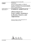 United States General Accounting Office GAO Testimony For Release on Delivery Expected at 10:00 a.m. EDT Friday, July 18, 2003 FOREIGN ASSISTANCE Before the Subcommittee on National Security, Emerging Threats, and International Relations, Committee on Government Reform, House of Representatives Observations on Post-Conflict Assistance in Bosnia, Kosovo, and Afghanistan Statement of Susan S. Westin, Managing Director International Affairs and Trade GAO-03-980T July 18, 2003 FOREIGN ASSISTANCE Highlights of GAO-03-980T, a testimony before the Subcommittee on National Security, Emerging Threats, and International Relations, House Committee on Government Reform The circumstances of armed conflicts in Bosnia, Kosovo, and Afghanistan differed in many respects, but in all three cases the United States and the international community became involved in the wars and post-conflict assistance because of important national and international interests. Over the past 10 years, GAO has done extensive work assessing postconflict assistance in Bosnia and Kosovo and, more recently, has evaluated such assistance to Afghanistan. GAO was asked to provide observations on assistance efforts in these countries that may be applicable to ongoing assistance in Iraq. Specifically, GAO assessed (1) the nature and extent of postconflict assistance in Bosnia, Kosovo, and Afghanistan; (2) essential components for carrying out assistance effectively; (3) challenges to implementation; and (4) mechanisms used for accountability and oversight. Observations on Post-Conflict Assistance in Bosnia, Kosovo, and Afghanistan Humanitarian assistance following armed conflict in Bosnia, Kosovo, and Afghanistanas well as in Iraqis part of a broader, long-term assistance effort comprising humanitarian, military, economic, governance, and democracy-building measures. While the post-conflict situations in these countries have varied, they have certain conditions in commonmost notably the volatile and highly politicized environment in which assistance operations take place. During years of work on post-conflict situations, GAO found that three key components are needed for effective implementation of assistance efforts: • • • a secure environment where humanitarian and other civilian workers are able to perform their tasks; a strategic vision that looks beyond the immediate situation and plans for ongoing efforts; and strong leadership with the authority to direct assistance operations. GAO also observed a number of challenges to implementing assistance operations, including the need for sustained political and financial commitment, adequate resources, coordinated assistance efforts, and support of the host government and civil society. Finally, GAO found that the international community and the United States provide a number of mechanisms for accountability in and oversight of assistance operations. World Food Program Assistance in Afghanistan www.gao.gov/cgi-bin/getrpt?GAO-03-980T. To view the full product, including the scope and methodology, click on the link above. For more information, contact Susan Westin at (202) 512-4128 or westins@gao.gov. Mr. Chairman and Members of the Subcommittee: I am pleased to be here today to discuss GAO’s observations on assistance efforts that followed military conflicts in Bosnia, Kosovo, and Afghanistan. Although circumstances differed in many respects, in all three cases the United States and the international community became involved in the military conflicts and post-conflict assistance efforts in pursuit of important national and international interests, such as the need to prevent conflict in the Balkans from destabilizing Europe or to combat terrorists and their supporters in Afghanistan. My comments today will cover observations on (1) the nature and extent of post-conflict assistance in these three locations; (2) the essential components for carrying out assistance effectively; (3) challenges to implementation; and (4) mechanisms used for accountability and oversight. My testimony is based primarily on GAO reports over the past 10 years on post-conflict assistance in Bosnia and Kosovo, and our recent report on post-conflict food aid and agricultural assistance to Afghanistan.1 (See app. I.) These comments should provide useful context in the subcommittee’s oversight of post-conflict assistance to Iraq. Summary Humanitarian assistance following armed conflict in Bosnia, Kosovo, and Afghanistan, as well as in Iraq, is part of a broader, long-term assistance effort comprising humanitarian, military, economic, governance, and democracy-building measures. The post-conflict situations in these locations have varied, but they have certain conditions in commonmost notably the volatile and highly politicized environment in which assistance operations take place. We found that a secure environment, a strategic vision, and strong leadership are the key components needed for effective implementation of assistance efforts. In addition, we observed a number of challenges to these efforts, including the need for sustained political commitment, adequate human and financial resources to carry out operations, coordinated assistance, and the support of the host government and civil society. Our work also showed that the international 1 U.S. General Accounting Office, Foreign Assistance: Lack of Strategic Focus and Obstacles to Agricultural Recovery Threaten Afghanistan’s Stability, GAO-03-607 (Washington, D.C.: June 30, 2003). Page 1 GAO-03-980T community and the United States provide a number of mechanisms for accountability and oversight with regard to assistance operations. Background In Bosnia, conflict raged from 1992 through 1995 and involved the Federal Republic of Yugoslavia, Croatia, and Bosnia’s three major ethnic groups. All were fighting for control of specific territories tied to each group’s definition of its own state. During this time an estimated 2.3 million people became refu