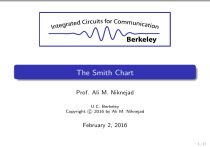 Berkeley The Smith Chart Prof. Ali M. Niknejad U.C. Berkeley c 2016 by Ali M. Niknejad Copyright February 2, 2016 1 / 27 The Smith Chart The Smith Chart is simply a graphical calculator for computing impedance as a function of reflection coefficient z = f (ρ) More importantly, many problems can be easily visualized with the Smith Chart This visualization leads to a insight about the behavior of transmission lines All the knowledge is coherently and compactly represented by the Smith Chart Why else study the Smith Chart? It’s beautiful! There are deep mathematical connections in the Smith Chart. It’s the tip of the iceberg! Study complex analysis to learn more. 2 / 27 0.1 0.39 0.4 0.38 0.11 0.12 0.13 0.36 5 0.9 1.2 0.7 1.4 0.8 -55 1.0 0 -5 -4 0.15 0.37 0.14 0.35 0.41 0.09 -4 0 0.34 0.6 0.4 3 0.0 7 1.6 -30 0.08 -35 CAP AC ITI VE -65 1.8 0.2 0.42 0.16 -60 0.5 2.0 1 0.3 0.17 -70 (-j 0.4 RE A CT AN CE CO M PO N EN T 6 0.6 0.0 0.8 4 1.0 RESISTANCE COMPONENT (R/Zo), OR CONDUCTANCE COMPONENT (G/Yo) 0.2 0.4 0.6 0.8 0.29 9 0.1 0.33 50 20 10 5.0 4.0 3.0 2.0 1.8 1.6 1.4 1.2 1.0 0.9 0.8 0.7 0.6 0.5 0.4 0.3 0.2 0.1 0.1 0.4 85 IND UCT IVE 0.8 0.6 80 0.2 20 10 0.04 0.46 1.0 RE AC TA 75 NC EC OM PO N EN T 0.2 90 0.3 -85 4.0 5.0 0.28 0.4 0.3 ) /Yo (-jB CE AN PT CE -75 US ES IV CT DU IN R O ), Zo X/ 1.0 0.22 0.3 8 -80 0.0 5 (+ jX /Z 0.4 20 10 20 50 0.25 0.26 0.24 0.27 0.25 0.24 0.26 0.23 0.27 REFLECTION COEFFICIENT IN DEG REES LE OF ANG ISSION COEFFICIENT IN TRANSM DEGR LE OF EES ANG 0.23 0.04 0.6 0.28 5 0.0 5 70 0.4 4 6 65 0.5 0.0 0.6 60 2.0 1.8 0.3 0.22 5 25 0.21 0.4 1.6 30 0.2 2 0.2 0.3 55 1.2 45 50 1.0 0.9 0.8 1.4 0.7 0.16 0.34 0.21 -20 0.4 0.0 —> WAVELE NGTH S TOW ARD 0.0 0.49 GEN ERA 0.48 TO R— 0.47 > 0.8 0.29 0.2 35 -25 0.35 0.3 0.49 0.48 D <— RD LOA TOWA THS 0.47 ENG VEL WA <— -90 1 0.1 40 0.1 Yo) jB/ E (+ NC TA EP SC SU 0.36 0.3 0.2 R ,O o) VE TI CI PA CA 0.37 9 0.4 1.0 3 0.4 0.13 0.38 3.0 7 0.12 4.0 0.0 0.4 -15 0.42 0.39 5.0 0.11 -10 0.1 50 0.08 0.09 0.41 0.1 0.46 An Impedance Smith Chart Without further ado, here it is! 0.14 0.15 0.33 0.17 2 0.1 8 0.4 3.0 15 10 3 / 27 Generalized Reflection Coefficient In sinusoidal steady-state, the voltage on the line is a T-line v (z) = v + (z) + v − (z) = V + (e −γz + ρL e γz ) Recall that we can define the reflection coefficient anywhere by taking the ratio of the reflected wave to the forward wave ρ(z) = v − (z) ρL e γz = = ρL e 2γz v + (z) e −γz Therefore the impedance on the line ... Z (z) = v + e −γz (1 + ρL e 2γz ) v + −γz (1 − ρL e 2γz ) Z0 e 4 / 27 Normalized Impedance ...can be expressed in terms of ρ(z) Z (z) = Z0 1 + ρ(z) 1 − ρ(z) It is extremely fruitful to work with normalized impedance values z = Z /Z0 z(z) = Z (z) 1 + ρ(z) = Z0 1 − ρ(z) Let the normalized impedance be written as z = r + jx (note small case) The reflection coefficient is “normalized” by default since for passive loads |ρ| ≤ 1. Let ρ = u + jv 5 / 27 Dissection of the Transformation Now simply equate the real (<) and imaginary (=) components in the above equaiton r + jx = (1 + u + jv )(1 − u + jv ) (1 + u) + jv = (1 − u) − jv (1 − u)2 + v 2 To obtain the relationship between the (r , x) plane and the (u, v ) plane 1 − u2 − v 2 r= (1 − u)2 + v 2 x= v (1 − u) + v (1 + u) (1 − u)2 + v 2 The above equations can be simplified and put into a nice form 6 / 27 Completing Your Squares... If you remember your high school algebra, you can derive the following equivalent equations r u− 1+r 2 + v2 = 1 (u − 1) + v − x 2 1 (1 + r )2 2 = 1 x2 These are circles in the (u, v ) plane! Circles are good! We see that vertical and horizontal lines in the (r , x) plane (complex impedance plane) are transformed to circles in the (u, v ) plane (complex reflection coefficient) 7 / 27 Resistance Transformations r=2 r=1 r=0 .5 r= 0 v u r r=0 r=.5 r=1 r=2 r = 0 maps to u 2 + v 2 = 1 (unit circle) r = 1 maps to (u − 1/2)2 + v 2 = (1/2)2 (matched real part) r = .5 maps to (u − 1/3)2 + v 2 = (2/3)2 (load R less than Z0 ) r = 2 maps to (u − 2/3)2 + v 2 = (1/3)2 (load R greater than Z0 ) 8 / 27 Reactance Transformations x v x=2 x=1 x = x=2 . 5 x=1 x=0 u r x = -1 -.5 x = -2 -2 x= x = -1 x = x = ±1 maps to (u − 1)2 + (v ∓ 1)2 = 1 x = ±2 maps to (u − 1)2 + (v ∓ 1/2)2 = (1/2)2 x = ±1/2 maps to (u − 1)2 + (v ∓ 2)2 = 22 Inductive reactance maps to upper half of unit circle Capacitive reactance maps to lower half of unit circle 9 / 27 Complete Smith Chart r>1 v match x=2 x=1 x = r= 0 .5 r=2 r=1 r=0 .5 open inductive u -.5 capacitive -2 x= = x = -1 x short 10 / 27 Reading the Smith Chart 11 / 27 Reading the Smith Chart load First map zL on the Smith Chart as ρL To read off the impedance on the T-line at any point on a lossless line, simply move on a circle of constant radius since ρ(z) = ρL e 2jβz 12 / 27 Motion Towards Generator wards generato nt to r me ve mo L CIRC E R W S load Moving towards generator means ρ(−`) = ρL e −2jβ` , or clockwise motion For a lossy line, this corresponds to a spiral motion We’re back to where we started when 2β` = 2π, or ` = λ/2 Thus the impedance is periodic (as we know) 13 / 27 SWR Circle wards generato nt to r me ve o m load Since SWR is a function of |ρ|, a circle at origin in (u,v) plane is called an SWR circle Recall the voltage max occurs when the reflected wave is in phase with the forward wave, so ρ(zmin ) = |ρL | This corresponds to the intersection of the SWR circle with the positive real axis Likewise, the intersection with the negative real axis is the location of the voltage min 14 / 27 Example of Smith Chart Visualization load Prove that if ZL has an inductance reactance, then the position of the first voltage maximum occurs before the voltage minimum as we move towards the generator Proof: On the Smith Chart start at any point in the upper half of the unit circle. Moving towards the generator corresponds to clockwise motion on a circle. Therefore we will