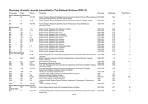 Summary of public records transmitted to The National Archives 2014-15 Lettercode Class Pieces Atomic Weapons Establishment ES 13 191-199 Class title Covering Metreage Total Pieces Atomic Weapons Research Establishment and successors: Directors Private Office papers and 1967-2000 successors: Registered Files (D, PDD and CE Series) Atomic Weapons Research Establishment and successors: Foulness outstation, reports 1924-1991 0.24 9 0.1 6 ES 17 13-18 ES 18 140-198 Atomic Weapons Research Establishment and Predecessors: Records Relating to Atmospheric Trials 1953-1994 0.55 59 7-17 14-17 5 11 7-11 2-4 25-38 28-35 1 1 1-3 4 7 17-24 British Council: Registered Files, Republic of Ireland British Council: Registered Files, Somalia British Council: Registered Files, Laos British Council: Registered Files, Cambodia British Council: Registered Files, Luxembourg British Council: Registered Files, Liberia British Council: Registered Files, Bulgaria British Council: Registered Files, Canada British Council: Registered Files, Moldova British Council: Registered Files, Belarus British Council: Registered Files, Congo Brazzaville British Council: Registered Files, Gibraltar British Council: Registered Files, Iceland British Council: Registered Files, Sweden 1967-1997 1970-1994 1995-1999 1991-1999 1970-1992 1970-1984 1966-1997 1964-1993 1992-1998 1992-1998 1973-1993 1980-1980 1982-1989 1947-1992 0.24 0.12 0.12 0.12 0.12 0.12 0.36 0.12 0.12 0.12 0.12 0.01 0.12 0.12 11 4 1 1 5 3 14 8 1 1 3 1 1 8 34-46 British Railways Board: Financial Planning Department and successors: National Route Code Catalogue British Transport Commission and British Railways Board: Financial Planning: Corporate Planning: Records British Railways: Rule Books Miscellaneous Papers and Records Rules and Regulations General Instructions and Appendices to Working Timetables: General Instructions to Staff Rules and Regulations General Instructions and Appendices to Working Timetables: Appendices to Railway companies Working Timetables Pullman Car Company Limited: Records Colchester, Stour Valley, Sudbury and Halstead Railway Company London and Brighton Railway Company Manchester and Milford Railway Company North London Railway Company: Records London and North Western Railway Company: Agreements, Conveyances, Contracts and Deeds Cambrian Railways Company 1070-1986 0.22 13 1968-1975 0.1 5 1945-1988 1928-1938 1939-1945 0.88 0.05 0.05 111 1 2 1932-1945 0.05 8 1923-1939 1846 1871 1860-1911 1886 1856 0.2 0.1 0.01 1.87 0.01 0.09 1 1 1 493 1 1 1993-1994 0.01 2 British Railways Board: Board and Committee Minutes and Papers 1997-2003 0.77 23 Civil Service Department: Machinery of Government Group: Machinery of Government (MG Series) Files 1982-1985 0.44 21 British Council BW 101 BW 127 BW 144 BW 152 BW 155 BW 175 BW 18 BW 20 BW 200 BW 201 BW 203 BW 33 BW 37 BW 57 British Railways Board AN 159 AN 200 496-500 AN RAIL RAIL 94 1057 1135 452-563 3781 565-566 RAIL 1136 123-130 RAIL RAIL RAIL RAIL RAIL RAIL 1204 124 386 456 529 791 103 4 166 29-521 238 615 RAIL 92 152-153 British Railways Board (Residuary) Ltd AN 167 1330-1352 Cabinet Office BA 17 1341-1361 1 of 30 Lettercode Class Pieces BA CAB CAB CAB CAB 27 128 129 130 133 643-653 83-84 220-221 1277-1310 538-540 Class title Covering Metreage Total Pieces Civil Service Department: Superannuation Group: Registered Files (S series) Cabinet: Minutes (CM and CC Series) Cabinet: Memoranda (CP and C Series) Cabinet: Miscellaneous Committees: Minutes and Papers (GEN, MISC and REF Series) Cabinet Office: Commonwealth and International Conferences and Ministerial Visits to and from the UK: Minutes and Papers (ABC and other Series) CAB 134 4864-4951 Cabinet: Miscellaneous Committees: Minutes and Papers (General Series) CAB 148 245-255 Cabinet Office: Defence and Oversea Policy Committees and Sub-Committees: Minutes and Papers (DO, DOP, OPD and OPDO Series) CAB 152 174-175 Cabinet Office: Social Services Co-ordinating Staff: Files CAB 163 436-454 War Cabinet, Ministry of Defence, and Cabinet Office: Central Intelligence Machinery: Joint Intelligence Sub-Committee, later Committee: Secretariat: Files CAB 164 1744-1791 Cabinet Office: Subject (Theme Series) Files CAB 165 1162-1165 Cabinet Office: Committees (C Series) Files CAB 192 32 Cabinet Office: Government Signals Planning Staff, Communications (G Series) Files CAB 193 428-464 Cabinet Office: European Unit Files (K series) CAB 318 22-25 Cabinet Office: Security Procedures and Practices in the Public Service Records CAB 318 26-40 Cabinet Office: Security Procedures and Practices in the Public Service Records HO 322 1034-1045 Home Office: Civil Defence (Various Symbol Series) Files HO 322 1049-1090 Home Office: Civil Defence (Various Symbol Series) Files HO 322 1091-1143 Home Office: Civil Defence (Various Symbol Series) Files HO 353 102-110 Home Office: Police, War Emergency Matters (WEM Symbol Series) Files HO 393 72 Home Office: UK Warning and Monitoring Organisation (WMO Symbol Series) Files Certification Office for Trade Unions and Employers' Associations CL 3 1062-1220 Certification Office for Trade Unions and Employers' Associations: Annual Return Files Civil Aviation Authority DR 18 55-82 Air Registration Board, and Civil Aviation Authority, Airworthiness Division: Flight Test Reports 1983-1986 1986 1986 1985 1985 0.22 0.11 0.11 0.88 0.11 11 2 2 34 3 1984-1986 1985 3.12 0.33 88 11 1968-1971 1979-1985 0.11 0.88 2 19 1981-1985 1982-1985 1984-1985 1981-1985 1984-1985 1983-1986 1982-1984 1959-1985 1949-1986 1982-1985 1974-1985 1.21 0.11 0.11 1.32 0.11 0.44 0.22 0.7 0.99 0.11 0.1 48 4 1 37 4 15 12 42 53 9 1 1971-2012 3.1 159 1962-1982 0.88 28 DR 45 23-30 1984-1986 0.3 8 DR 47 13-47 1979-1982 0.22 35 1984-1988 0.05 2 1985-1993 0.36 14 1969-1989 2.58 90 1986 0.01 1 1986-1989 0.05 2 1980-1987 2.7 64 1990-1992 0.05 2 National Air Traffic Services' Management Support Unit and Environmental Adviser and predecessors: Registered Files (8/SB and other series) Civil Aviati
