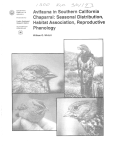 3 Un~tedStates Department of AgrlCUitUre oreservlce Pacific Southwest Researchstation Research Paper PSW-RP-209 Avifauna in Southern California Chaparral: Seasonal Distribution, Habitat Association, Reproductive Phenology William 0.Wirtz II Wirtz, Willia~n0..11. 1991. Avifaunn in soulhcrn California chaparral: scasanal distribution, habitat association, rcpraductivc phcnology. Rcs. Papcr PSW-RP-209. Berkeley, CA: Pacific Soulhwesl Research Station, Favcst Service. U.S. Department of Agriculture; 19 p. Dals were obtained between February 1969 and Octobel. 1979 an thc se;sonal occurrence, lvilbitilt asso~latio~l. ieproductivephcnalogy, and rclativc nbu~tdanccofnvifauna at two study sitcs in thcchaparral comnn~lnilyofthe San Gabricl Mountains of southern California. The purpose ofthe study was to collect infa~.mationon b i d specics uscof this habitat and to documcnr ch.anges in the bird community over a 30.year period. During the stody, 128 species rcprcsenting 36 families were noted: 99 in lower clcvalion (914 to 1280 m) chaparral and I I0 at a higher clcvalion (1400m)chapurml-ycllowpincccolo~~esite.Eighty-wospccieswereabscrvcdatbotl~sites. Residenacolnprised35.4 pcrcc~ltofthepopulationatll~elowel-elcvatiansitea~~d25.4percentatthehighersite. Vagl.antscornprised 18.2percenl of the popt~larian1the lower site aud 23.6 peltent at the higher site. Insects are consumed by 66.7 percent of all avifitiluna observcd in the chonarml. and seeds bv 32.6 oercent. Fou~.teensoecies reoorted earlier (1936-1913) at the ~ ~ C S C a~ stllnmncy I S of I I years ordata on nbundance at hoth IocuUans. Ren-iuvril Terazr: hird community, seiisansl distribution, avifauna. chaparrill, San Gabriel Mountains, soutBcl.n Califainin The Author: WILLIAM 0. WlRTZ 11, is Professor of Biology. Pobnann Callcge, Clal.ernon1, California, and a Station coopemtor. This paper waspresenledat theSymposiumon IheClassificationand DistribotionafCvliforniaChapnrral Ecosystems, held in coi~junclionwith the 60th Annual Meeting, Wcslern Society of Naturalists, December 28. 1979, Pornonu. California. It ha since then bccn rcviscd and updntcd. Acknowledgments: 1 thank the Pacific Southwest Research Station, USDA Forest Service, for financial support for research in the San Dilnas Experimcnlal Forest since 1974, Project Leadcrs Raymond M. Rice, C. Eugene Conrad, Paul H. Dunn, and Susan G. Conard fol.lheir continued support and cooperalion, and Charles G. Colver ibr special support of field workover 820-year period. Observations at MI. Billdy wcremadeprimwily on the Chapman Ranch, nndIespccially thank Pat and Bob Chapman far permission to use this ncea. Many presenland rormer stude~tlshave aided with field work, especially sttldenrs or terrestrial ecology in 1976. Special thanks are duc Helcn Winz for be). participation in 7 yen13 of lield work and for data analysis. Charles T. Collins, California State University, Long Beach, and Daniel A. Guthrie, Clal.ernont McKenoa College. Clnremont, California, provided helpful criticisms of the manuscript. Cover plroros clockwise from top right: Rcd-lsiled Hawk, For Spunow, Rurous-crowned Sparrow, Brown Towhee. Photos by Helen Wirtz. Publisher: Pacific Southwest Research Station P.O. Box 245, Berkeley, California 94701 July 1991 Q U.S. RinW OKja: 1992.687562 Avifauna in Southern California Chaparral: Seasonal Distribution, Habitat Association, Reproductive Phenology William 0.Wirtz II Contents .. ......................................................................................................................................... Introduction ................................................................................................................................ 1 Study Areas ................................................................................................................................. 1 Methods ....................................................................................................................................... 2 Results .......................................................................................................................................... 3 Discussion and Collclusions ....................................................................................................... 4 References.................................................................................................................................... 5 Appendix ...................................................................................................................................... 6 In Brief USDA Forest Service Res. PilpeiPSW-RP309. 1991 11 In Brief. .. Wirtz, William 0 . . 11. 1991. Avifauna in southern California chaparral: seasonal distribution, habltat association, reproductivephenology. Res.PaperPSWRP-209. Berkeley, CA: Pacific Southwest Research Station, Forest Service, U.S. Department of Agriculture; 19 p. Retricvnl Tertits: bird community, seasonal distribution, avifauna, chapaural, Sari Gabriel Mountains, southern California Relatively little information is available concerning the avifauna of the chaparral co~n~nunities of the San Gabriel Mounlains of southern California. A checklist of the birds of the San Dimas Experi~nentalForest, on the south side of the San Gabriel Mountains in Los Angeles County, covering the period 193642, and a later compilation published in 1981 summarize all known inforniatio~ion southern California birds. To provide current information on bird species and to docutnent changes over the 30-year period since that earlier checklist was compiled, the relative abundance, habitat association, reproductive phenology, and seasonal occurrence of avifauna were studied in the San Dimas Experimental Forest from February 1969 to Septeinber 1979 and near Mt. Baldy Village FromJanuary 1973 to October 1979. The 128 species noted represent 36 families; 99 species were in the lowerelevation (914-1280 m) chaparral of the S a ~Di~iias i Expelimental