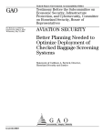 United States Government Accountability Office GAO Testimony Before the Subcommittee on Economic Security, Infrastructure Protection, and Cybersecurity, Committee on Homeland Security, House of Representatives For Release on Delivery Expected at 2:00p.m. EDT Wednesday, July 13, 2005 AVIATION SECURITY Better Planning Needed to Optimize Deployment of Checked Baggage Screening Systems Statement of Cathleen A. Berrick, Director, Homeland Security and Justice GAO-05-896T July 2005 AVIATION SECURITY Accountability Integrity Reliability Highlights Highlights of GAO-05-896T, a testimony before the Subcommittee on Economic Security, Infrastructure Protection, and Cybersecurity, Committee on Homeland Security, House of Representatives Better Planning Needed to Optimize Deployment of Checked Baggage Screening Systems Why GAO Did This Study What GAO Found Mandated to screen all checked baggage using explosive detection systems at airports by December 31, 2003, the Transportation Security Administration (TSA) deployed two types of screening equipment: explosives detection systems (EDS), which use computer-aided tomography X-rays to recognize the characteristics of explosives, and explosives trace detection (ETD) systems, which use chemical analysis to detect traces of explosive material vapors or residues. This testimony discusses (1) TSA’s deployment of EDS and ETD systems and the impact of initially deploying these systems, (2) TSA and airport actions to install EDS machines inline with baggage conveyor systems, and the federal resources made available for this purpose, and (3) actions taken by TSA to optimally deploy checked baggage screening systems. TSA has made substantial progress in installing EDS and ETD systems at the nation’s more than 400 airports to provide the capability to screen all checked baggage using explosive detection systems, as mandated by Congress. However, in initially deploying EDS and ETD equipment, TSA placed stand-alone ETD and the minivan-sized EDS machines—mainly in airport lobbies—that were not integrated in-line with airport baggage conveyor systems. TSA officials stated that the agency’s ability to initially install in-line systems was limited because of the high costs and the time required for airport modifications. These interim lobby solutions resulted in operational inefficiencies, including requiring a greater number of screeners, as compared with using EDS machines in-line with baggage conveyor systems. What GAO Recommends In a prior report, GAO recommended that TSA systematically evaluate baggage screening needs at airports, including identifying the costs and benefits of installing in-line EDS systems or stand-alone EDS machines in lieu of ETD machines, and prioritizing those airports where TSA would benefit by such actions. DHS generally concurred with the recommendations and described its corrective actions to address the issues identified. TSA and airport operators are taking actions to install in-line baggage screening systems to streamline airport and TSA operations, reduce screening costs, and enhance security. Eighty-six of the 130 airports we surveyed either have, are planning to have, or are considering installing full or partial in-line systems. However, resources have not been made available to fund these capital-intensive systems on a large-scale basis. Also, the overall costs of installing in-line baggage screening systems at each airport are unknown, the availability of future federal funding is uncertain, and perspectives differ regarding the appropriate role of the federal government, airport operators, and air carriers in funding these systems. TSA has not conducted a systematic, prospective analysis to determine at which airports it could achieve long-term savings and enhanced efficiencies and security by installing in-line systems or, where in-line systems may not be economically justified, by making greater use of stand-alone EDS systems rather than relying on the labor-intensive and less efficient ETD screening process. However, at nine airports where TSA has agreed to help fund the installation of in-line baggage screening systems, TSA conducted a retrospective cost-benefit analysis which showed that these in-line systems could save the federal government about $1 billion over 7 years. TSA further estimated that it could recover its initial investment in the in-line systems at these airports in a little over 1 year. EDS and ETD Machines Used by TSA to Screen Checked Baggage www.gao.gov/cgi-bin/getrpt?GAO-05-896T. To view the full product, including the scope and methodology, click on the link above. For more information, contact Cathleen A. Berrick at (202) 512-3404 or berrickc@gao.gov. United States Government Accountability Office Mr. Chairman and Members of the Subcommittee: I appreciate the opportunity to participate in today’s hearing on leveraging technology to improve aviation security, and to discuss our work on the Transportation Security Administration’s (TSA) deployment of checked baggage screening systems. After the terrorist attacks of September 11, 2001, which highlighted the vulnerability of U.S. aircraft to acts of terrorism, Congress passed and the President signed into law the Aviation and Transportation Security Act (ATSA), mandating, among other things, that all checked baggage at U.S. airports be screened using explosive detection systems by December 31, 2002.1 To meet this requirement, the Transportation Security Administration (TSA) deployed two types of equipment to screen checked baggage for explosives: (1) explosives detection systems (EDS) that use specialized x-rays to detect characteristics of explosives that may be contained in baggage as it moves along a conveyor belt; and (2) explosive trace detection (ETD) systems, whereby an individual (i.e., a baggage screener) swabs baggage and then inserts the swab into the ETD machine, which in turn can detect chemical residues that may indicate the pr
