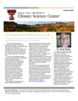 Featured Publication: Vanos, Jennifer K., Hebbern, Christopher, Cakmak, Sabit.“Risk assessment for cardiovascular and respiratory mortality due to air pollution and synoptic meteorology in 10 Canadian cities.” Environmental Pollution: 185. (2014): 322-­‐332. http://goo.gl/rGttPB 1 October Climate Science Seminar Speakers Dr. Mark Stoll Dr. Paxton Payton Dr. Venki Uddameri History and Environmental Studies Texas Tech University “The Historical Roots of Evangelical Denial of Global Warming” USDA-­‐ARS Cropping Systems Research Laboratory “Weather Event Influences on Population Growth of Quail” Civil and Environmental Engineering Texas Tech University “A Tale of Two Aquifers in Texas” Dr. Payton’s research laboratory looks at Dr, Stoll’s defines evangelicals as those crop management specifically related to who believe in doctrinal purity, water, and what genetic and bio-­‐