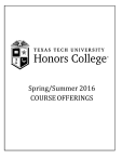 Spring/Summer 2016 COURSE OFFERINGS ADMISSION TO HONORS COURSES Honors courses are designed, first of all, for Honors College members. However, any TTU student with a GPA of 3.0 or better is eligible to enroll in Honors courses as space permits. For more information, contact: Honors College, McClellan Hall Room 103, (806) 742-1828; honors@ttu.edu GRADUATION WITH HONORS DESIGNATIONS Students must complete 24 hours in Honors courses to graduate from Texas Tech University with the transcript designation “with Honors.” See the Honors College Student Handbook on the web for more details. A student who wishes to graduate with the transcript designation “with Highest Honors” must complete an Honors Thesis and 30 hours of Honors coursework. Permission from the Honors College is required before beginning the Honors Thesis. Students must maintain a 3.25 cumulative grade point average both to remain in the Honors College and to graduate with either of these Honors designations. Students intending to graduate with either designation must file an “Intent to Graduate” form with the Honors College about one year prior to the graduation date. Honors College designations are listed on the transcript and the diploma. These are in addition to other distinctions graduates may earn, such as Magna Cum Laude. Important Note: All non-science majors MUST take an Honors lab science prior to graduation. Times, room numbers, and other course information are subject to change. Be sure to print your schedule from the Web for Students for current course information. 2 Dear Honors Student, Welcome to the Honors College course offerings booklet for the Spring 2016 and Summer 2016 semesters. Believe it or not, it is time to begin working on your spring 2015 schedule! Honors students can begin registering via the web on Friday, November 6th (Honors seniors may register on Thursday, November 5th.) Honors Seniors and Juniors will, for the most part, be exempted from mandatory advising this semester, although some may receive an email asking them to come in to discuss completion of their Honors credit hours. Exempt upperclassmen should request Honors course permits by emailing a Permit Request Form (currently found at the top of the Spring 2016 Course Listing page online) to an Honors advisor as early as possible, for best chance of reserving a seat in requested classes. All upperclassmen will receive an email from an Honors advisor notifying them of their advising status; all other students will be expected to schedule an advising appointment. Honors advising is mandatory for all Honors Freshmen and Sophomores, and your Honors registration hold will not be moved forward until you are advised in our office. Honors advising will begin on Tuesday, October 6th, with the following schedule (credit hours as of August 2015): • • • Seniors and Juniors (60+ hrs.) Sophomores (30-59 hrs.) Freshmen (0-29 hrs.) October 6-15 October 16-22 October 23-November 4 Advising appointments are limited, and permits into Honors courses are given on a first-come, first-served basis. Therefore, it is important to make your appointment as early as possible. Students will receive an email from the Honors College providing a link to our online scheduling tool, Genbook, which should be used for scheduling appointments. Genbook will be audited daily to ensure that all students’ appointments are made during the appropriate dates for their classification. Unauthorized appointments will be cancelled. PLEASE DO NOT CALL TO MAKE YOUR APPOINTMENT. A list of all university classes to be offered in the spring term is available for students in the MyTech tab of Raiderlink (www.raiderlink.ttu.edu). Please review both this booklet and the Tech course schedule before your advising appointment and have a preliminary schedule prepared for your advising session. Your advising session will go quickly and smoothly if you will: Come prepared! Students without tentative schedules (including times/days of classes) will be asked to reschedule their advising appointments. Review the university spring schedule on the web to prepare a schedule prior to your advising appointment, and complete the tracking sheet appropriate to your major. If you have any questions concerning your degree requirements or additional registration holds, schedule an appointment with your primary academic advisor prior to your visit with us. Arrive on time. Since your appointment will only be scheduled for a limited time period, it is imperative that you arrive on time and prepared. If you arrive for your appointment too late to fit into an advisor’s schedule, you will be rescheduled for November 9th or later. Cancel your appointment beforehand if you are unable to make it. Any student who fails to notify us that he or she will miss an advising appointment will be rescheduled for November 9th or later. Remember that registration for spring courses must be completed on the web. Thus, if you do not know your e-raider password, you should call the IT Help Desk (742-HELP) prior to November 5th to ensure that your registration will be trouble-free. Happy scheduling! -Honors College Advisors 3 FULL/CLOSED courses are listed in red text. Once a course is full, the course is closed. Students may elect to be placed on a waitlist for a closed course. SPRING 2016 COURSE OFFERINGS ACCT 2301-H01 Managerial Accounting (CRN #45940) Prof. K. Bigbee MWF 9:00-9:50 AM Prerequisite: ACCT 2300 with a grade of B- or better and 3.0 GPA. Uses of accounting information for planning decisions about products and services, activities and processes, suppliers and customers, organizational subunits, and time periods, as these relate to organizations in changing environments. ANSC 3405-H01 ANSC 3405-H51 Advanced Physiology of Animals No Credit Lab (CRN# 54390) (CRN# 54393) Prof. J. Neary R 12:30-3:20 PM R 3:30-5:20 PM Prerequisite: ANSC 2202 and Honors student status or consent of instructor. Physiology of dome