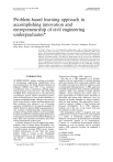 Int. J. Engng Ed. Vol. 21, No. 2, pp. 228±232, 2005 Printed in Great Britain. 0949-149X/91 $3.00+0.00 # 2005 TEMPUS Publications. Problem-based learning approach in accomplishing innovation and entrepreneurship of civil engineering undergraduates* K. W. CHAU Department of Civil & Structural Engineering, Hong Kong Polytechnic University, Hunghom, Kowloon, Hong Kong. E-mail: cekwchau@polyu.edu.hk A distinct feature of the civil engineering undergraduate study of Hong Kong Polytechnic University is a major assessment exercise in the form of a problem-based learning (PBL) group project. With the imminent implementation of an outcome-based accreditation assessment by the Hong Kong Institution of Engineers, student performance on this project can become a significant indicator of learning outcomes. This final year group project can be viewed as the culminating learning experience of the engineering program and the quality of student output can be used as an indicator of the quality of the program as a whole. In this paper, the approach and attitude to the layout, management and assessment of this engineering project are presented. The experience gained in the operation of the project is shared. The evaluation by its key stakeholders, which are students, preceptors and employers, is also highlighted. The results authenticated that this PBL approach could accomplish innovation and entrepreneurship of civil engineering undergraduates. Problem-based learning (PBL) approach The aim of a PBL approach is to provide students with the opportunity to develop learning skills and attitudes that would equip students with the skills to become more effective students as well as independent lifelong learners. A PBL approach normally incorporates three categories of learning: cognitive; skills; and, attitudes. It helps enhance students' critical thinking and allows them to have opportunities to function more effectively in discussion and group work. Moreover, they are directed to develop attitudes on taking responsibility for their learning. This innovation is anticipated to empower students in their learning and personal development. In a PBL approach, students are in the core of the system and take the initiative in their learning. The pedagogical system is designed such that students have to learn on their own, and teaching is a matter of facilitating students' learning. Students' assessment is by performance in tutorials and coursework instead of by examinations. Contrary to a traditional lecture-based method, minimum or even no lectures will be arranged under a PBL approach. Instead, the emphasis is placed on: INTRODUCTION IN HONG KONG, quality assurance procedures of professional engineering qualification have been monitored by the Hong Kong Institution of Engineers (HKIE) since 1997. It has conducted accreditation visits to institutions offering engineering programs every five years. The recent shift of HKIE from content-based to outcomes-based accreditation process allows educational institutions in Hong Kong to have greater flexibility of program curriculum design. However, they need to put in extra efforts to assess and demonstrate that their graduates have achieved a set of learning outcomes established for the specific discipline by HKIE. Moreover, generic skills comprising innovation, business, entrepreneurship, communication, problem-solving and the ability to work successfully in teams are important. Engineering programs have to incorporate exercises that furnish development of these skills and assessment procedures that fairly reward achievement in these areas. A distinct feature of the civil engineering undergraduate study of Hong Kong Polytechnic University is a major assessment exercise in the form of a problem-based learning (PBL) group project. Student performance on this final year group project, which is viewed as the culminating learning experience of the engineering program, can become a significant indicator of learning outcomes. . . . . . syllabus design; problem or case writing; tutorial; group discussion; assessment. A case is designed for a small group of students to * Accepted 26 October 2004. 228 Problem-based learning approach in accomplishing innovation and entrepreneurship solve. Students are expected to identify and fulfill their own learning objectives, through gleaning knowledge with all available resources from the library or the Internet. Woods [6, 7] suggested several tasks for students to work through during the process: . . . . . . . . . . . . . explore the problem; create hypotheses; identify issues; formulate a trial solution; identify the requisite knowledge; prioritize the learning needs; allocate resources; identify tasks of team members; search for knowledge; share the new knowledge; formulate an updated solution; give feedback on effectiveness; reflect on the process. PBL has been employed in a variety of subject areas, particularly in the medical field [1, 5]. During the past few years, there is a substantial amount of research and educational efforts in PBL in the engineering domain. Feland and Leifer [3] summarized a method for volatility measurement as an assessment instrument for design team performance prediction within the PBL environment. Cockayne et al. [2], delineated the development of the classification and its application in a comprehensive problem-based learning program. Fruchter and Lewis [4] addressed the Architecture/ Engineering/ Construction (A/E/C) industry's need to broaden the competence of engineering students to utilize the acquired theoretical knowledge and understand the role of discipline-specific knowledge in a multi-disciplinary A/E/C (PBL)-B-5 learning environment. Zolin et al. [8] presented key characteristics of a problem-based learning environment that determines its suitability as a data source for work-related research studies. It is worthwhile to share the experience how PBL works as a group project in an engineering domain.