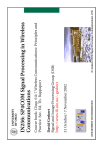 DEPARTMENT OF INFORMATICS 31 October/ 7 November 2002 D. Gesbert: IN256 Signal Processing 4 Communications1 of 50 David Gesbert Signal and Image Processing Group (DSB) http://www.ifi.uio.no/~gesbert Course book: Chap. 6 & 7 Wireless Communications: Principles and Practice. Sec. Ed. Th. Rappaport IN256: SP4COM Signal Processing in Wireless Communications UNIVERSITY OF OSLO DEPARTMENT OF INFORMATICS D. Gesbert: IN256 Signal Processing 4 Communications2 of 50 Comparing to this intro course, the supporting book is far more detailed. For the sake of clarity, not all book notations are used or followed here. This set of slides contains an introduction to the theory and practice of digital transmission over wireless systems. The substance of the course is adjusted to fit into 4x45min. Important disclaimer UNIVERSITY OF OSLO DEPARTMENT OF INFORMATICS • Diversity • Equalization • Demodulation • Wireless propagation modeling 7 November (2hrs): D. Gesbert: IN256 Signal Processing 4 Communications3 of 50 • Pulse shaping and Nyquist criterion • Digital linear modulations • Generic communication chain • Introduction: Motivations and definitions 31 October (2hrs): Outline UNIVERSITY OF OSLO DEPARTMENT OF INFORMATICS FDD: Frequency division duplex MOS: Mean opnion score (voice quality) ML: Maximum likelihood estimation i.i.d.: identically independent distribution ISI: Intersymbol interference EIRP: Equivalent Isotropic Radiated Power GSM: Global System for Mobile 3G: Third Generation Wireless GPRS: General Packet RadioServices extension of GSM to data MIMO: Multiple input multiple output BER; Bit Error Rate CCI: Co−channel interference D. Gesbert: IN256 Signal Processing 4 Communications4 of 50 TDD: Time division duplex BWA: Broadband wireless access ZF: Zero Forcing inversion TX: Transmit SU: subscriber unit (Mobile) SNR: Signal to noise ratio SINR: Signal to noise+interference ratio SIMO: Single input multiple output RX: Receive MISO: Multiple input Single output MMSE: Minimum mean square error BTS: Base Station Transceiver Definitions and acronyms UNIVERSITY OF OSLO DEPARTMENT OF INFORMATICS optimized constraint D. Gesbert: IN256 Signal Processing 4 Communications5 of 50 Broadband MIMO Channel Models Physical Layer Link Layer Transport/Network (TCP/IP) SYSTEM LAYER Using signal processing to optimize performance... Example: Wireless Internet System UNIVERSITY OF OSLO DEPARTMENT OF INFORMATICS D. Gesbert: IN256 Signal Processing 4 Communications6 of 50 Examples of applications: Signal processing is a key component in a wide range of communications systems: GSM (SMS, voice), DECT (cordless phones), WCDMA, WiFi, ...and wired systems: DSL, ISDN, and many more.... Goal: “To use signal processing techniques in order to maximize data rates (Bits/Sec), spectrum efficiency (Bits/Sec/Hz), and quality (minimize Bit Error Rate) for transmission over digital communications mediums” (for example: wireless medium) Motivations UNIVERSITY OF OSLO DEPARTMENT OF INFORMATICS D. Gesbert: IN256 Signal Processing 4 Communications7 of 50 • Forward Error Coding (or ”channel coding”): Redundancy is added to the source in order to protect from random bit errors occurring during transmission (due to noise). • Source coding and compression: the analog (e.g. speech) or digital source (e.g. internet data) is digitized and/or compressed to occupy the least amount of resource for transmission (time/frequency/power). Redundancy is minimized/eliminated. Signal processing’s main functions at the physical (PHY) layer: Functional Blocks and Definitions UNIVERSITY OF OSLO DEPARTMENT OF INFORMATICS D. Gesbert: IN256 Signal Processing 4 Communications8 of 50 • Carrier modulation: The pulse-shaped symbol signal is up converted to the desired carrier frequency. The signal is fed to the antenna. • Pulse shaping: Each symbol is transmitted successively using an analog pulse. • Bit-to-symbols digital modulation: The encoded binary source bi is mapped to voltage-level (possibly complex) symbols sk . Each symbol corresponds to a group of bits is drawn from a modulation constellation. The constellation has only a finite number M of possible symbols (or ’states’) to use (e.g. 2, 4, 8 states etc.). Functional Blocks and Definitions (II) UNIVERSITY OF OSLO DEPARTMENT OF INFORMATICS D. Gesbert: IN256 Signal Processing 4 Communications9 of 50 • Low pass filtering: All elements of noise outside the baseband are filtered out. • Matched-filtering: The signal is convolved with the time-reversed version of the pulse signal. • Carrier demodulation (down-conversion): The pass-band signal is captured by the antenna(s) and converted from carrier frequency (e.g. 2GHz) down to baseband (low frequency). Upon reception, the dual operations are performed: Functional Blocks and Definitions (III) UNIVERSITY OF OSLO DEPARTMENT OF INFORMATICS D. Gesbert: IN256 Signal Processing 4 Communications10 of 50 • Channel decoding: The error protection code (FEC) is decoded to remove some bit errors. • symbol demodulation: The estimated symbols are converted back to bits. • Equalization: A digital filter is applied to compensate for distorsions brought by the propagation channel. In doing so, the frequency response of the channel is equalized. • Sampling and quantization: the time continuous signal is converted into a discrete time digital signal. Functional Blocks and Definitions (IV) UNIVERSITY OF OSLO DEPARTMENT OF INFORMATICS D. Gesbert: IN256 Signal Processing 4 Communications11 of 50 Example: The GSM functional blocks UNIVERSITY OF OSLO 2πjfct = Amr (t) cos(2πjfct) − Ami(t) sin(2πjfct) DEPARTMENT OF INFORMATICS D. Gesbert: IN256 Signal Processing 4 Communications12 of 50 m(t) remains at low frequencies, while s(t) is centered around a high carrier frequency fc. Example: fc = 900MHz or 1800MHz for GSM. m(t) contains the digital information while A determines the transmit power. A is the amplitude, m(t) = mr (t) + jm