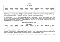 NAVY ($ in Millions) FY 2002 Actual 28,284.6* * Price Growth +581.5 Program Growth +238.5 FY 2003 Estimate 29,104.6 Price Growth +446.9 Program Growth -1,263.8 FY 2004 Estimate 28,287.7 Price Growth +747.5 Program Growth -197.8 FY 2005 Estimate 28,837.4 Includes funds from transfer accounts (e.g., Overseas Contingency Operations Transfer Fund; Drug Interdiction and Counterdrug Activities, Defense; and Environmental Restoration, Navy) The Operation and Maintenance, Navy (O&M,N) appropriation finances the day-to-day costs of operating naval forces, including fuel, supplies, and maintenance of ships, Navy and Marine Corps aircraft, related weapon systems, and the support establishment ashore. The primary focus of the Department's FY 2004 budget is to continue to ensure the readiness of deployed forces. The FY 2004 estimate of $28,287.7 million includes a price increase of $446.9 million. This price increase primarily results from increases in general inflation changes ($180.9 million), civilian pay raises ($155.4 million) and fuel costs ($72.0 million), and foreign currency ($44.3 million) offset by decreases in Working Capital Fund (WCF) rates costs ($-5.7 million). This budget reflects overall program decreases of $-1,263.8 million (-4.3 percent). Budget Activity 1: Operating Forces FY 2002 Actual 20,499.1 Price Growth +403.9 Program Growth -26.3 FY 2003 Estimate 20,876.8 ($ in Millions) Price Program Growth Growth +295.5 -1,137.6 FY 2004 Estimate 20,034.7 Price Growth +570.2 Program Growth -183.7 FY 2005 Estimate 20,421.2 The Operating Forces budget activity funds the Navy's air operations, ship operations, combat operations/support, and weapons support programs. Included in this budget activity are the costs associated with operating Navy shore bases to support these missions. Also included are the funds required to maintain combat ready forces necessary to respond to national objectives in joint, naval and combined operations. It supports the forward presence and crisis response capabilities of the National Military Strategy. The FY 2004 budget estimate of $20,034.7 million includes a price increase of $295.5 million and program decreases totaling $1,137.6 million (5.4 percent). Major program changes include: NAVY 26 NAVY · Air Operations increases by $321.2 million, including price growth of $152.2 million. Major program changes include increases in aviation depot level repairables (AVDLR) usage ($174.9 million), offset by decreases due to net changes in average Primary Authorized Aircraft ($-114.9 million), reduction in flying hour support ($-64.5 million), a reduction in the Fleet Air Training load plan ($-18.9 million); increased airframe maintenance and associated tasks ($107.6 million), increased aircraft engine overhauls/repairs ($94.1 million) and an increase in component repair requirements ($16.5 million), offset by a reduction in airframe Standard Depot Level Maintenance (SDLM) actions ($-16.6 million). · Ship Operations decrease of $543.2 million is comprised of $10.8 million in price growth offset by $554.0 million in program decreases. Program changes include: full year lease and operating costs of a high speed vessel ($11.4 million) offset by one-time FY 2003 outfitting costs ($-11.2 million), changes in MSC charters ($38.8 million), increases for post-COLE/9-11 port vulnerability assessments and phased replacement force protection costs ($10.2 million) and MSC force protection ($12.1 million), reduced operating and maintenance costs due to a decrease of 8 ship years and 87 operating months ($-59.7 million), increases to ensure Navywide compliance with federal environmental laws and regulations ($18.3 million), increases to AEGIS training and operational support ($10.4 million), net decrease in the number, scope and complexity of scheduled ship maintenance requirements ($-503.8 million) offset by a net increase in other ship maintenance requirements ($49.6 million) and increases due to mission funding Puget Sound Shipyard ($209.3 million); decreases in Fleet Modernization Program requirements, including LHA midlife and LPD sustainment ($-169.4 million), and decreases in berthing and messing ($-42.6 million) Ship Repair Facility, Yokosuka ($-14.4 million) and Enterprise Resource Program (ERP) ($-69.7 million) requirements. · Combat Operations and Support increases overall by $52.0 million, including net price increase of $22.5 million. The increases include funds for: prototype Standing Joint Force Headquarters ($24.5 million); Joint Urban Operations ($7.0 million); Combatant Commanders Theater C4 Modernization ($12.9 million); Training Transformation (Joint National training Capability) ($70.7 million); full funding for the Training Resource Strategy ($7.4 million); and the realignment of personnel, support costs and communications services from Servicewide Communications (4A6M) for the Naval Network Warfare Command ($15.7 million). Decreases in Combat Communications reflect the reduction in the purchase of commercial services for Challenge Athena ($-16.5 million). Decreases in Space Systems & Surveillance reflect the termination of four MSC leased T-AGOS ships and other reductions to the SURTASS and fixed surveillance systems ($-42.5 million) and the transfer of the Navy Space Surveillance Fence to the Air Force ($-21.0 million). The decrease in Operational Meteorology and Oceanography represents the deactivation of one oceanographic survey ship ($-7.7 million). Other reductions in Combat Operations and Support include the transfer of Joint Task Force – Civil Support to NORTHCOM ($-10.6 million) and reductions in contractor support ($-10.6 million). · Weapons Support increases overall by $48.1 million including price increase of $12.3 million. Major changes to the Cruise Missile program include a reduction in the number of certifications required for conventional missiles ($-10.7 million) and increases for TLAM-N certifications ($1.8 million) and post-production s