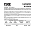March 25, 2005 Exchange Bulletin Volume 33, Number 12 The Constitution and Rules of the Chicago Board Options Exchange, Incorporated (“Exchange”), in certain specific instances, require the Exchange to provide notice to the Exchange membership. To satisfy this requirement, a complimentary copy of the Exchange Bulletin, including the Regulatory Bulletin, is delivered by hard copy or e-mail to all effective members on a weekly basis. CBOE members are encouraged to receive the Exchange and Regulatory Bulletin and Information Circulars via e-mail. E-mail subscriptions may be obtained by submitting your name, firm if applicable, mailing address, e-mail address, and phone number, to members@cboe.com, or, by contacting the Membership Department by phone, at 312-786-7449. There is no charge for e-mail delivery of the Exchange and Regulatory Bulletin or for Information Circulars. If you do sign up for e-mail delivery, please remember to inform the Membership Department of e-mail address changes. Additional subscriptions for hard copy delivery after the first complimentary copy may be obtained by submitting your name, firm if any, mailing address, e-mail address and telephone number to: Chicago Board Options Exchange, Accounting Department, 400 South LaSalle, Chicago, Illinois 60605, Attention: Bulletin Subscriptions. The cost of an annual subscription (July 1 through June 30) is $200.00 ($100.00 after January 1), payable in advance. The Exchange reserves the right to limit subscriptions by nonmembers. For up-to-date Seat Market Quotes, call 312-786-7456 or refer to CBOE.com and click “Seat Market Information” under the “About CBOE” tab. For access to the CBOE Member Web Site, please also notify the Membership Department by sending an e-mail to members@cboe.com or by phone at 312-786-7449. Copyright © 2005 Chicago Board Options Exchange, Incorporated SEAT MARKET QUOTES AS OF FRIDAY, MARCH 25, 2005 CLASS CBOE/FULL CBOT/FULL BID $400,000.00 $1,364,000.00 OFFER $418,000.00 $1,425,000.00 LAST SALE AMOUNT $415,000.00 $1,420,000.00 LAST SALE DATE March 18, 2005 March 23, 2005 MEMBERSHIP SALES AND TRANSFERS From Opcor, Incorporated To EWT, LLC Price/Transfer $415,000.00 Date 3/18/2005 Page 2 March 25, 2005 Volume 33, Number 12 Chicago Board Options Exchange MEMBERSHIP INFORMATION FOR 3/17/05 THROUGH 3/23/05 MEMBERSHIPAPPLICATIONS RECEIVED FOR WHICH A POSTING PERIOD IS REQUIRED Individual Membership Applicants Date Posted Bradley J. Hadraba, CBT Registered For Sparta Group of Chicago LP 11876 Windings Trail Drive Willow Springs, IL 60480 3/17/05 James P. McFadden, Nominee Group One Trading, LP 440 S. LaSalle, Ste. 3232 Chicago, IL 60605 3/18/05 Michael Sinoway, Nominee Group One Trading, LP 440 S. LaSalle - Suite 3232 Chicago, IL 60605 3/18/05 David R. Stec, Nominee Group One Trading, LP 440 S. LaSalle St. - Suite 3232 Chicago, IL 60605 Date Posted Optiver US, LLC Marcel V. Klooss, Nominee 440 S. LaSalle, Suite 1121 Chicago, IL 60605 Optra Curacao NV – Member Optiver Holding B.V. – Member Bastiaan van Kempen - Manager 3/17/05 MEMBERSHIP LEASES New Leases Effective Date Lessor: Merrill Lynch Professional Clearing Corp. Lessee: Cutler Group, LP Wyatt Unger, NOMINEE Rate: 0.875% Term: Monthly 3/17/05 3/18/05 Lessor: Burton F. Brooks Lessee: Cutler Group, LP Steven Lee, NOMINEE Rate: 0.875% Term: Monthly 3/17/05 Patrick R. Bruce, Lessee 200 Corbett Ave. San Francisco, CA 94114 3/22/05 Lessor: KISAY 1, LP Lessee: Samurai Trading, LLC David Piotrowski, NOMINEE Rate: 0.8281% Term: Monthly 3/18/05 Steve H. Kats, Nominee Bear Wagner Specialists LLC 14442 S. 87th Ave. Orland Park, IL 60462 3/22/05 Lessor: Essex Radez, LLC Lessee: Caesaron II Fund LP Stephen L. Silberman, NOMINEE Rate: 0.8281% Term: Monthly 3/21/05 Franz F. Paul, Nominee SLK-Hull Derivatives LLC 2124 N. Sedgewick St. Chicago, IL 60614 3/23/05 3/22/05 Member Organization Applicants Lessor: Paul D. Soderholm Lessee: Hybrid Trading & Resources, LLC Sean P. McKeough, NOMINEE Rate: 0.875% Term: Monthly Date Posted Terminated Leases Termination Date Lessor: Essex Radez, LLC Lessee: Sparta Group Of Chicago, LP Eric V. Ochotnicki (OZY), NOMINEE 3/17/05 Lessor: 3/17/05 Sydan LP 3/21/05 Daniel S. Curran, Nominee 440 S. LaSalle St., Suite 2301 Chicago, IL 60605 Curran Family Limited Partnership – Limited Partner Daniel S. Curran – Managing General Partner Carol S. Curran – Limited Partner Daniel S. Curran – Limited Partner Sydan LLC – General Partner Daniel S. Curran - Manager DND Trading, LLC 3/21/05 Daniel Thales, Nominee 60 Bacon Rd. Old Westbury, NJ 11568 Daniel T. Thaler – Managing Member Dina M. Rannazzi – Investing Memeber Roepe Rosenfeld Trading, LLC 3/21/05 Caleb Roepe, Nominee 117 Garth Road - 3E Scarsdale, NY 10583 Benjamin A. Rosenfeld – Managing Member Jonathon E. Roepe – Managing Member Andrew T. Roepe – Trading Member Caleb G. Roepe – Trading Member Daniel T. Thaler – Trading Member Rebecca A. Roeper – Investing Member Merrill Lynch Professional Clearing Corp. Lessee: TD Options, LLC Sergio Padilla (SRG), NOMINEE Lessor: Burton F. Brooks 3/17/05 Lessee: TD Options, LLC Anthony T. Capobianco (ITO), NOMINEE Lessor: TD Options, LLC 3/21/05 Lessee: Citigroup Global Markets Inc. Patrick V. Gleason (PVG), NOMINEE Lessor: Paul D. Soderholm 3/22/05 Lessee: Hybrid Trading & Resources, Inc. Sean P. McKeough (MCQ), NOMINEE Page 3 March 25, 2005 Volume 33, Number 12 Chicago Board Options Exchange MEMBERSHIP TERMINATIONS Effective Date Individual Members Nominee(s) / Inactive Nominee(s): Termination Date Michael N. Suarez (ILL) Citadel Derivatives Group LLC 131 S. Dearborn St., 37th Floor Chicago, IL 60603 3/17/05 Eric V. Ochotnicki (OZY) Sparta Group Of Chicago, LP 440 S. LaSalle, Ste. 2101 Chicago, IL 60605 3/17/05 Alfred C. Pollock IV (LKE) Cornerstone Partners 440 S. LaSalle - Ste. 2500 Chicago, IL 60605 3/21/05 Brandon S. Koress (BBK) Cornerstone Partners 440 S. LaSalle - Ste. 1900 Chicago, IL 60605 3/22/05 Ric