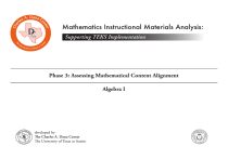 Mathematics Instructional Materials Analysis: Supporting TEKS Implementation Phase 3: Assessing Mathematical Content Alignment Algebra I Mathematics Instructional Materials Analysis: A Four Phase Process Phase 1: Studying the TEKS Phase 2: Narrowing the field of instructional materials Phase 3: Assessing mathematical content alignment In Phase 3, participants now conduct in-depth reviews of the materials selected in Phase 2. This deeper analysis allows for detailed documentation of the degree to which the materials are aligned with the TEKS. The Phase 3 process requires selection committee members to use the outlined criteria to determine a rating and to cite examples to justify their score. Additionally, this phase requires participants to document Knowledge and Skills statements and/or Student Expectations that were underemphasized or missing. Implementation Selection committee members should practice applying the Phase 3 rubric and documentation form to reach consensus on a single sample. Participants determine a starting point, such as a big idea within each strand, to be analyzed across the remaining resources, and then determine a method for aggregating and analyzing the data collected. Next, determine how individuals or small groups will be organized to carry out next steps; include a timeline. Materials and Supplies Phase 4: • Phase 3: Assessing Mathematical Content Alignment Blackline Master — multiple copies per person • The 2 to 4 instructional materials selected in Phase 2 Assessing vertical alignment of instructional materials © 2006, 2007, Charles A. Dana Center at The University of Texas at Austin Mathematics Instructional Materials Analysis: Phase 3 — Assessing Mathematical Content Alignment Phase 3: Assessing Mathematical Content Alignment Scoring Rubric and Documentation Form Understanding the Scoring of Important Mathematical Ideas Superficially Developed 1 Development Important mathematical ideas are applied in routine problems or in using formulated procedures, and are extended in separate / optional problems. © 2006, 2007, Charles A. Dana Center at The University of Texas at Austin 3 4 Important mathematical ideas are evident, conceptually developed, and emerge within the context of real-world examples, interesting problems, application situations, or student investigations. 2 Important mathematical ideas are developed independently of each other (i.e., they are discrete, independent ideas). 1 Rigor and Depth 2 Important mathematical ideas are alluded to simply or are missing, approached primarily from a skill level, or provided for students outside any context. 1 Connections Well Developed 3 4 Important mathematical ideas are developed by expanding and connecting to other important mathematical ideas in such a way as to build understanding of mathematics as a unified whole. 2 3 4 Important mathematical ideas are applied and extended in novel situations or embedded in the content, requiring the extension of important mathematical ideas and the use of multiple approaches. Mathematics Instructional Materials Analysis: Phase 3 — Assessing Mathematical Content Alignment Phase 3: Assessing Mathematical Content Alignment Scoring Rubric and Documentation Form Understanding the Scoring of Skills and Procedures Superficially Developed 1 Development 2 3 Skills and procedures are practiced without conceptual understanding outside any context, do not require the use of important mathematical ideas, and are primarily practiced in rote exercises and drill. © 2006, 2007, Charles A. Dana Center at The University of Texas at Austin 2 4 Skills and procedures are integrated with important mathematical ideas and are presented as important tools in applying and understanding important mathematical ideas. 3 Skills and procedures are treated as discrete skills rarely connected to important mathematical ideas or other skills and procedures. 1 Rigor and Depth 2 Skills and procedures are the primary focus, are developed without conceptual understanding, and are loosely connected to important mathematical ideas — important mathematical ideas are adjunct. 1 Connections Well Developed 4 Skills and procedures are integrated with—and consistently connected to— important mathematical ideas and other skills and procedures. 3 4 Skills and procedures are important to the application and understanding of important mathematical ideas, and are embedded in problem situations. Mathematics Instructional Materials Analysis: Phase 3 — Assessing Mathematical Content Alignment Phase 3: Assessing Mathematical Content Alignment Scoring Rubric and Documentation Form Understanding the Scoring of Mathematical Relationships Superficially Developed Development 1 2 Mathematical relationships are not required of students or are used primarily to provide a context for the practice of skills or procedures — words wrapped around drill. 1 Rigor and Depth 2 Mathematical relationships are not evident, and mathematics appears as a series of discrete skills and ideas. 1 Connections Well Developed 4 Mathematical relationships are evident in such a way as to build understanding of mathematics as a unified whole. 3 4 Mathematical relationships are integrated with important mathematical ideas, and are integral in required activities, problems, and applications. 2 Mathematical relationships require the use of skills and procedures, but rarely require the use of any important mathematical ideas or connections outside mathematics. © 2006, 2007, Charles A. Dana Center at The University of Texas at Austin 3 3 4 Mathematical relationships require the broad use of mathematics and integrate the need for important mathematical ideas, skills, and procedures, as well as connections outside mathematics. Mathematics Instructional Materials Analysis: Phase 3 — Assessing Mathematical Content Alignment Mathematics: Algebra I — Basic Understandings (1) Foundation concepts for high school mathematics. As presented in Gra