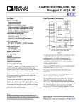 2-Channel, ±10 V Input Range, High Throughput, 24-Bit ∑-Δ ADC AD7732 FEATURES High resolution ADC 24 bits no missing codes ±0.0015% nonlinearity Optimized for fast channel switching 18-bit p-p resolution (21 bits effective) at 500 Hz 16-bit p-p resolution (19 bits effective) at 2 kHz 14-bit p-p resolution (18 bits effective) at 15 kHz On-chip per channel system calibration 2 fully differential analog inputs Input ranges +5 V, ±5 V, +10 V, ±10 V Overvoltage tolerant Up to ±16.5 V not affecting adjacent channel Up to ±50 V absolute maximum 3-wire serial interface SPI™, QSPI™, MICROWIRE™, and DSP compatible Schmitt trigger on logic inputs Single-supply operation 5 V analog supply 3 V or 5 V digital supply Package: 28-lead TSSOP FUNCTIONAL BLOCK DIAGRAM REFIN(–) AIN0(+) REFIN(+) REFERENCE DETECT BUFFER 24-BIT Σ−Δ ADC AIN0(–) MUX AD7732 AIN1(+) CS CALIBRATION CIRCUITRY AIN1(–) SERIAL INTERFACE SCLK DIN DOUT P0 SYNC/P1 I/O PORT CLOCK GENERATOR CONTROL LOGIC RESET RDY AGND AVDD MCLKOUT MCLKIN DGND DVDD Figure 1. APPLICATIONS PLCs/DCS Multiplexing applications Process control Industrial instrumentation GENERAL DESCRIPTION The AD7732 is a high precision, high throughput analog front end. True 16-bit p-p resolution is achievable with a total conversion time of 500 μs (2 kHz channel switching), making it ideally suitable for high resolution multiplexing applications. The differential reference input features “No-Reference” detect capability. The ADC also supports per channel system calibration options. The digital serial interface can be configured for 3-wire operation and is compatible with microcontrollers and digital signal processors. All interface inputs are Schmitt triggered. The part is specified for operation over the extended industrial temperature range of –40°C to +105°C. Other parts in the AD7732 family are the AD7734 and the AD7738. The part can be configured via a simple digital interface, which allows users to balance the noise performance against data throughput up to a 15.4 kHz. The AD7734 is similar to AD7732, but its analog front end features four single-ended input channels. The analog front end features two fully differential input channels with unipolar or true bipolar input ranges to ±10 V while operating from a single +5 V analog supply. The part has an overrange and underrange detection capability and accepts an analog input overvoltage to ±16.5 V without degrading the performance of the adjacent channels. The AD7738 analog front end is configurable for four fully differential or eight single-ended input channels, features 0.625 V to 2.5 V bipolar/unipolar input ranges, and accepts a common-mode input voltage from 200 mV to AVDD – 300 mV. The AD7738 multiplexer output is pinned out externally, allowing the user to implement programmable gain or signal conditioning before being applied to the ADC. Rev. A Information furnished by Analog Devices is believed to be accurate and reliable. However, no responsibility is assumed by Analog Devices for its use, nor for any infringements of patents or other rights of third parties that may result from its use. Specifications subject to change without notice. No license is granted by implication or otherwise under any patent or patent rights of Analog Devices. Trademarks and registered trademarks are the property of their respective owners. One Technology Way, P.O. Box 9106, Norwood, MA 02062-9106, U.S.A. Tel: 781.329.4700 www.analog.com Fax: 781.461.3113 ©2003–2011 Analog Devices, Inc. All rights reserved. AD7732 TABLE OF CONTENTS AD7732—Specifications.................................................................. 3 Digital Interface Description ........................................................ 22 Timing Specifications....................................................................... 6 Hardware ..................................................................................... 22 Absolute Maximum Ratings............................................................ 8 Reset ............................................................................................. 23 Typical Performance Characteristics ............................................. 9 Access the AD7732 Registers.................................................... 23 Output Noise and Resolution Specification................................ 10 Single Conversion and Reading Data ...................................... 23 Chopping Enabled...................................................................... 10 Dump Mode................................................................................ 24 Chopping Disabled..................................................................... 11 Continuous Conversion Mode ................................................. 24 Pin Configurations and Functional Descriptions ...................... 12 Continuous Read (Continuous Conversion) Mode .............. 25 Register Description....................................................................... 14 Circuit Description......................................................................... 26 Register Access............................................................................ 15 Analog Front End....................................................................... 26 Communications Register......................................................... 15 Analog Input’s Extended Voltage Range ................................. 27 I/O Port Register......................................................................... 16 Chopping ..................................................................................... 27 Revision Register ........................................................................ 16 Multiplexer, Conversion, and Data Output Timing ............. 28 Test Register ................................................................................ 16 Sigma-Delta ADC .................................
