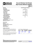 Very Low Distortion, Dual-Channel, High Precision Difference Amplifier AD8273 FEATURES FUNCTIONAL BLOCK DIAGRAM +VS ±4000 V HBM ESD Very low distortion 0.00025% THD + N (20 kHz) 0.0015% THD + N (100 kHz) Drives 600 Ω loads Two gain settings Gain of ½ (−6 dB) Gain of 2 (+6 dB) 0.05% maximum gain error 10 ppm/°C maximum gain drift Excellent ac specifications 20 V/μs minimum slew rate 800 ns to 0.01% settling time High accuracy dc performance 77 dB minimum CMRR 700 μV maximum offset voltage 14-lead SOIC package Supply current: 2.5 mA maximum per channel Supply range: ±2.5 V to ±18 V 11 12kΩ 6kΩ 2 12 13 12kΩ 6kΩ 12kΩ 6kΩ 3 14 10 6 9 6kΩ 8 4 –VS 06981-001 12kΩ 5 Figure 1. APPLICATIONS ADC drivers High performance audio Instrumentation amplifier building blocks Level translators Automatic test equipment Sine/cosine encoders GENERAL DESCRIPTION The AD8273 is a low distortion, dual-channel amplifier with internal gain setting resistors. With no external components, it can be configured as a high performance difference amplifier (G = ½ or 2), inverting amplifier (G = ½ or 2), or noninverting amplifier (G = 1½ or 3). The AD8273 operates on both single and dual supplies and only requires 2.5 mA maximum supply current for each amplifier. It is specified over the industrial temperature range of −40°C to +85°C and is fully RoHS compliant. Table 1. Difference Amplifiers by Category Low Distortion AD8270 AD8273 AD8274 AMP03 High Voltage AD628 AD629 Single-Supply Unidirectional AD8202 AD8203 Single-Supply Bidirectional AD8205 AD8206 AD8216 Rev. B Information furnished by Analog Devices is believed to be accurate and reliable. However, no responsibility is assumed by Analog Devices for its use, nor for any infringements of patents or other rights of third parties that may result from its use. Specifications subject to change without notice. No license is granted by implication or otherwise under any patent or patent rights of Analog Devices. Trademarks and registered trademarks are the property of their respective owners. One Technology Way, P.O. Box 9106, Norwood, MA 02062-9106, U.S.A. Tel: 781.329.4700 www.analog.com Fax: 781.461.3113 ©2008–2010 Analog Devices, Inc. All rights reserved. AD8273 TABLE OF CONTENTS Features .............................................................................................. 1 Pin Configuration and Function Descriptions..............................5 Applications....................................................................................... 1 Typical Performance Characteristics ..............................................6 Functional Block Diagram .............................................................. 1 Theory of Operation ...................................................................... 12 General Description ......................................................................... 1 Configurations............................................................................ 12 Revision History ............................................................................... 2 Power Supplies ............................................................................ 12 Specifications..................................................................................... 3 Outline Dimensions ....................................................................... 14 Absolute Maximum Ratings............................................................ 4 Ordering Guide .......................................................................... 14 Maximum Power Dissipation ..................................................... 4 ESD Caution.................................................................................. 4 REVISION HISTORY 8/10—Rev. A to Rev. B Changes to Data Sheet Title ............................................................ 1 Changes to THD + Noise (THD + N) Parameter, Gain Nonlinearity Parameter, and Offset vs. Power Supply Parameter, Table 2 ................................................................................................ 3 Changed −12A Pin to −INA Pin, +12A Pin to +INA Pin, +12B Pin to INB Pin, −12B Pin to −INB Pin, +6B Pin to REFB Pin, −6B Pin to SENSEB Pin, −6A Pin to SENSEA Pin, and +6A Pin to REFA Pin Throughout ................................................................ 5 Changes to Figure 3 and Table 4..................................................... 5 1/09—Rev. 0 to Rev. A Changes to Product Title, Features Section, and Applications Section................................................................................................ 1 Added Human Body Model (HBM) ESD Rating Parameter, Table 3 ................................................................................................ 4 Changes to Figure 6 to Figure 9 ...................................................... 6 Changes to Figure 10 to Figure 12.................................................. 7 Changes to Figure 18........................................................................ 8 Deleted Figure 31; Renumbered Sequentially ............................ 10 Added Figure 31 to Figure 33; Renumbered Sequentially ........ 10 Added Figure 34 to Figure 36........................................................ 11 1/08—Revision 0: Initial Version Rev. B | Page 2 of 16 AD8273 SPECIFICATIONS VS = ±15 V, VREF = 0 V, TA = 25°C, G = ½, RL = 2 kΩ, unless otherwise noted. Table 2. Parameter DYNAMIC PERFORMANCE Bandwidth Slew Rate Settling Time to 0.1% Settling Time to 0.01% Channel Separation NOISE/DISTORTION 1 THD + Noise (THD + N) Noise Floor, RTO 2 Output Voltage Noise (Referred to Output) GAIN Gain Error Gain Drift Gain Nonlinearity INPUT CHARACTERISTICS Offset 3 vs. Temperature vs. Power Supply Common-Mode Rejection Ratio Input Voltage Range 4 Impedance 5 Differential Common Mode 6 OUTPUT CHARACTERISTICS Output Swing Short-Circuit Current Limit Capacitive Load Drive Conditions Min 