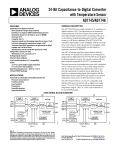 24-Bit Capacitance-to-Digital Converter with Temperature Sensor AD7745/AD7746 FEATURES GENERAL DESCRIPTION Capacitance-to-digital converter New standard in single chip solutions Interfaces to single or differential floating sensors Resolution down to 4 aF (that is, up to 21 ENOB) Accuracy: 4 fF Linearity: 0.01% Common-mode (not changing) capacitance up to 17 pF Full-scale (changing) capacitance range: ±4 pF Tolerant of parasitic capacitance to ground up to 60 pF Update rate: 10 Hz to 90 Hz Simultaneous 50 Hz and 60 Hz rejection at 16 Hz Temperature sensor on-chip Resolution: 0.1°C, accuracy: ±2°C Voltage input channel Internal clock oscillator 2-wire serial interface (I2C®-compatible) Power 2.7 V to 5.25 V single-supply operation 0.7 mA current consumption Operating temperature: –40°C to +125°C 16-lead TSSOP package The AD7745/AD7746 are a high resolution, Σ-Δ capacitance-todigital converter (CDC). The capacitance to be measured is connected directly to the device inputs. The architecture features inherent high resolution (24-bit no missing codes, up to 21-bit effective resolution), high linearity (±0.01%), and high accuracy (±4 fF factory calibrated). The AD7745/AD7746 capacitance input range is ±4 pF (changing), while it can accept up to 17 pF common-mode capacitance (not changing), which can be balanced by a programmable on-chip, digital-tocapacitance converter (CAPDAC). The AD7745 has one capacitance input channel, while the AD7746 has two channels. Each channel can be configured as single-ended or differential. The AD7745/AD7746 are designed for floating capacitive sensors. For capacitive sensors with one plate connected to ground, the AD7747 is recommended. The parts have an on-chip temperature sensor with a resolution of 0.1°C and accuracy of ±2°C. The on-chip voltage reference and the on-chip clock generator eliminate the need for any external components in capacitive sensor applications. The parts have a standard voltage input, which together with the differential reference input allows easy interface to an external temperature sensor, such as an RTD, thermistor, or diode. APPLICATIONS Automotive, industrial, and medical systems for Pressure measurement Position sensing Level sensing Flowmeters Humidity sensing Impurity detection The AD7745/AD7746 have a 2-wire, I2C-compatible serial interface. Both parts can operate with a single power supply from 2.7 V to 5.25 V. They are specified over the automotive temperature range of –40°C to +125°C and are housed in a 16-lead TSSOP package. FUNCTIONAL BLOCK DIAGRAMS VDD TEMP SENSOR CLOCK GENERATOR VDD VIN(+) VIN(–) MUX CIN1(+) CIN1(–) 24-BIT Σ-∆ MODULATOR TEMP SENSOR AD7745 DIGITAL FILTER I2C SERIAL INTERFACE SDA SCL CLOCK GENERATOR AD7746 VIN(+) VIN(–) MUX CIN1(+) CIN1(–) 24-BIT Σ-∆ MODULATOR DIGITAL FILTER I2C SERIAL INTERFACE SDA SCL CIN2(+) CIN2(–) CONTROL LOGIC CALIBRATION CAP DAC RDY RDY CAP DAC VOLTAGE REFERENCE EXCB REFIN(+) REFIN(–) GND Figure 1. EXC1 05468-001 EXCITATION VOLTAGE REFERENCE EXCITATION EXC2 REFIN(+) REFIN(–) GND Figure 2. Rev. 0 Information furnished by Analog Devices is believed to be accurate and reliable. However, no responsibility is assumed by Analog Devices for its use, nor for any infringements of patents or other rights of third parties that may result from its use. Specifications subject to change without notice. No license is granted by implication or otherwise under any patent or patent rights of Analog Devices. Trademarks and registered trademarks are the property of their respective owners. One Technology Way, P.O. Box 9106, Norwood, MA 02062-9106, U.S.A. Tel: 781.329.4700 www.analog.com Fax: 781.461.3113 © 2005 Analog Devices, Inc. All rights reserved. 05468-002 CAP DAC EXCA CONTROL LOGIC CALIBRATION CAP DAC AD7745/AD7746 TABLE OF CONTENTS Specifications..................................................................................... 3 Cap Gain Calibration Register.................................................. 19 Timing Specifications....................................................................... 5 Volt Gain Calibration Register ................................................. 19 Absolute Maximum Ratings............................................................ 6 Circuit Description......................................................................... 20 Pin Configurations and Function Descriptions ........................... 7 Overview ..................................................................................... 20 Typical Performance Characteristics ............................................. 8 Capacitance-to-Digital Converter ........................................... 20 Output Noise and Resolution Specifications .............................. 11 Excitation Source........................................................................ 20 Serial Interface ................................................................................ 12 CAPDAC ..................................................................................... 21 Read Operation........................................................................... 12 Single-Ended Capacitive Input................................................. 21 Write Operation.......................................................................... 12 Differential Capacitive Input .................................................... 21 AD7745/AD7746 Reset ............................................................. 13 Parasitic Capacitance to Ground.............................................. 22 General Call................................................................................. 13 Parasitic Resistance to Ground................................................. 22 Register Descriptions ..................................................................... 14 Parasitic Parallel Resistance ...................................................... 22 Status Register ...........