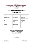 STAFF PERFORMANCE EVALUATION Name: Job Title: Date of Evaluation: Department/School: AAMU Hire Date: Time in Current Position (years/months): Unit: Type of Evaluation: Annual: Other: Rating Period: From:____________ To:______________ Supervisor: Years/months with Supervisor: Office of Human Resources Alabama A&M University Normal, AL 35762 Revised April 2011 Alabama A&M University Office of Human Resources Page 1 of 8 Staff Performance Evaluation Rev. June 2015 STAFF PERFORMANCE EVALUATION GENERAL INFORMATION To support a culture of personal and professional growth, the performance of each staff employee of the University, whether full-time or part-time, will be evaluated each year. Performance evaluations are part of the University’s goals of enhancing academic excellence and building a culture that values leadership and employee development. PURPOSE The purpose of Staff Employee Performance Evaluations is to inform employees of the quality of their work, to identify those areas needing improvement, set specific objectives for employee, and provide an opportunity to discuss career goals and the support needed to meet those goals. Performance evaluations also assist department heads and managers in evaluating their work force, identifying employee potential, and establishing priorities for training, education, and reward. ADMINISTRATIVE INSTRUCTIONS Each employee will be evaluated by the supervisor to whom the employee reports. In cases of multiple supervisors, the evaluation may be made by the supervisor who oversees the majority of the work or the department head may require separate and independent evaluations by each supervisor. As part of the performance evaluation, the supervisor and employee will review the Position Description or equivalent document that includes a list of essential functions and physical requirements of the position as well as notation of the employee’s Fair Labor Standard Act (FSLA) status. If no position description exists for a position, then contact the Office of Human Resources to receive assistance in preparing one. If the existing position description requires modification, then the employee and supervisor will draft and discuss proposed updates as needed. The signed and dated original or proposed revised Position Description must be sent to the Office of Human Resources for approval and final modification. THE PERFORMANCE EVALUATION MEETING The performance evaluation meeting will be held between the supervisor and employee as part of the evaluation procedure to ensure that the employee understands his or her duties, the performance standards and objectives established, and the areas requiring improvement. It is a time to share each person’s evaluation of the employee’s work over the past year and to discuss differences. It is also time to set goals for the next evaluation year or period. The employee and supervisor will each sign the evaluation form to indicate that a discussion of the document occurred. In addition, the employee will be given the opportunity to respond in writing to the oral and written evaluation. A copy of the evaluation is given to the employee and the original shall be forwarded to the Office of Human Resources to be kept in the employee's official personnel file. FOR MORE INFORMATION For additional information regarding the evaluation process, please contact the Office of Human Resources Note: This evaluation tool has been revised. Therefore, please read each section carefully. Alabama A&M University Office of Human Resources Page 2 of 8 Staff Performance Evaluation Rev. June 2015 I. PRIMARY RESPONSIBILITIES List your primary job responsibilities as it relates to your job description, University’s Quality Enhancement Plan (QEP), and NCAA Policies and Procedures and Compliance Issues (if applicable) (Additional sheets may be attached): II. ACCOMPLISHMENTS/ACHIEVEMENTS Describe accomplishments you have made during the rating period or since your last performance review. Examples of accomplishments include: achievement of goals set during the last review period, involvement in special projects, improvements made in performance, action taken to improve service or reduce costs, initiative taken to develop skills and the attainment of special licenses or certifications. You should also include accomplishments that are part of your regular job duties (additional sheets may be attached): III. PERFORMANCE CATEGORIES Using the rating scale described below, read each category and reflect on the employee’s performance of job responsibilities. Select the rating that you believe best matches the employee's actual performance. Any rating of NI or B requires comments and a plan for development to be attached to the evaluation. RATING SCALE E = Consistently exceeds expectations. Performance shows mastery of the skills and tasks involved and exceeds desired results. Performance is consistently excellent, and is characterized by major, outstanding achievements. M = Consistently meets expectations. Performance displays a level of competence. Performs a job with skills sufficient to achieve desired results to meet job requirements. Performance is consistently good. NI = Needs to improve. Performance in some areas is below acceptable levels and indicates room for improvement to meet goals and objectives. Performance is marginally satisfactory. B = Below Standards. Immediate performance improvement is needed. PD = Performance is developing. Improvement is needed to meet the goals and objectives on a consistent basis. (For employees on probation or in training on a new assignment or function.) Alabama A&M University Office of Human Resources Page 3 of 8 Staff Performance Evaluation Rev. June 2015 SUPERVISOR’S COMMENTS PERFORMANCE CATEGORY RATING Quality of Work: Accuracy, thoroughness, neatness and acceptance of finished product or service to meet expectations. Provide quality service to students, colleagues and the public. Productivity: Vol