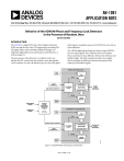 AN-1061 APPLICATION NOTE One Technology Way • P.O. Box 9106 • Norwood, MA 02062-9106, U.S.A. • Tel: 781.329.4700 • Fax: 781.461.3113 • www.analog.com Behavior of the AD9548 Phase and Frequency Lock Detectors in the Presence of Random Jitter by Ken Gentile INTRODUCTION The AD9548 is a digital PLL with a direct digital synthesizer (DDS) serving the role of the VCO appearing in an analog PLL. The digital nature of the AD9548 enabled the designers to implement digital phase lock and frequency lock detectors, as well (see Figure 1). The sole purpose of the detectors is to indicate to the user whether the PLL control loop has reached a state that signifies a lock condition. As such, the detectors play no role in the phase and frequency acquisition process of the PLL, but serve only as status indicators. The AD9548 digital phase/frequency detector logic (DPFDL) has two output signals. One comprises time error samples, which constitute the time difference between the reference and feedback edges. The other comprises period error samples, which constitute the difference between the periods of the reference and feedback signals. PHASE LOCK DETECTOR FILL RATE FILL BUCKET FILL LOCK THRESHOLD LOCKED LEVEL TIME ERROR SAMPLES FILL/DRAIN LOGIC BATHTUB PHASE LOCK INDICATOR UNLOCKED LEVE L DRAIN DRAIN BUCKET DRAIN RATE FEEDBACK SIGNAL DIGITAL PHASE FREQUENCY DETECTOR LOGIC (DPFDL) FREQUENCY LOCK DETECTOR FILL RATE FILL BUCKET FILL PERIOD ERROR SAMPLES LOCKED LEVEL FILL/DRAIN LOGIC LOCK THRESHOLD BATHTUB FREQUENCY LOCK INDICATOR UNLOCKED LEVE L DRAIN DRAIN BUCKET DRAIN RATE Figure 1. The AD9548 Phase and Frequency Lock Detectors Rev. 0 | Page 1 of 16 08813-001 REFERENCE SIGNAL AN-1061 Application Note TABLE OF CONTENTS Introduction ...................................................................................... 1 Purpose of the Application Note .................................................... 3 Simulation of a Sample Application: Synchronization to GPS (1 Pulse/Sec) .......................................................................................9 The Lock Detector Bathtub Analogy ......................................... 3 Overview ........................................................................................9 Lock Threshold Detail ................................................................. 3 Bathtub Level Simulation for Zero-Mean Jitter ........................9 Fill and Drain Rate Detail............................................................ 3 Bathtub Level Simulation for Jitter that is not Zero Mean ... 10 Generic PLL Lock Acquisition Process ......................................... 5 Bathtub Level Simulation for A Minimally Responsive Detector with Jitter that is not Zero Mean .............................. 11 Effect of Input Jitter on Choosing the Lock Threshold and Fill/Drain Rates ................................................................................. 7 Conclusion....................................................................................... 13 Lock Threshold vs. Jitter .............................................................. 7 Appendix: Normal (Gaussian) Distribution in the Context of Jitter .................................................................................................. 14 Fill and Drain Rate vs. Jitter ........................................................ 7 How to Adjust the Fill/Drain Ratio ............................................ 7 Rev. 0 | Page 2 of 16 Application Note AN-1061 PURPOSE OF THE APPLICATION NOTE The phase lock detector uses a 16-bit number to establish the phase lock threshold in units of picoseconds (ps). Suppose, for example, the input frequency to the DPFDL is 50 kHz and the expectation is that the phase lock detector should indicate lock when the DPFDL inputs are within 1° of alignment. The fact that the AD9548 detectors are digital provides the option of programmability, thereby making them extremely flexible compared to their analog counterparts. Taking advantage of this flexibility, however, requires an understanding of the relationship between the programming parameters (lock threshold, fill rate, and drain rate) and the jitter characteristics of the input signal, which is the purpose of this application note. This works out to a time difference of (1°/360°)/(50 × 103) = 55,556 ps Therefore, THE LOCK DETECTOR BATHTUB ANALOGY As described in the AD9548 data sheet, the detectors behave like a bathtub that has water either added with a fill bucket or removed with a drain bucket (see Figure 1). The tub can hold 4096 gallons of water and has a level mark at the ¼ and ¾ levels (−1024 and +1024 gallons, respectively, with 0 denoting ½ full). Whenever the water level in the tub reaches or exceeds ¾ full, the lock detector indicates locked. Conversely, whenever the water level in the tub drops to or below ¼ full, the lock detector indicates unlocked. During those times that the water level in the tub is between the ¼ and ¾ marks, the lock detector retains its previous indication (either locked or unlocked, as the case may be). The ¼ and ¾ marks provide the detectors with hysteresis so that their lock/ unlock output signal is less likely to chatter when the level in the tub is near the ¼ or ¾ mark. At the start of the PLL acquisition process, the tub starts out half full and the lock detector indicates unlocked. The fill bucket adds water whenever a sample (time error or period error) is within the lock threshold value. The drain bucket removes water whenever a sample is outside the lock threshold value. The lock threshold value is programmable, as is the size of the fill and drain bucket, via the fill rate and drain rate parameter, respectively. The bucket size is programmable in 1-gallon increments from 1 to 255 gallons. Note that the phase lock detector and frequency lock detector are identical, but have independent lock threshold, fill rate, and drain rate parameter