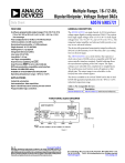 Multiple Range, 16-/12-Bit, Bipolar/Unipolar, Voltage Output DACs AD5761/AD5721 Data Sheet FEATURES GENERAL DESCRIPTION 8 software-programmable output ranges: 0 V to 5 V, 0 V to 10 V, 0 V to 16 V, 0 V to 20 V, ±3 V, ±5 V, ±10 V, −2.5 V to +7.5 V; 5% overrange Total unadjusted error (TUE): 0.1% FSR maximum 16-bit resolution: ±2 LSB maximum INL Guaranteed monotonicity: ±1 LSB maximum Single channel, 16-/12-bit DACs Settling time: 7.5 µs typical Integrated reference buffers Low noise: 35 nV/√Hz Low glitch: 1 nV-sec 1.8 V logic compatibility Asynchronous updating via LDAC Asynchronous RESET to zero scale/midscale DSP/microcontroller-compatible serial interface Robust 4 kV HBM ESD rating Available in 16-lead TSSOP and 16-lead LFCSP Operating temperature range: −40°C to +125°C The AD5761/AD5721 are single channel, 16-/12-bit serial input, voltage output, digital-to-analog converters (DACs). They operate from single supply voltages from 4.75 V to 30 V or dual supply voltages from −16.5 V to 0 V VSS and 4.75 V to 16.5 V VDD. The integrated output amplifier and reference buffer provide a very easy to use, universal solution. APPLICATIONS The devices available in the 16-lead TSSOP and in the 16-lead LFCSP offer guaranteed specifications over the −40°C to +125°C industrial temperature range. The devices offer guaranteed monotonicity, integral nonlinearity (INL) of ±2 LSB maximum, 35 nV/√Hz noise, and 7.5 µs settling time on selected ranges. The AD5761/AD5721 use a serial interface that operates at clock rates of up to 50 MHz and are compatible with DSP and microcontroller interface standards. Double buffering allows the asynchronous updating of the DAC output. The input coding is user-selectable twos complement or straight binary. The asynchronous reset function resets all registers to their default state. The output range is user selectable, via the RA[2:0] bits in the control register. Industrial automation Instrumentation, data acquisition Open-/closed-loop servo control, process control Programmable logic controllers Table 1. Pin-Compatible Devices Device AD5761R/AD5721R Description AD5761/AD5721 with internal reference FUNCTIONAL BLOCK DIAGRAM VREFIN VDD AD5761/AD5721 REFERENCE BUFFERS DVCC ALERT SDI SCLK SYNC SDO INPUT SHIFT REGISTER AND CONTROL LOGIC 12/16 INPUT REG DAC REG 12/16 12-BIT/ 16-BIT DAC RESET VOUT 0V TO 5V 0V TO 10V 0V TO 16V 0V TO 20V ±3V ±5V ±10V −2.5V TO +7.5V DNC DGND VSS LDAC AGND NOTES 1. DNC = DO NOT CONNECT. DO NOT CONNECT TO THIS PIN. 12640-001 CLEAR Figure 1. Rev. B Document Feedback Information furnished by Analog Devices is believed to be accurate and reliable. However, no responsibility is assumed by Analog Devices for its use, nor for any infringements of patents or other rights of third parties that may result from its use. Specifications subject to change without notice. No license is granted by implication or otherwise under any patent or patent rights of Analog Devices. Trademarks and registered trademarks are the property of their respective owners. One Technology Way, P.O. Box 9106, Norwood, MA 02062-9106, U.S.A. Tel: 781.329.4700 ©2015–2016 Analog Devices, Inc. All rights reserved. Technical Support www.analog.com AD5761/AD5721 Data Sheet TABLE OF CONTENTS Features .............................................................................................. 1 Register Details ............................................................................... 24 Applications ....................................................................................... 1 Input Shift Register .................................................................... 24 General Description ......................................................................... 1 Control Register ......................................................................... 24 Functional Block Diagram .............................................................. 1 Readback Control Register ....................................................... 26 Revision History ............................................................................... 2 Update DAC Register from Input Register ............................. 26 Specifications..................................................................................... 3 Readback DAC Register ............................................................ 26 AC Performance Characteristics ................................................ 5 Write and Update DAC Register .............................................. 27 Timing Characteristics ................................................................ 6 Readback Input Register............................................................ 27 Absolute Maximum Ratings............................................................ 8 Disable Daisy-Chain Functionality.......................................... 27 ESD Caution .................................................................................. 8 Software Data Reset ................................................................... 28 Pin Configurations and Function Descriptions ........................... 9 Software Full Reset ..................................................................... 28 Typical Performance Characterstics............................................. 10 No Operation Registers ............................................................. 28 Terminology .................................................................................... 20 Applications Information .............................................................. 29 Theory of Operation ...................................................................... 21 Typical Operating Circuit ......................................................... 29 Digital-to-Analog Converter .................................................... 21 Power Supply Considerations ................................................... 29 Transfer Function ........