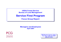 USDA USDAForest ForestService Service Bureau Bureauof ofLand LandManagement Management Service Service First First Program Program Focus FocusGroup GroupReport Report Managers and Employees April 2001 399 399Sherman ShermanAvenue, Avenue,Suite Suite11 Palo PaloAlto, Alto,California California94306 94306 (650) 327-8108 (650) 327-8108 Table of Contents • Report Summary 3 • Respondent Profiles 7 • Experience of Service First – Serving Customers – Personal Experience of the Work Environment 10 • Recommendations for Service First – Advice for Setting Up Service First – Most Important Improvement for Service First 26 • Appendix: Moderator’s Guide 35 Service ServiceFirst FirstProgram, Program,4/01 4/01 Table of Contents — 2 Table of Contents — 2 Report ReportSummary Summary Project Overview and Objectives • Project Objectives – To investigate whether the Service First program has been successful and if any changes are needed. – To learn how the program influences customer service. – To learn how the program influences employees’ personal work capabilities. • Methodology – Focus groups were organized in Lakeview, Oregon, and Canon City, Colorado. Four focus groups occurred in each location: one with managers from both agencies, one with BLM employees, one with Forest Service employees, and one with stakeholders. – The Forest Service and the Bureau of Land Management recruited participants from among the managers, employees, and stakeholders involved in the Service First program. – Pacific Consulting Group (PCG) conducted the Oregon focus groups on March 21st and March 22nd, 2001, and the Colorado focus groups on April 3rd and April 4th, 2001. – This report reflects PCG’s analysis of the managers’ and employees’ discussions. The stakeholders’ discussions will be presented in a separate report. Service ServiceFirst FirstProgram, Program,4/01 4/01 Report Summary — 4 Report Summary — 4 Report Highlights • Managers and employees from both the BLM and the Forest Service agree that Service First has improved the service they provide to external customers. – – – • Service to internal customers often is more difficult to provide. – – – • – • Employees are overwhelmed with the increased workload (not seen by all as a direct result of Service First). Differences in funding cycles between the two agencies create budgeting and staffing problems. BLM and Forest Service computer systems are incompatible, and their accounting systems differ greatly, which has a negative impact on employees’ work environment and on the service they provide their customers. Managers and employees involved in Service First genuinely enjoy working together. – – • By cutting down on multiple contacts and multiple permitting, service is more timely and efficient. Combined, the two agencies have more resources which they use to serve their customers better. However, differing laws, regulations, and policies across the two agencies sometimes have a negative effect on both external and internal customers. The two agencies have different ways of doing the same things, which is frustrating, but participants have learned how to use the two separate systems to their advantage. Many of them collaborated long before the formal establishment of Service First. Managers feel that their hiring options have expanded, since they now have a larger pool of qualified people from which to choose. All participants feel that this interagency experience is advantageous for their careers. However, while, people work well together at the local level, many of their collaborative efforts are blocked by upper management. A widespread feeling exists that the state, regional, and national offices are not promoting the Service First concept. Participants expressed concerns about how Service First and collaboration has affected their work environment. – – – – Employee policies and pay grades are different between the two organizations, which leads to resentment. Cultural differences between the agencies cause problems, especially higher up. Different practices and procedures regarding budgeting, accounting, and other financial issues cause many administrative problems. Employees don’t like the physical separation between themselves and their supervisors. They feel they don’t have enough access to managers from the other agency. Service ServiceFirst FirstProgram, Program,4/01 4/01 Report Summary — 5 Report Summary — 5 Summary of Recommendations • All participants feel that, conceptually, the Service First program is heading in the right direction. However, several barriers can prevent successful implementation. These issues must be addressed for Service First to succeed. – Involve employees in the planning and do not force collaboration • • • • – Managers and higher-ups need to support the idea of collaboration • • – • The physical space in which the employees work drives what they do. Collocation is an important step toward collaboration and full integration. Disperse BLM and Forest Service offices within shared buildings. In most instances, office space is still divided by the two agencies. Each agency should maintain its own identity • • – In order to get to the point where customers can do “one-stop shopping,” state and regional levels need to show more support for properly instituting the program. There needs to be more support from upper management. Most people at the local level are interested in collaborating with the other agency, but they feel that upper management blocks many of their efforts. Collocation and the layout of a shared building is important • – It’s extremely important to talk to employees and listen to their concerns. Don’t impose too much structure or too many expectations from above. Service First is most effective when the local employees have the freedom to do what they think is best for their cus