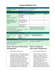Program Modification Form I Summary of Proposed Changes Parks, Tourism and Recreation Management Department/program Change in requirement to the major Summary II Endorsements and Approvals Please obtain the Program Chair/Director’s approval and Dean’s approval. Please type / print name Signature Requestor: Phone: Program Chair/Director: Keith Bosak 243-6062 Keith Bosak Department Dean Other affected Programs: Michael Patterson Dept. of Management and Marketing (Use additional sheet if needed) Date Health and Human Performance Are other departments/programs affected by this Please obtain signature(s) from the modification because of Chair/Director of any such department/ (a) required courses incl. prerequisites or corequisites, program (above) before submission (b) perceived overlap in content areas (c) cross-listing of coursework III Type of Program Modification (e.g. adding a writing course required of all majors.) Please X check the appropriate box. Major Minor Option Teaching major/minor X Other Please describe IV Catalog Language If you are proposing a change to an existing program or Please provide the proposed copy as you wish major, please cut and paste the requirements as they it to appear in the catalog. appear in the current catalog below. www.umt.edu/catalog Parks, Tourism, & Recreation Management Special Degree Requirements The B.S. in Parks, Tourism & Recreation Management degree is designed to prepare students for professional positions developing and managing nature-based recreation experiences and park resources for public land management agencies, nonprofit organizations, and the naturebased tourism industry. Students pursuing this degree must choose between an option in Recreation Resources Management or Nature-Based Tourism. The Recreation Parks, Tourism, & Recreation Management Special Degree Requirements The B.S. in Parks, Tourism & Recreation Management degree is designed to prepare students for professional positions developing and managing nature-based recreation experiences and park resources for public land management agencies, nonprofit organizations, and the nature-based tourism industry. Students pursuing this degree must choose between an Resources Management option provides the educational background necessary for evaluating and managing wild lands to protect their recreational, heritage, and ecological values. The Nature-Based Tourism option is designed to combine an understanding of social, cultural, political, environmental, and economic contexts surrounding tourism in a natural resource setting. All students learn the processes and conceptual skills needed to determine alternative management strategies, make management decisions, and carry out management programs. Included are courses leading to an understanding of the basic ecological characteristics of recreational lands. Students also take courses dealing with human behavior and management. Emphasis is placed on presenting problems that would be encountered while managing national parks and forests, state and regional parks, wilderness areas, and other recreation resources of international and national significance. Special Degree Requirements Students pursuing the B.S. in Parks, Tourism & Recreation Management degree complete the following courses (or their equivalent if transferred from another college or university). Transfer credits and course equivalency will be determined by the University and the College of Forestry and Conservation. In addition, students are required to take a practicum in Parks, Tourism & Recreation Management, PTRM 498 (RECM 460). This is a worklearning experience that involves at least 10 weeks full-time employment in a professional work environment. PTRM 498 (RECM 460) has a prerequisite of 400 previous hours of relevant work experience. Electives may be taken at any time, keeping in mind these courses as well as the University's General Education requirements for graduation. See also the graduation requirements for the College of Forestry and Conservation listed option in Recreation Resources Management or Nature-Based Tourism. The Recreation Resources Management option provides the educational background necessary for evaluating and managing wild lands to protect their recreational, heritage, and ecological values. The Nature-Based Tourism option is designed to combine an understanding of social, cultural, political, environmental, and economic contexts surrounding tourism in a natural resource setting. All students learn the processes and conceptual skills needed to determine alternative management strategies, make management decisions, and carry out management programs. Included are courses leading to an understanding of the basic ecological characteristics of recreational lands. Students also take courses dealing with human behavior and management. Emphasis is placed on presenting problems that would be encountered while managing national parks and forests, state and regional parks, wilderness areas, and other recreation resources of international and national significance. Special Degree Requirements Students pursuing the B.S. in Parks, Tourism & Recreation Management degree complete the following courses (or their equivalent if transferred from another college or university). Transfer credits and course equivalency will be determined by the University and the College of Forestry and Conservation. In addition, students are required to take an internship in Parks, Tourism & Recreation Management, PTRM 498 (RECM previously in the catalog. First Year Credits WRIT 101 (ENEX 101) College 3 Writing I BIOB 170N (BIOL 108N) Principles Biological Diversity or BIOE 172 (BIOL 121N) 3 Introductory Ecology or BIOO 105 Botany PSYX 100S (PSYC 100S) Introduction to Psychology or 4-3 SOCI 101 Into to Sociology 460). This is a work-learning experience that involves at least 10 weeks full-time employment in a professional work environment. PTRM 498 (RECM 460) has a prerequisite of