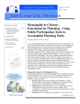 Center for Land Use Education V o lu m e 3 , I s s u e 3 W i n te r 20 03 T H E L A N D U S E T R AC K E R INSIDE THIS ISSUE: Meaningful to Citizens – Functional for Planning: Using Public Participation Tools to Accomplish Planning Tasks Cover CLUSTER Project 2 Economic Development Planning Guide Published 2 Watersheds and the Comprehensive Plan 6 Calendar Events Back Cover Meaningful to Citizens – Functional for Planning: Using Public Participation Tools to Accomplish Planning Tasks By Douglas Miskowiak, Project Planner Is your community getting what it needs from efforts to involve the public? Are your citizens satisfied with their opportunities to become involved in planning? When participation can be expensive and time consuming, citizens, planners, and local officials expect a return from the time or money they invest (Heberlein, 1974). Planners and local officials want participation to be functional for planning. They want participation to instill trust with citizens and want the community-plan to enjoy public acceptance. Citizens want their involvement to be meaningful. They want to influence the plan that ultimately affects their property and quality of life. Planners, officials, and citizens get what they want when the public is involved to accomplish planning tasks. This article is intended to help local officials and plan committee/commission members better understand the purpose for citizen involvement and how citizens can be productive for planning. Commissioners and officials may not be expected to create a public participation plan after reading this article, but will know better how to make public involvement functional for planning yet meaningful to citizens. Blueprint for Results: The Planning Process This site is the Center for Watershed Protection. http://www.cwp.org/ A typical planning process is much like a blueprint, and is a good place to begin when thinking about how to involve citizens. The plan process describes a set of stages to follow, a set of topics to cover, and a set of tasks to achieve, or products to create (see Insert). • Planning stages illustrate the broad path where planning is headed. Stages describe most generally what happens first, next, and last, such as setting goals, setting objectives, and forming strategies. • Planning issues are possible topics to cover. In Wisconsin, issues are called elements, and nine must be covered to consider a plan comprehensive. Natural resources, housing, and transportation are some examples of planning issues. • Planning tasks are assignments to accomplish to create a plan and are (See Plannng on page 3) Page 2 Volume 3, Issue 3 What’s New at the Center CLUE Staff On the web: click on “What’s New at the Center” on our homepage. Michael D. Dresen Center Director/Land Use Specialist Michael.Dresen@uwsp.edu CLUSTER: Creative Land Use Series for Teachers and Educator Resources Anna Haines Asst. Professor/Land Use Specialist Anna.Haines@uwsp.edu Land use environmental education is aimed at developing an understanding of the relationship between land use decisions and the environment, along with the realization that the way in which land is used directly affects the environment. The ultimate goal of CLUSTER, a Creative Land Use Series for Teachers and Educator Resources, is to make resources, lessons and materials readily available to teach land use environmental education. The project aims to assist in the education of the next generation in order to produce thoughtful, engaged citizens that will see the connection between land use and the environment and will be compelled to act. Through this process we will generate a responsible citizenry that can make educated and sustainable, local and global decisions about future land use. Lynn Markham Land Use Specialist Lynn.Markham@uwsp.edu Douglas Miskowiak Project Planner Doug.Miskowiak@uwsp.edu Rebecca Roberts Project Planner Rebecca.Roberts@uwsp.edu Chin-Chun Tang Project Planner Chin-Chun.Tang@uwsp.edu Robert Newby Office Manager Robert.Newby@uwsp.edu Affiliated faculty Alicia Acken Land Use Specialist, UW-River Falls alicia.acken@uwrf.edu Merritt Bussiere Land Use Specialist, UW-Green Bay merritt.bussiere@ces.uwex.edu Brian W. Ohm Assoc. Professor/Land Use Specialist UW-Madison, Urban & Regional Planning bwohm@facstaff.wisc.edu James H. Schneider Local Government Specialist UW-Madison Local Government Center jhschnei@facstaff.wisc.edu Kevin Struck Growth Management Educator Sheboygan and Washington Counties kevin.struck@ces.uwex.edu Susan Thering Asst. Professor/Extension Specialist UW-Madison—Landscape Architecture sathering@facstaff.wisc.edu CLUSTER Project The CLUSTER project is being designed to help educators integrate land use environmental education as a supplementary program that could be used in the social studies curriculum. This project is also meant to give educators, both traditional and non-traditional, a primary resource to use, build, and create a more comprehensive land use curriculum. This resource will contain the scope and sequence along with a lesson framework. The lesson framework will contain the, “lessons in a nutshell”, or an overview of a lesson, the process, the objectives, and the locations of available resources and materials. This resource can be an invaluable asset, especially to social studies teachers, because it shows how to work land use education into a social studies activity that will fulfill the mandatory compliance provided by the Wisconsin Model Academic Standards. http://www.uwsp.edu/landcenter/specialprojects/cluster/cluster.html. Economic Development Planning Guide Published This latest planning guide address Economic Development. The guide covers such issues as the need for economic development and planning for it and then delves into specific topics, such as organizational development, infrastructure, business development, workforce development, community cash flow, and regional collaboration. In ad