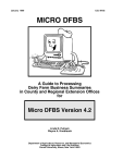 January 1999 E.B. 99-02 MICRO DFBS A Guide to Processing Dairy Farm Business Summaries in County and Regional Extension Offices for Micro DFBS Version 4.2 Linda D. Putnam Wayne A. Knoblauch Department of Agricultural, Resource, and Managerial Economics College of Agriculture and Life Sciences Cornell University, Ithaca, New York 14853 i TABLE OF CONTENTS Page INTRODUCTION ........................................................................................................................ 1 HARDWARE REQUIREMENTS................................................................................................ 1 VERSION 4.2 REVISIONS ......................................................................................................... 1 USING MICRO DFBS ................................................................................................................. 2 Installing Micro DFBS Version 4.2 .................................................................................. 2 Start the program............................................................................................................... 2 Enter the input data ........................................................................................................... 3 Verify the data................................................................................................................... 30 Calculate and print farm summary.................................................................................... 30 Check the diagnostics page............................................................................................... 32 Update or Display a record ............................................................................................... 32 Set New Screen Directory................................................................................................. 32 Delete a record .................................................................................................................. 33 Make backup copies of the data........................................................................................ 33 Make selected copy of the data......................................................................................... 33 Append farm files to database........................................................................................... 33 Exit ............................................................................................................................... 33 HINTS FOR INTERPRETING AND USING DAIRY FARM BUSINESS SUMMARY DIAGNOSTICS .......................................................... 49 APPENDIX A. HOW TO COMPLETE DFBS CHECK-IN FORMS ........................................ 61 APPENDIX B. DFBS DATA CHECK-IN FORM...................................................................... 74 APPENDIX C. PROCEDURE FOR CALCULATING SELECTED FACTORS ...................... 89 APPENDIX D. A LISTING OF DFBS FIELD NAMES ............................................................ 93 INTRODUCTION This publication is a guide to using the Microcomputer Dairy Farm Business Summary (Micro DFBS) computer program for analyzing the financial and production performance of individual dairy farm businesses. County Cooperative Extension educators are the intended audience, however, college faculty in other states may also find this publication of value. Farm business summary and analysis projects have long been a basic part of the agricultural Extension program in New York State. Records submitted by New York State dairy farmers provide the basis for many Extension educational programs and the data for applied research studies and classroom teaching. Extension offices have the capability to strengthen their dairy farm business analysis activities by calculating and printing the individual farm summaries for immediate use by the educator and farmer, at any time. After entry in the county, individual farm data are sent to the Department of Agricultural, Resource, and Managerial Economics at Cornell University for additional review prior to calculation of county, regional, and State summaries. HARDWARE REQUIREMENTS Version 4.2 of the Micro DFBS program will run on IBM and IBM-compatible computers with a 386 processor (or higher) with a minimum of 640K of random-access memory (RAM), 5 megabytes of free disk space, and at least one floppy disk drive. The WINDOWS 3.11 or higher operating system is needed. Printers vary from one Extension office to another, and an effort is made to make the program work with as many printers as possible. Most printers capable of printing 10 characters per inch and 66 lines per page should work. Micro DFBS version 4.2 uses the default printer specified in the Windows Print Manager. Each farm summary printout is 12 pages long and you typically need three copies -- one for the farmer, one for your county or regional Extension office file, and one to send to Cornell for the regional and State summaries. VERSION 4.2 REVISIONS Revisions made for Micro DFBS Version 4.2 include the following: 1. 2. 3. 4. 5. 6. 7. 1 If the average net worth for a farm is negative, then “NA” will be printed on pages 1 and 3 for the rates of return on equity capital. Current ratio, working capital, and working capital as a percentage of total expense have been added to the Balance Sheet Analysis on page 5. Debt coverage ratio has been added to the Repayment Analysis on page 8. Milk receipts net of milk marketing expense has been added to the Dairy Analysis on page 10. Operating expense ratio, interest expense ratio, and a depreciation expense ratio have been added to the Capital and Labor Efficiency Analysis on page 11. The annual cash flow worksheet on page 12 has been replaced with a three-year comparison of receipts and expenses on a per cow and per cwt. basis. The annual cash flow worksheet can be printed as optional output. The constant used for the value of unpaid family lab