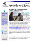 August 2014 ProFellows Digest On the Road and Around the World with American Professional Fellows The Professional Inside This Issue: ● Alumni Survey Highlights ● Snapshot: U.S. Hosts ● Regional Impact: -Africa -East Asia & Pacific -Europe -Mid East & N. Africa -South Central Asia -Western Hemisphere ● Media & Participant Blogs Fellows Division in ECA’s Office of Citizen Exchanges manages two-way global exchange programs for emerging leaders in their midtwenties and thirties. This two -way model is a distinguishing feature among ECA programs. Each year young professionals from around the world travel to the United States for month-long, project-focused exchanges, while American participants, many who hosted or mentored foreign Fellows, travel abroad to support project implementation, enhance their global understanding, and complement public diplomacy efforts at U.S. embassies around the world. In 2013, nearly 700 foreign leaders from more than 50 countries and all geo- Stay Connected and Join the Conversation: @ProFellows #ProFellows Friend Request “Pro Fellows” graphic regions participated in a Professional Fellows exchanges. These include: the Professional Fellows Program, focusing on Entrepreneurship, Governance, Civil Society, and Media; the Empower Program on disability rights advocacy; the U.S.- Pakistan Professional Partnership in Journalism; the Community Solutions Program; and a Professional Fellows On Demand Program focused on Media Law Reform in Burma. Nearly 400 Americans– business leaders, journalists, lawyers, representatives from municipal and State governments, NGO officials, university faculty, and administrators— also traveled abroad on reciprocal exchanges. The participation of American citizens adds a vital dimension to U.S. For more information, please contact Alana Rudkin (Rudkinab@state.gov) public diplomacy, helping to build long-term, sustainable partnerships between the U.S. and other countries. This edition of the ProFellows Digest recognizes the outstanding work and contributions our American alumni have made to the Department of State’ s strategic engagement with the world’s rising generation of leaders. Photo: Valerie Hamilton interviews a local Kenyan during outbound Professional Fellows Media exchange program with ICFJ. Alumni Survey Highlights Page 2 Impact highlights were taken from a survey of 200 American alumni who participated in the Professional Fellows Program between 2011 and 2013. Snapshot: 2013-2014 U.S. Host Organizations Page 3 38 U.S. States. 102 Cities. 348 Host Organizations. Special thanks to the 32 Members of Congress and State Representatives who have hosted and supported our Professional Fellows, including: Rep. Bill Batchelder (OH) Rep. Mike Curtin (OH) Rep. Tom Petri (WI) Rep. Chris Van Hollen (MD) Rep. Nick Collins (MA) Sen. Floyd Prozanski (OR) Rep. Danny Davis (IL) Rep. Nydia Velazquez (NY) Sen. Frank LaRose (OH) Rep. Gene Ward (HI) Rep. Ron Amstutz (OH) Sen. Jon Tester (MT) Rep. John Barnes, Jr. (OH) Rep. Rosa DeLauro (CT) Sen. Keith Faber (OH) Rep. Karen Awana (HI) Rep. Sean Duffy (WI) Sen. Lena Taylor (WI) Rep. Michael Stinziano (OH) Rep. Tim Walberg (MI) Sen. Maile Shimabukuro (HI) Africa Page 4 American Tech Leaders Partner with South African Counterparts to Establish new Innovation Center in Cape Town In July 2013, six American Professional Fellows from the Boston area traveled to South Africa to work in the technology sector with Fellows whom they had hosted in April. After two days in Johannesburg learning about South Africa’s history, culture, and its high-tech innovation economy, the American Fellows immersed themselves in the workplaces of their peers in Gauteng and the Western Cape. This productive two- week exchange, organized by Bentley University, deepened the Fellows’ friendships and cultural understanding while expanding their international networks. Four Professional Fellows— two Americans and two South Africans— took the next step towards a shared goal: the establishment of an innovation center in Cape Town modeled on Boston/Cambridge centers to provide support and attract capital for entrepreneurship in the high tech sector. Work on this project continued during the next round of exchanges in October 2013 and February 2014. The center is projected to open in Spring 2015. Photo: U.S. fellows meet with counterparts at the Center for Scientific and Industrial Research in Pretoria. American Journalists Explore African Media Practices in Kenya, Uganda, Nigeria, and Ghana American journalists Jacqueline Charles, Ryan Delaney, and Valerie Hamilton completed a two-week Professional Fellows Media exchange program in Kenya organized by the International Center for Journalists. The group shared best practices for investigative journalism with their African counterparts and broadened their knowledge of Kenya’s media landscape while working along-side their colleagues in-country. The American delegation had the opportunity to report in local slums with Professional Fellows Alumni Alphonce Shiundu and Joan Barsulai, opening their eyes to the challenges faced by millions of Kenyans living in these conditions. Other groups of American journalists took part in similar exchanges in Uganda, Nigeria, and Ghana. Check out the program’s Tumblr to read what the American journalists reported from the ground. Photo: Ryan Delaney reports in the Nairobi slum of Baba Dogo where two NGOs are working together to map environmental and other issues of concern for the community. East Asia & The Pacific Page 5 American CEO Helps Open First Thrift Shop in Vietnam, Creating Employment Opportunities for Persons with Disabilities Tony Cline, CEO of CorEnterprises in Billings, Montana, completed a two-week Professional Fellows exchange in Vietnam, administered by the University of Montana. Tony previously hosted Vietnamese Fellow Tran Thi Phuong, manager of Healing the Wounded Heart shop in Hue City, during a one-mon