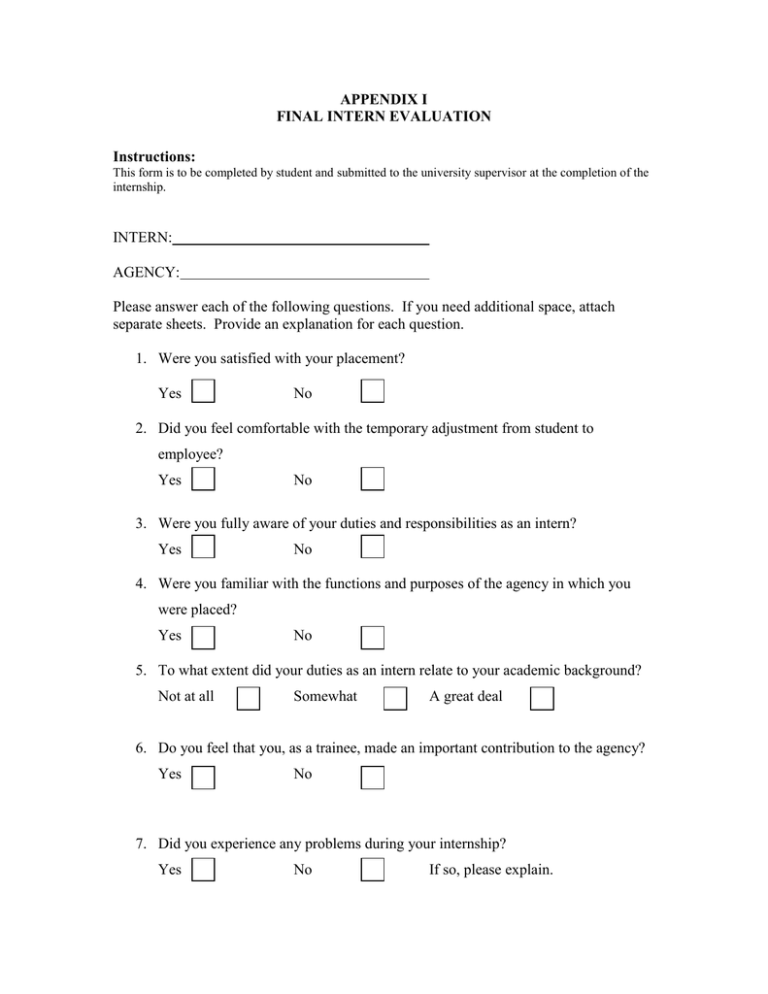 APPENDIX I FINAL INTERN EVALUATION Instructions: This form is to be completed by student and submitted to the university supervisor at the completion of the internship. INTERN: AGENCY: Please answer each of the following questions. If you need additional space, attach separate sheets. Provide an explanation for each question. 1. Were you satisfied with your placement? Yes No 2. Did you feel comfortable with the temporary adjustment from student to employee? Yes No 3. Were you fully aware of your duties and responsibilities as an intern? Yes No 4. Were you familiar with the functions and purposes of the agency in which you were placed? Yes No 5. To what extent did your duties as an intern relate to your academic background? Not at all Somewhat A great deal 6. Do you feel that you, as a trainee, made an important contribution to the agency? Yes No 7. Did you experience any problems during your internship? Yes No If so, please explain. 8. Did you feel free to discuss any problems with your agency supervisor? Yes No 9. Do you feel you were treated as a professional? Yes No 10. Were you allowed to make decisions on your own? Yes No 11. Were you responsible for providing your supervisor with written reports of your activities? Yes No 12. How would you rate your overall internship experience? Poor Average Excellent 13. Would you recommend this internship agency to other students? Yes No 14. Was this experience what you expected? Yes No 15. Was this experience worth the amount of college credit you are receiving for it? Yes No 16. Was the university supervision you received adequate? Yes No 17. How could the internship have been made more meaningful? 18. What could have been given more emphasis during your orientation on campus? At the agency? 19. Was there background information and skills that you now feel you should have had prior to your internship that you did not receive from the Sport Management Program? 20. What suggestions or recommendations can you offer for improvement of the overall experience at this agency? 21. In what ways do you feel this evaluation procedure could be improved? 22. Provide an overall assessment of your performance during the internship from both a professional and personal perspective. This assessment should include an evaluation of the overall quality of the tasks you performed; the areas in which you need improvement and how you can begin the improvement process; the impact the internship has had on your personal and professional growth; what insights in to the field of sport management have you acquired and/or refined. 23. May we transmit a copy of this information to the agency once your training is Completed? Yes No Signature Date