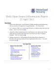 Daily Open Source Infrastructure Report 22 April 2013 Top Stories Storms in the Midwest have caused hundreds of flight cancellations and flooding along with an evacuation of a hospital due to rising floodwaters. – CNN (See item 5) A U.S. Senator’s office was evacuated and closed due to a suspicious letter delivered to the facility. – Detroit News (See item 26) Authorities in Boston implemented a city-wide lockdown so law enforcement officials could search for a second suspect believed to be involved in the April 15 marathon bombings. – NBC News (See item 35) Officials evacuated over 1,000 residents from the northern Illinois community of Marseilles after nine barges broke free from a tugboat and struck a levee. – Associated Press (See item 38) Fast Jump Menu PRODUCTION INDUSTRIES • Energy • Chemical • Nuclear Reactors, Materials, and Waste • Critical Manufacturing • Defense Industrial Base • Dams SUSTENANCE and HEALTH • Food and Agriculture • Water and Wastewater Systems • Healthcare and Public Health SERVICE INDUSTRIES • Financial Services • Transportation Systems • Information Technology • Communications • Commercial Facilities FEDERAL and STATE • Government Facilities • Emergency Services -1- Energy Sector Nothing to report [Return to top] Chemical Industry Sector Nothing to report [Return to top] Nuclear Reactors, Materials, and Waste Sector Nothing to report [Return to top] Critical Manufacturing Sector 1. April 19, Wall Street Journal – (National) Honda recalling more than 204,000 SUVs and Vans to fix shift mechanism. Approximately 204,169 of certain CR-V sportutility vehicles and Odyssey minivans from the 2012 and 2013 model years, and 2013 Acura RDX SUVs are being recalled by Honda Motor Co to fix a possible flaw in their brake-shift interlock mechanisms. Source: http://blogs.wsj.com/drivers-seat/2013/04/19/honda-recalling-more-than204000-suvs-and-vans-to-fix-shift-mechanism/ [Return to top] Defense Industrial Base Sector Nothing to report [Return to top] Financial Services Sector 2. April 18. SEC News – (Washington, D.C.) SEC charges Chicago-based investment adviser with defrauding CalPERS and other clients. The Securities and Exchange Commission charged the CEO of a Chicago-based investment advisory firm with lying about his investment holdings to attract institutional investors. The CEO agreed to be barred from the securities industry and pay several penalties. Source: http://www.sec.gov/news/press/2013/2013-64.htm?utm_source=feedly 3. April 18. ITN – (International) $15 million in counterfeit US bank notes seized in -2- Peru. Peruvian police seized $15 million in counterfeit bank notes along with one million fake euros and ten million Peruvian soles in a law enforcement operation. Source: http://www.itn.co.uk/World/73953/-15-million-in-counterfeit-us-bank-notesseized-in-peru 4. April 17. WWAY 3 Raleigh – (North Carolina) Wilmington attorney headed to prison for mortgage fraud. A Wilmington-based lawyer was sentenced April 17 to three years in prison for conspiracy to commit mail, wire, and bank fraud amongst other violations after he prepared HUD-1 settlement statements which falsified financing and down payment amounts, property contract price, and other items. The scheme led banks and lenders to issue loans to conspirators in the amount of approximately $15.8 million. Source: http://www.wwaytv3.com/2013/04/17/wilmington-attorney-headed-to-prisonfor-mortgage-fraud&utm_source=feedly [Return to top] Transportation Systems Sector 5. April 19, CNN – (National) Hospital, homes evacuated amid flood threats in Illinois, elsewhere. Severe storms in the Midwest have caused hundreds of flight cancellations and flooding, with one Illinois hospital evacuating patients due to rising floodwaters. Various roads and highways have also been inundated by flash floods around Illinois, Indiana, and elsewhere creating dangerous travel conditions. Source: http://www.cnn.com/2013/04/18/travel/weather/index.html 6. April 18, USA Today – (Illinois) Bad week to fly via O’Hare; cancellations top 2,400. A persistent stormy weather pattern and a computer outage affecting American Airlines operations April 17 prompted Chicago O’Hare International Airport to cancel over 2,400 flights in the past few days. Source: http://www.usatoday.com/story/todayinthesky/2013/04/18/storms-snarlchicago-ohare-flight/2092941/ 7. April 18, Travelers Today – (Florida) Miami International Airport evacuated due to lighter that looked like a grenade. Several security checkpoints at Miami International Airport were closed for 2 hours after authorities screened a suspicious item that turned out to be a cigarette lighter shaped like a grenade. Source: http://www.travelerstoday.com/articles/5890/20130418/miami-internationalairport-evacuated-due-lighter-looked-grenade.htm 8. April 18, KIRO 7 Seattle– (Washington) Alaska Airlines contractor fined for health violations. Bags, Inc., an Alaska Airlines contractor, was fined more than $12,000 for serious safety violations by the Washington Department of Labor and Industries for a number of serious safety violations. Source: http://www.kirotv.com/news/news/alaska-airlines-contractor-fined-healthviolations/nXQS9/ -3- 9. April 18, WOOD 8 Grand Rapids – (Michigan) Flooding washes out Ionia-area bridge. Heavy flooding caused Lincoln Avenue bridge over Bellamy Creek in Michigan to wash out due to rushing water. Other roads within the area were out of commission because of flooding. Source: http://www.woodtv.com/dpp/news/local/ionia_county/ionia-county-floodingeffects-041813 10. April 18, MLive.com – (Michigan) Bad weather leads to accidents, highway closures; flood warning in effect for Jackson County through Friday. A section of Interstate 94 near Mt. Hope in Grass Lake Township was closed for more than 4 hours April 18 after a semi-truck tipped over. Source: http://www.mlive.com/news/jackson/index.ssf/2013/04/bad_weather_leads
